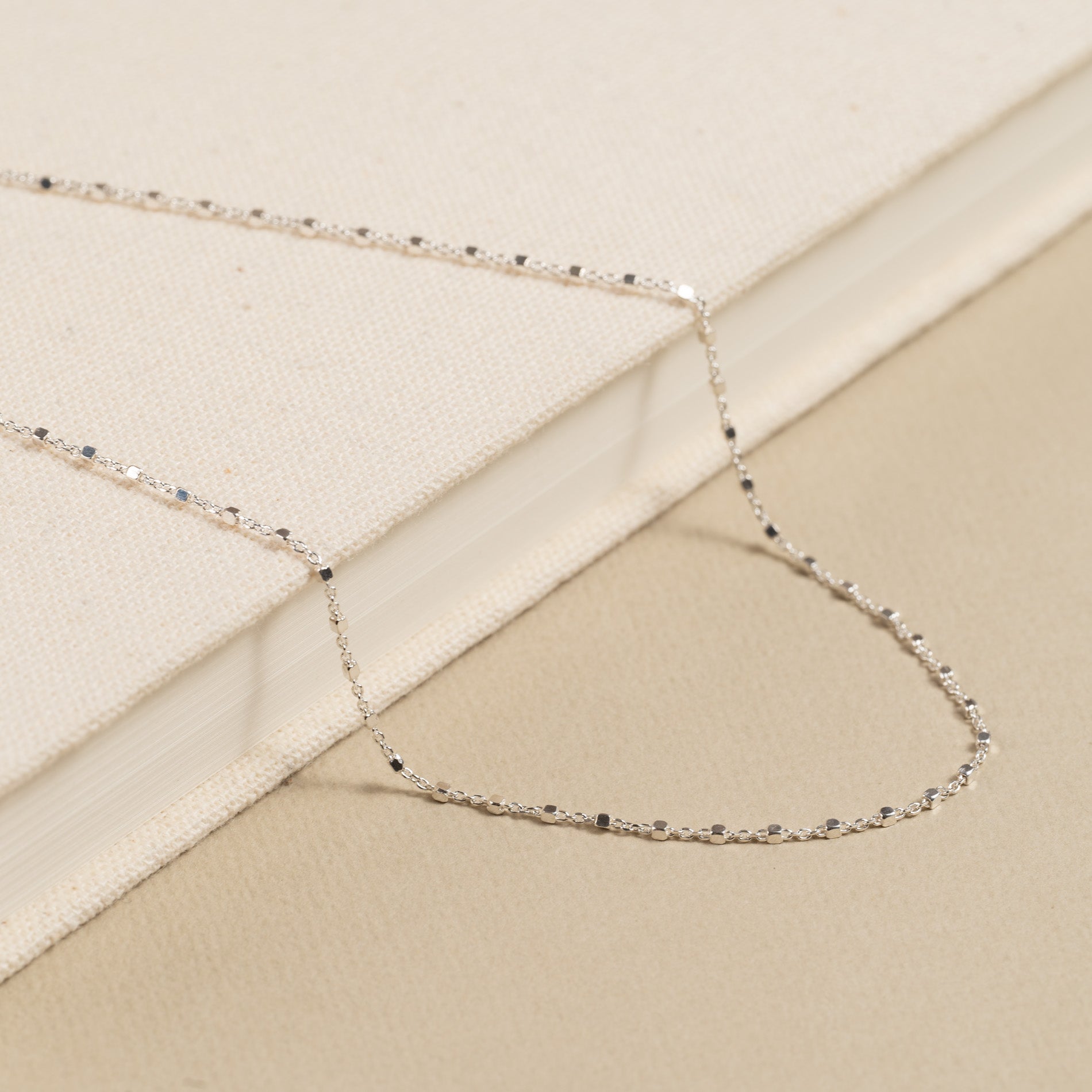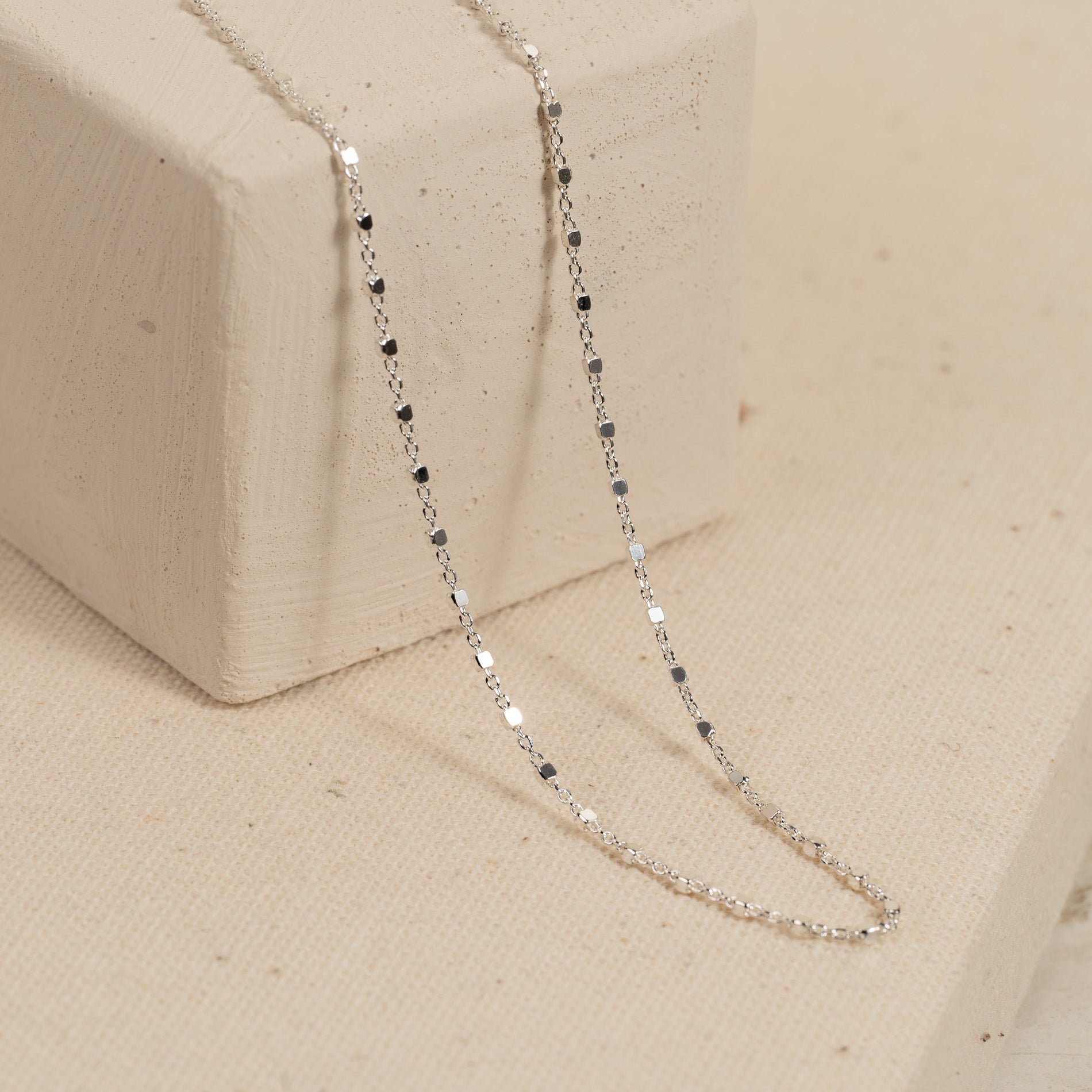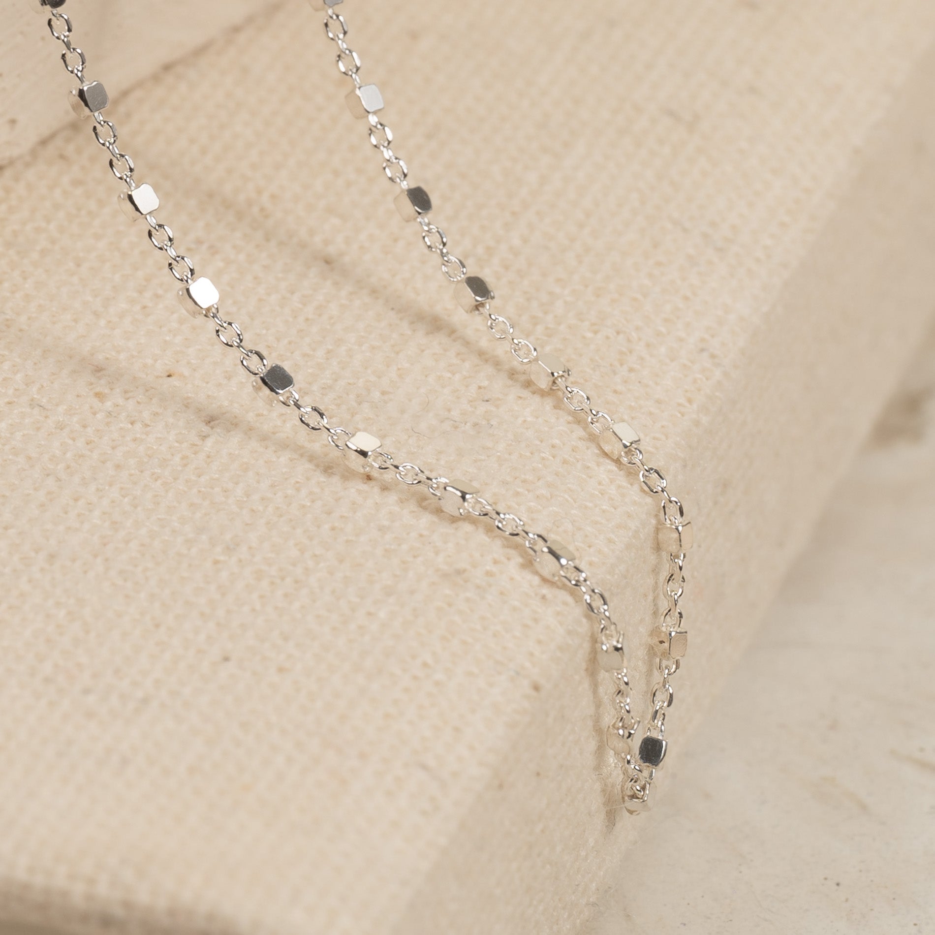The delicate Delta necklace is made of 100% recycled sterling silver. The chain is designed with small anchor links combined with a tiny square link, which makes the bracelet feminine, adds unique details, and creates a delicate pattern. The small cubes have polished sides that make light reflections on the chain almost sparkle.