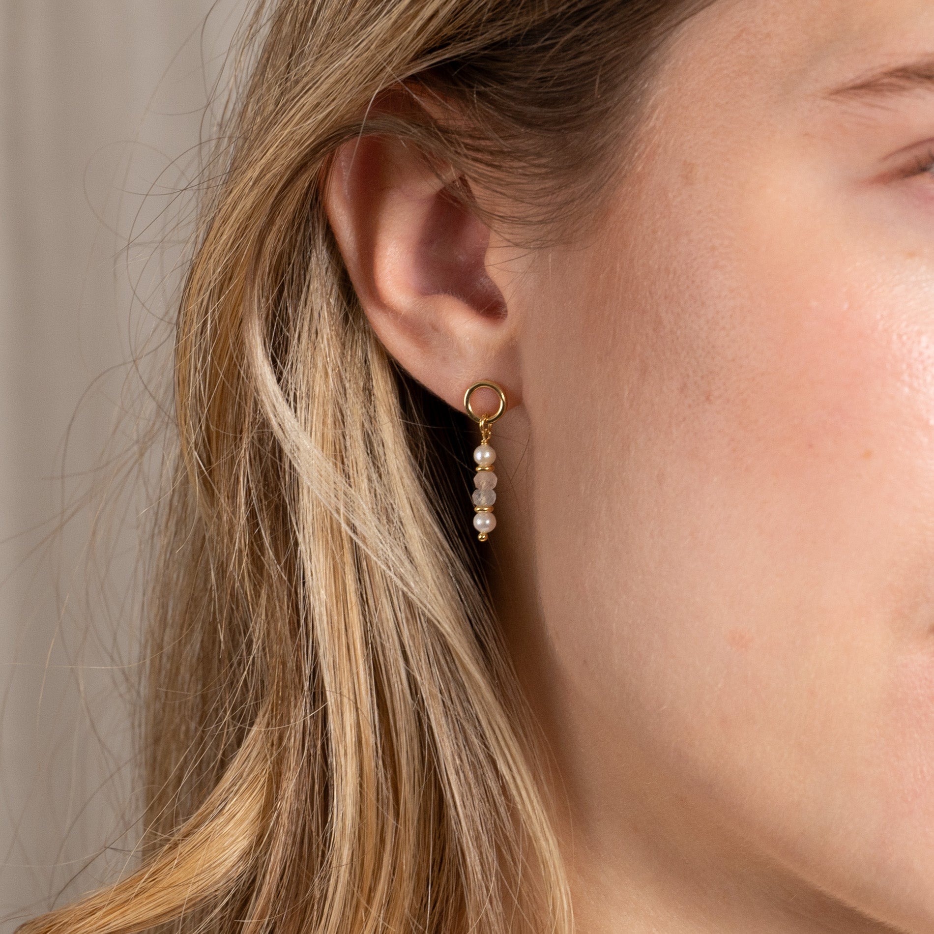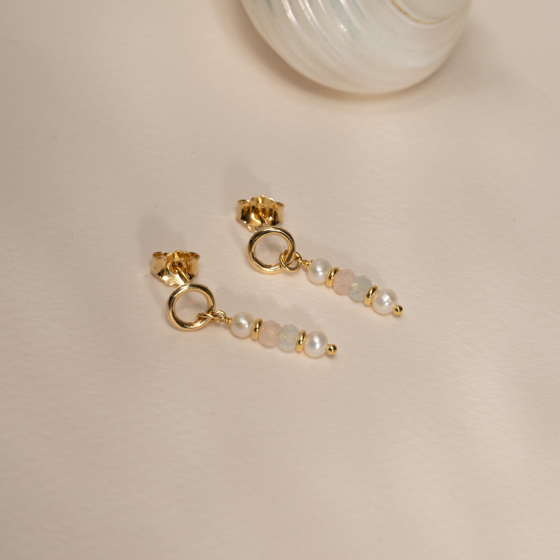 Earrings made from 100% recycled 18-carat gold-plated sterling silver with round white freshwater pearls and morganite stones in beautiful, light pastel colors.