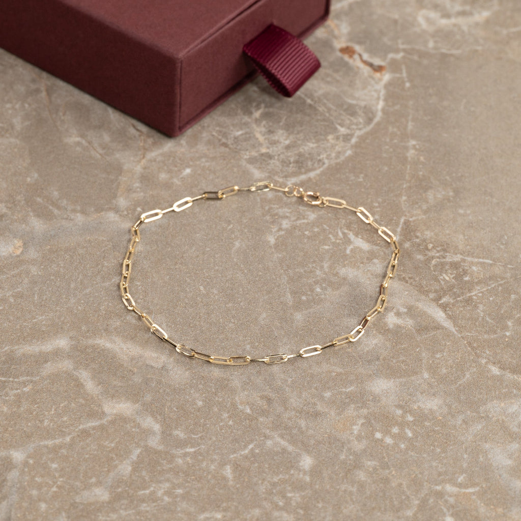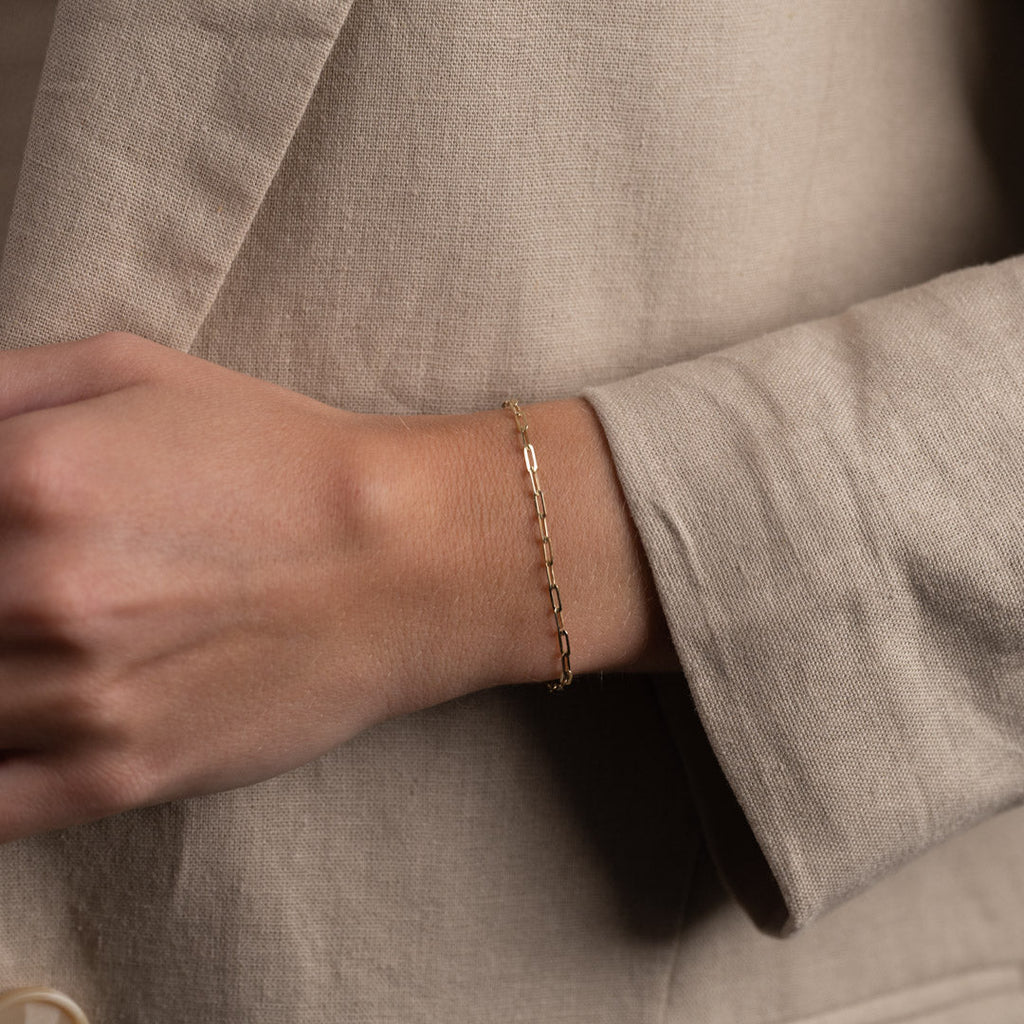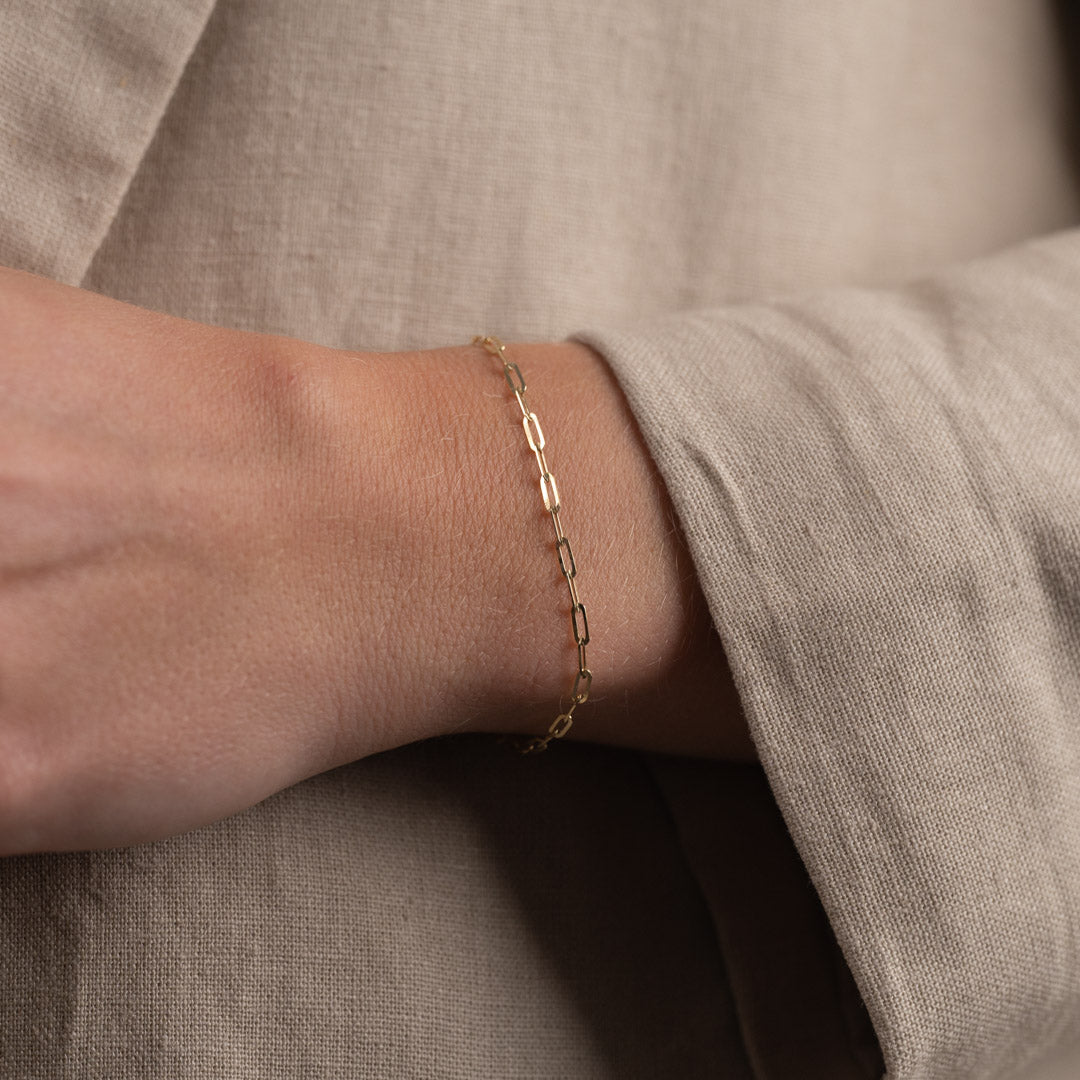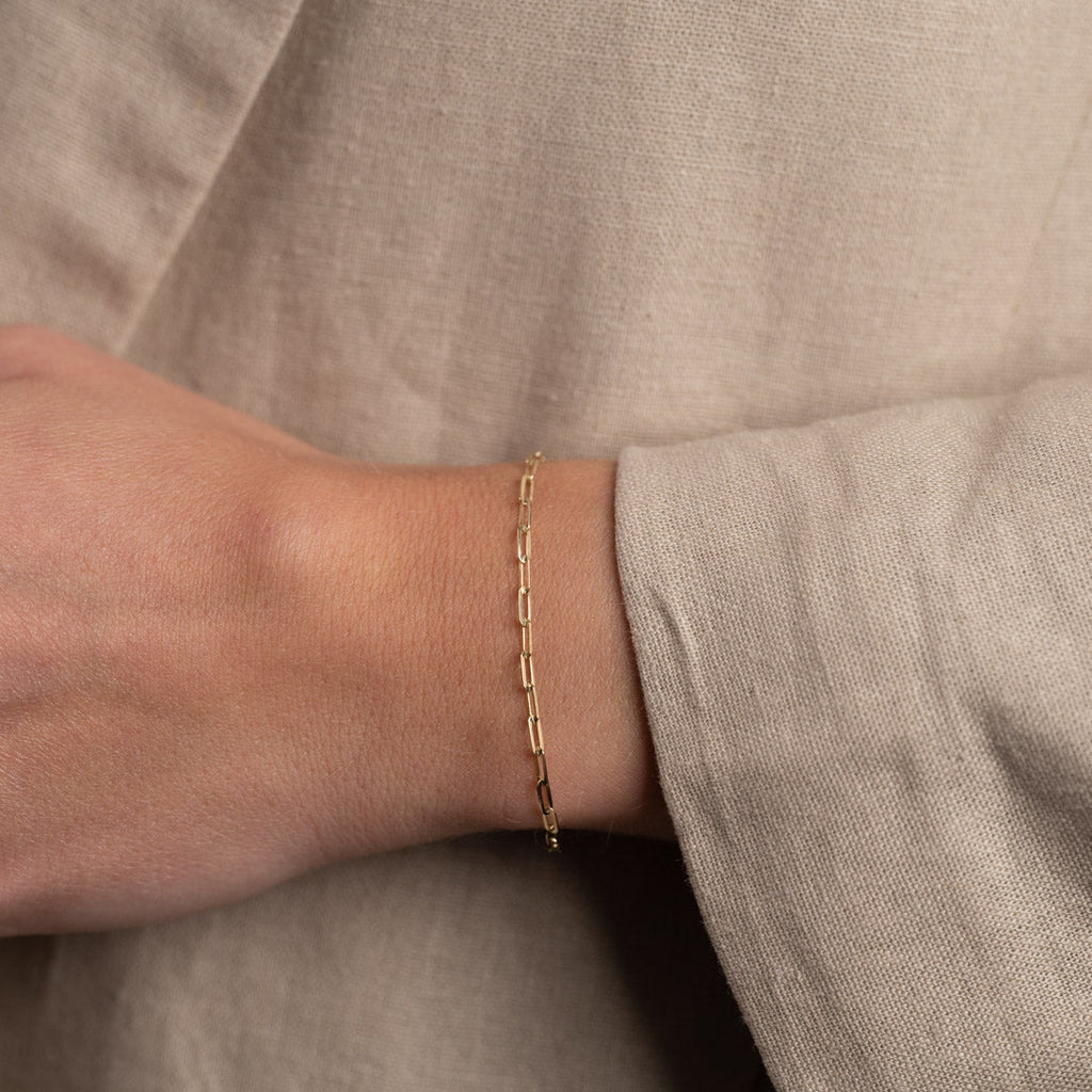 The Alma Medium gold bracelet is made of 100% recycled solid 9 carat gold. The bracelet is made as a 'paperclip' chain.