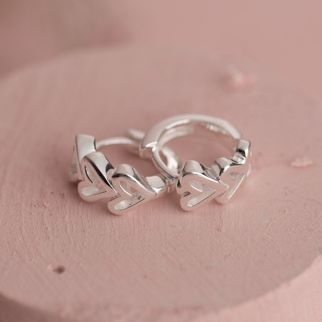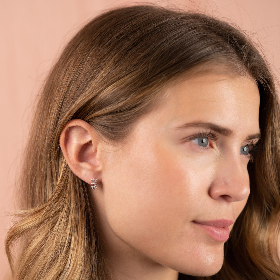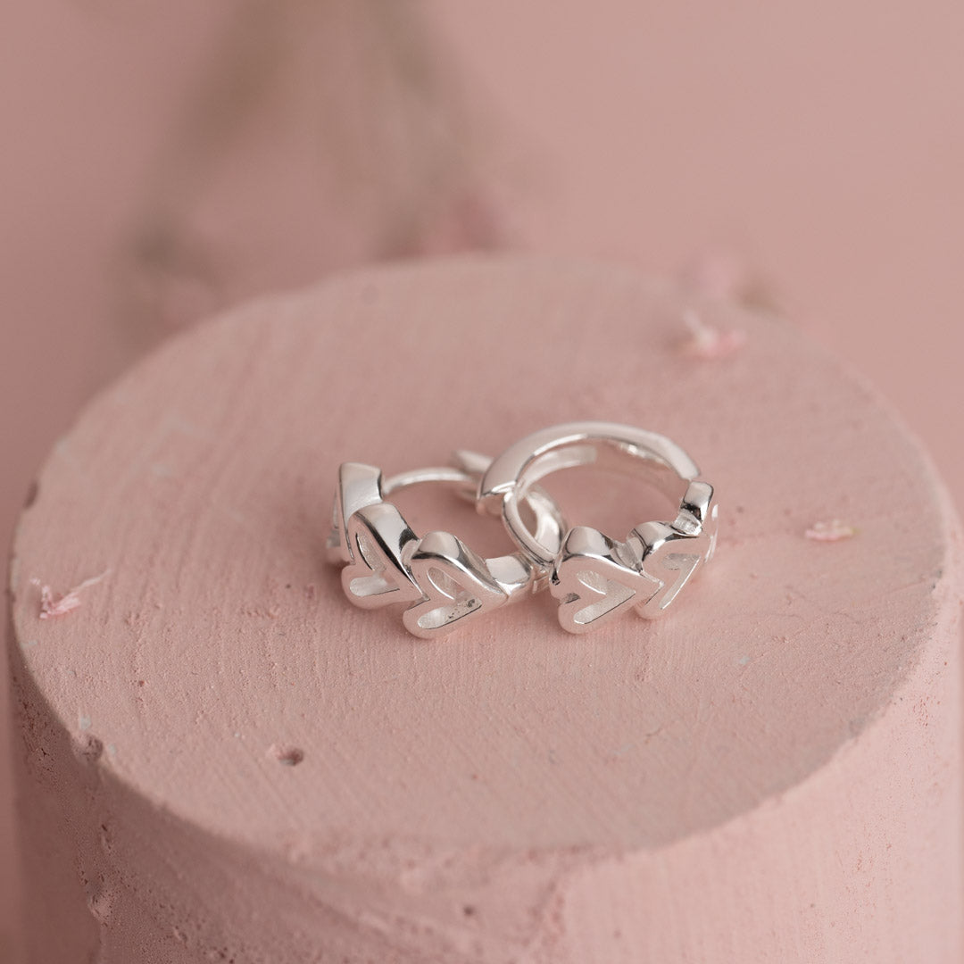The beautiful huggie embrace the earlobe with three cute hearts along the front. The design is simple and feminine, perfect for any occasion.