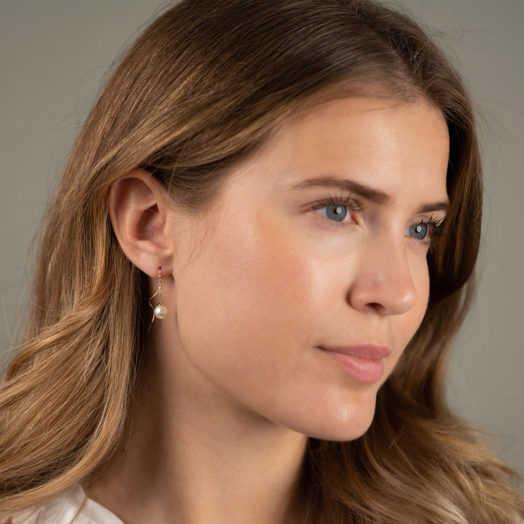 Earring made of 100% recycled solid 9 carat gold with a round white freshwater pearl. The beads measure approx. 7-7.5 mm.