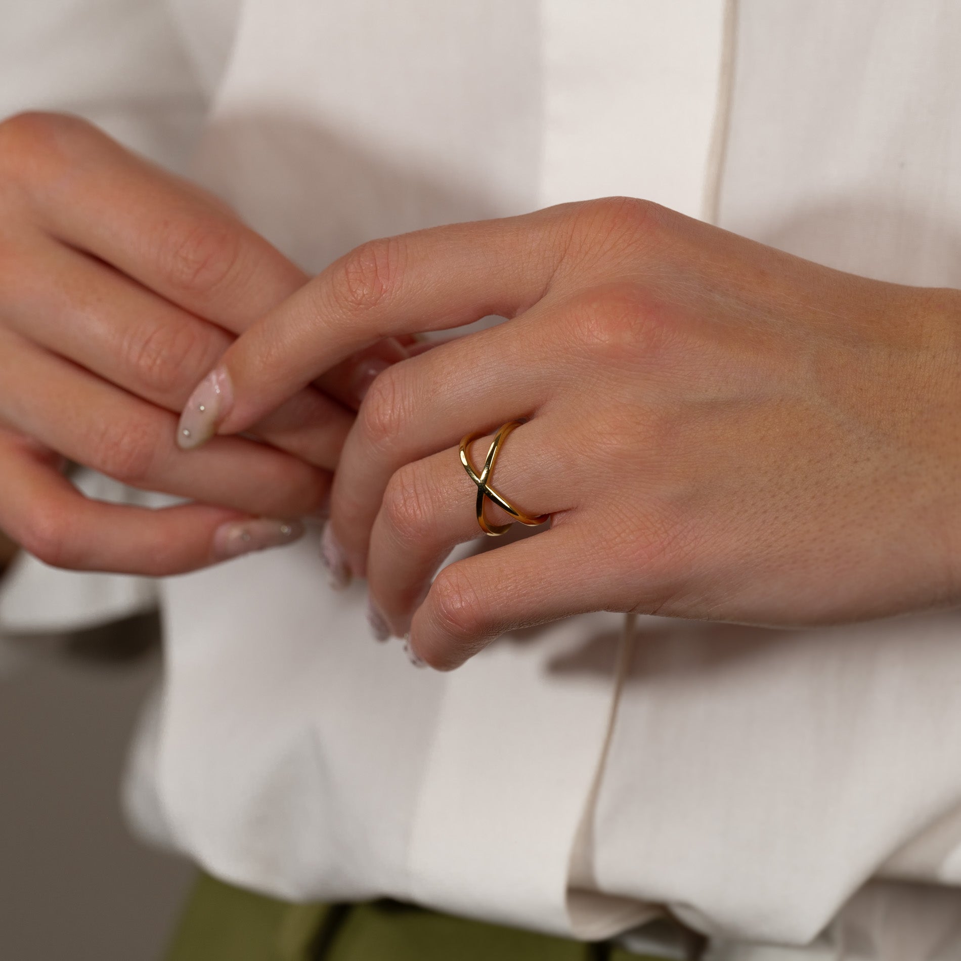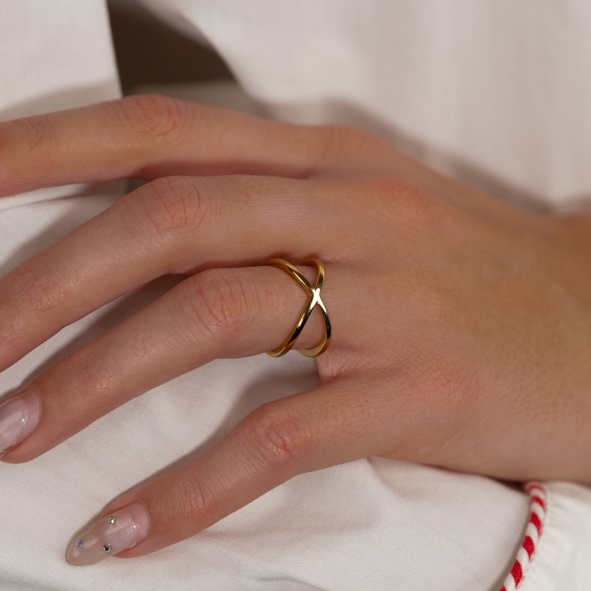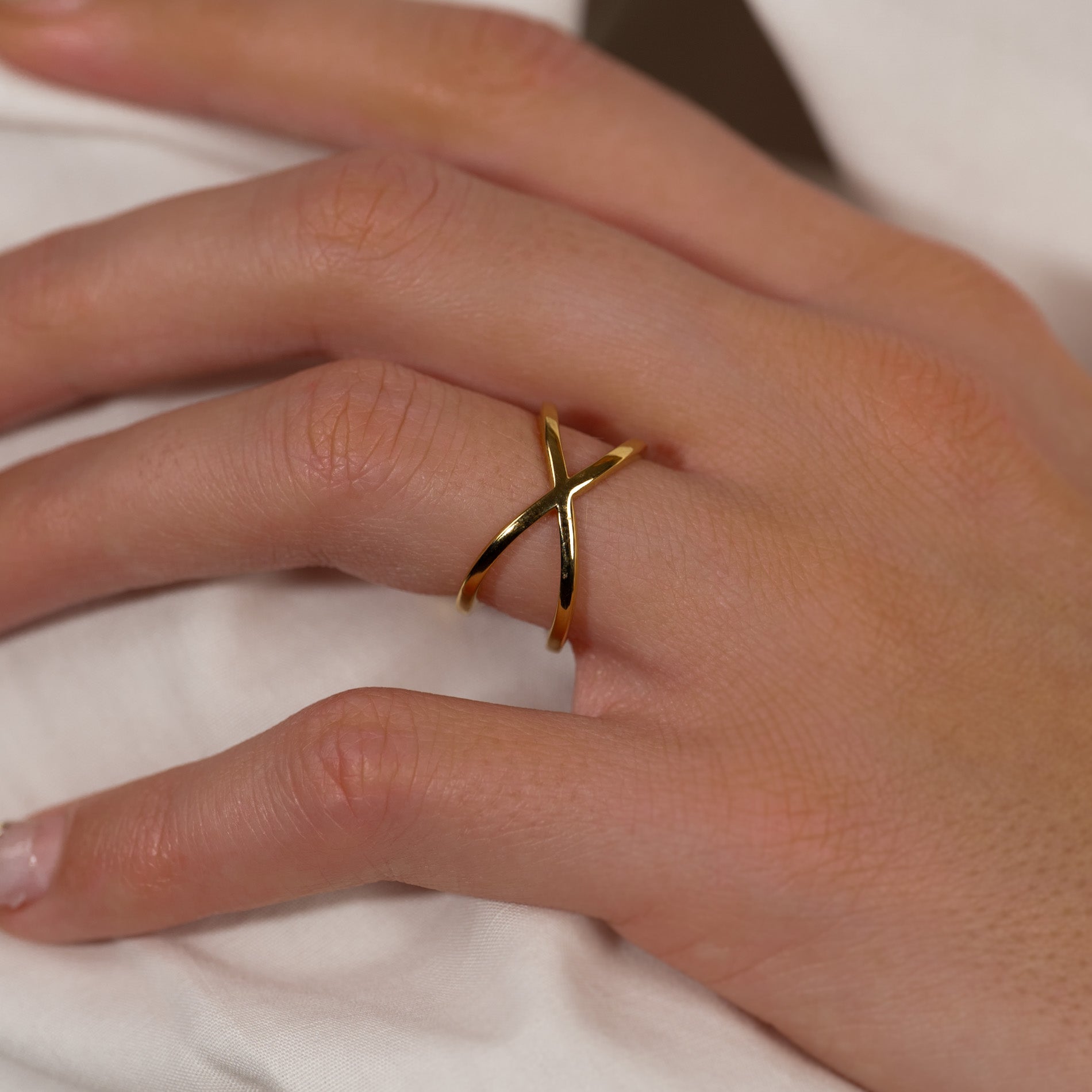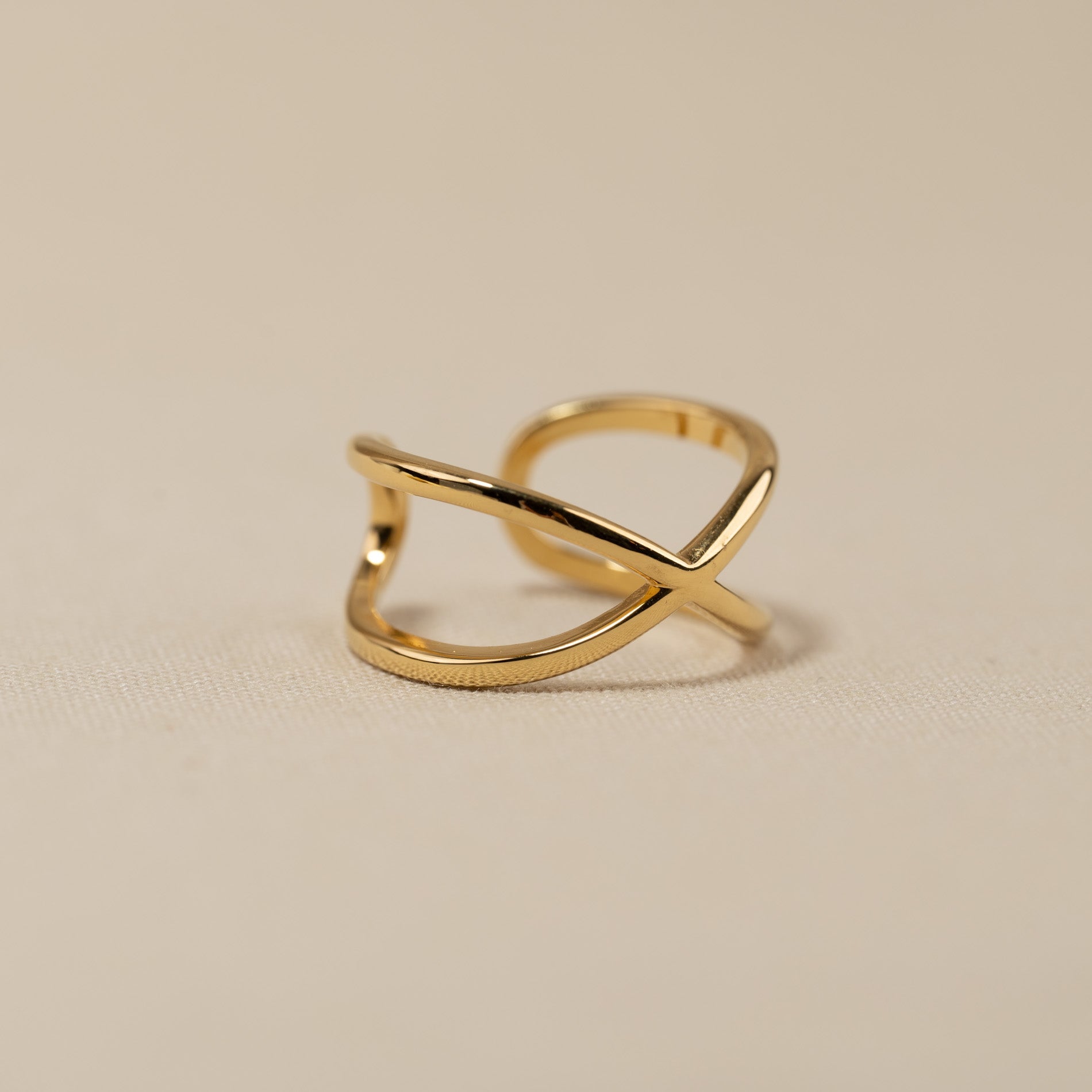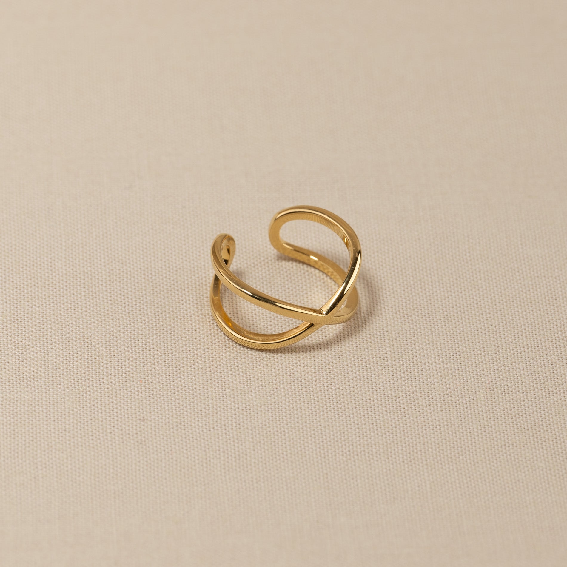 Unser Anastasia Ring hat ein minimalistisches Design, das leicht und schlicht ist. Der Ring besteht aus einem langen Band, das sich auf der Vorderseite kreuzt und auf der Rückseite ein flexibles Design bildet. Der Ring kann daher vorsichtig in der Größe verstellt werden.