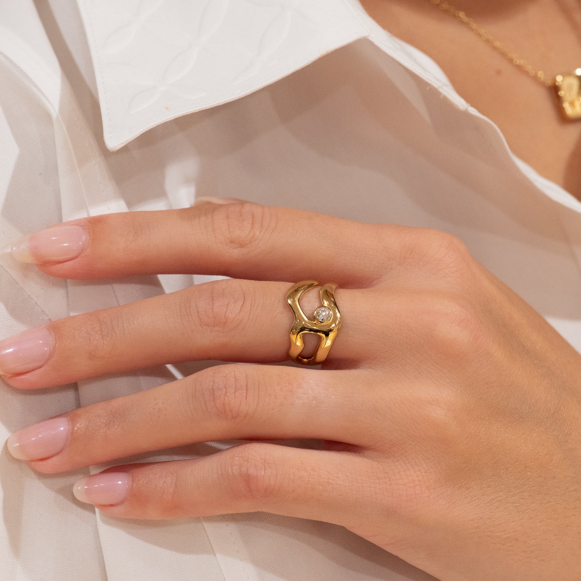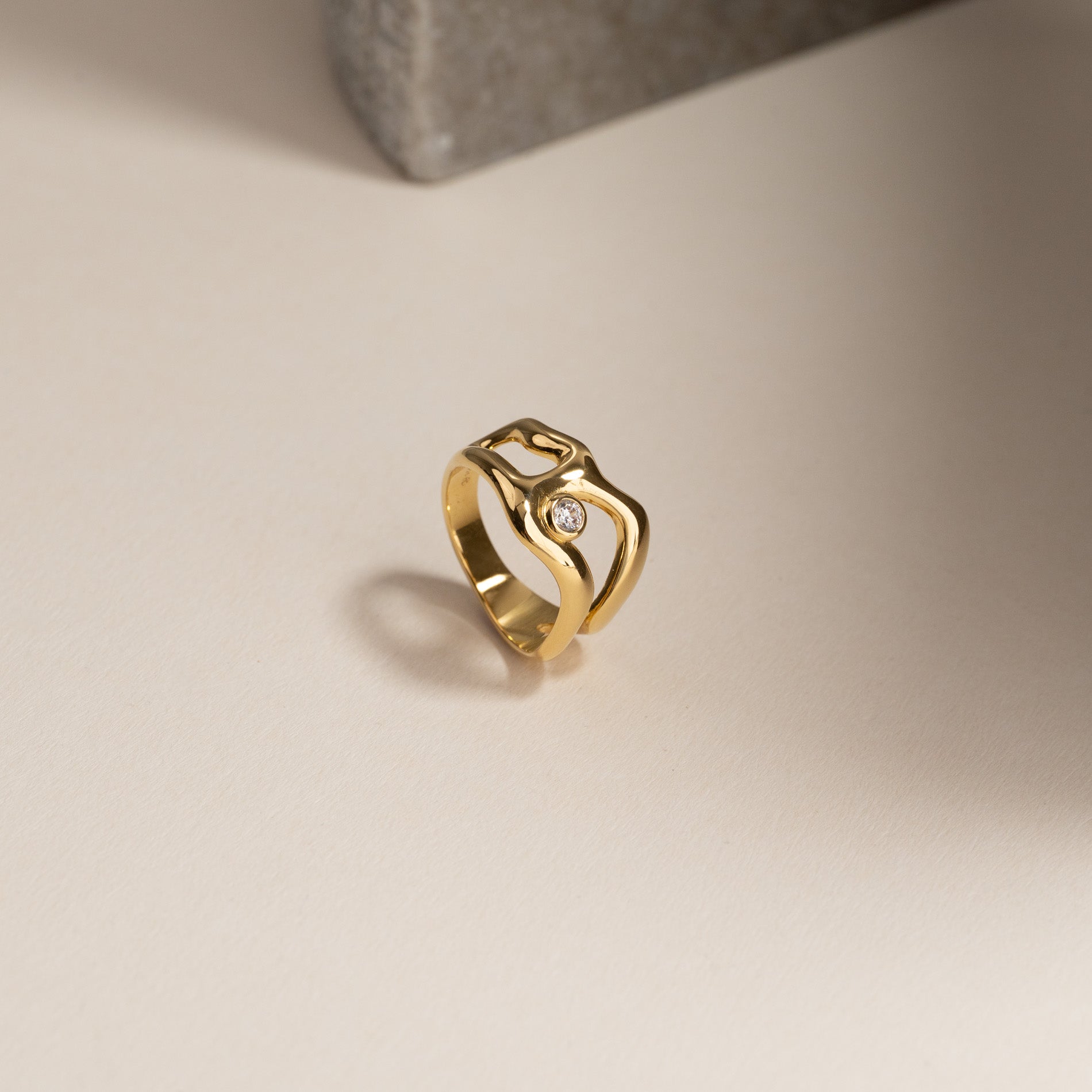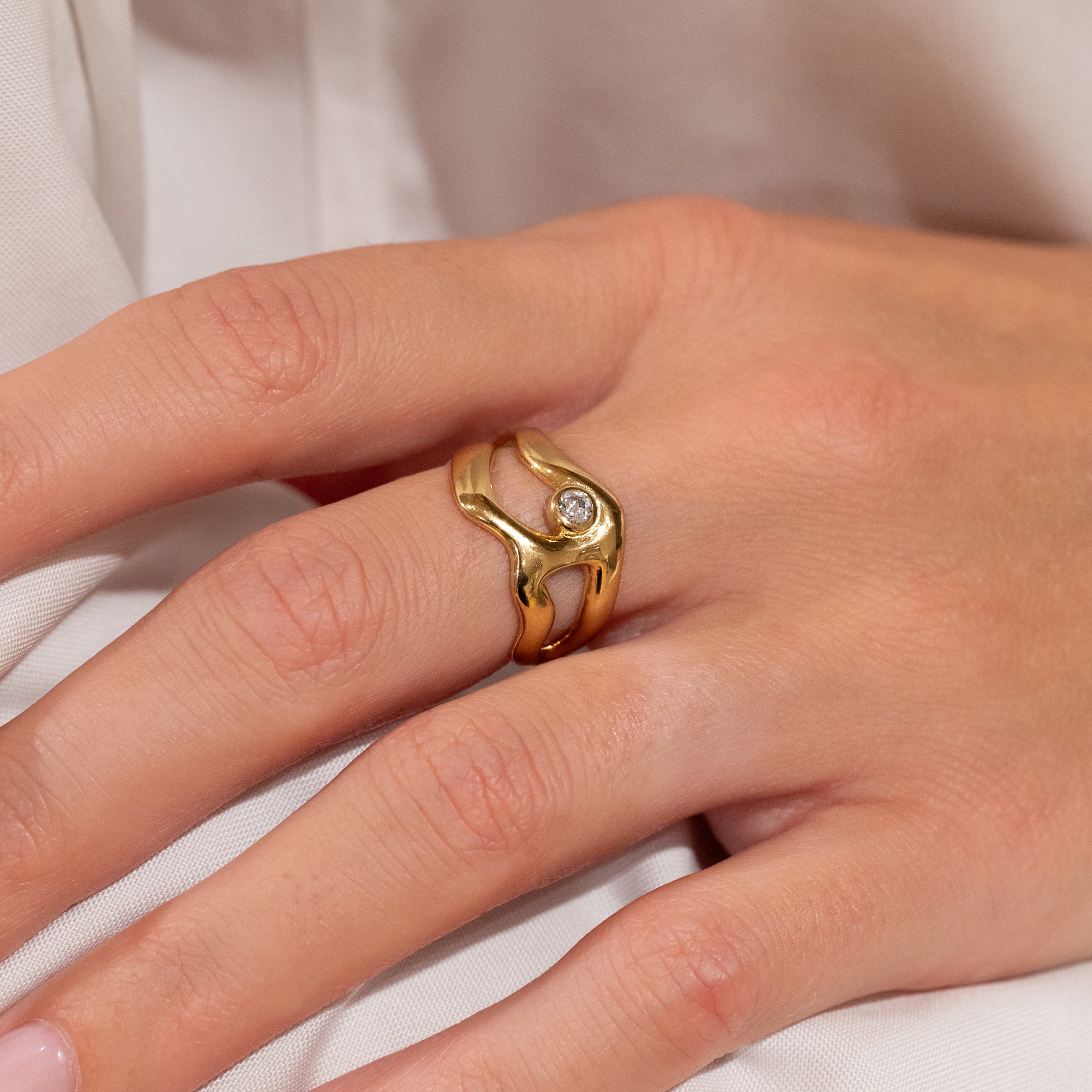 Gold-plated ring with soft, organic lines and a clear zircon