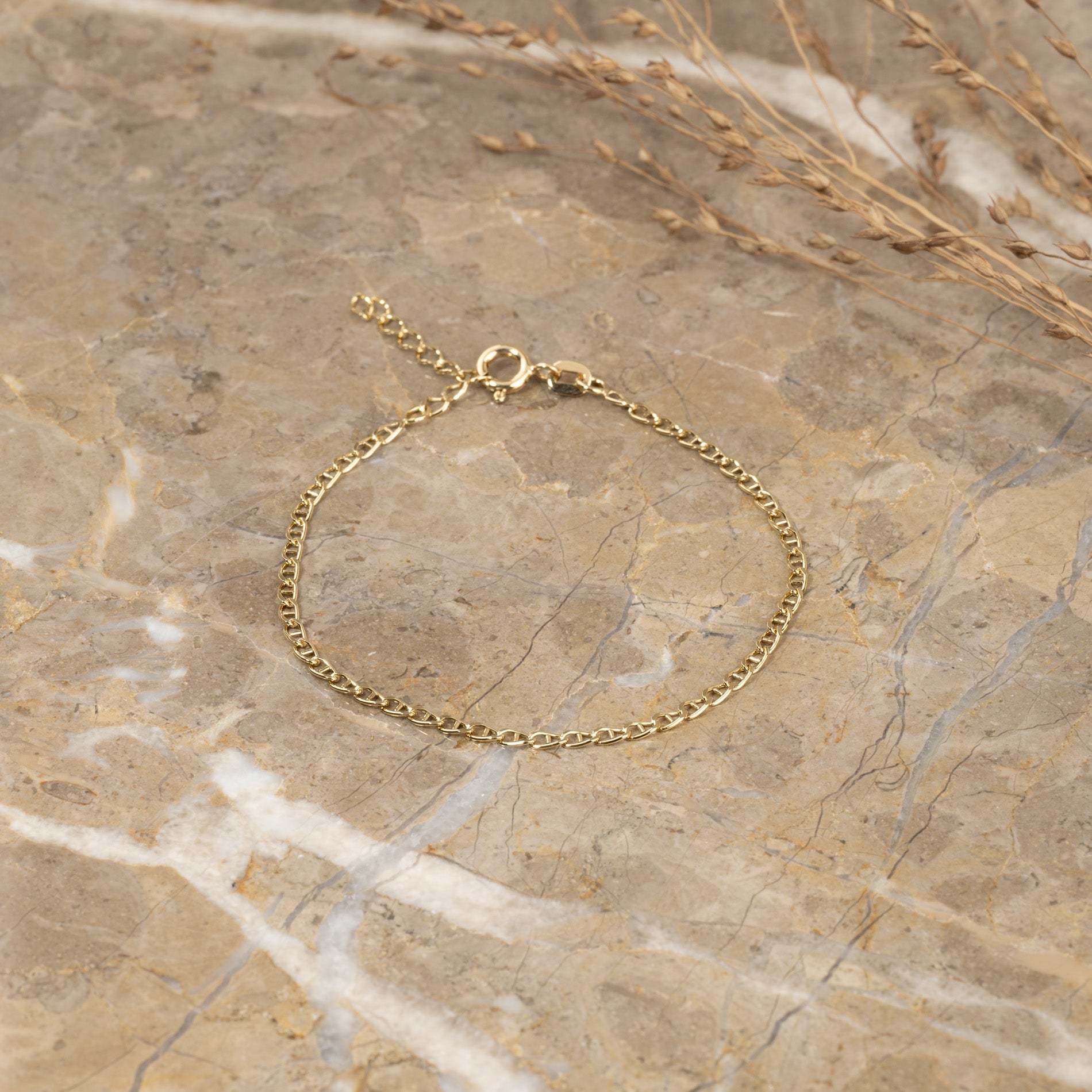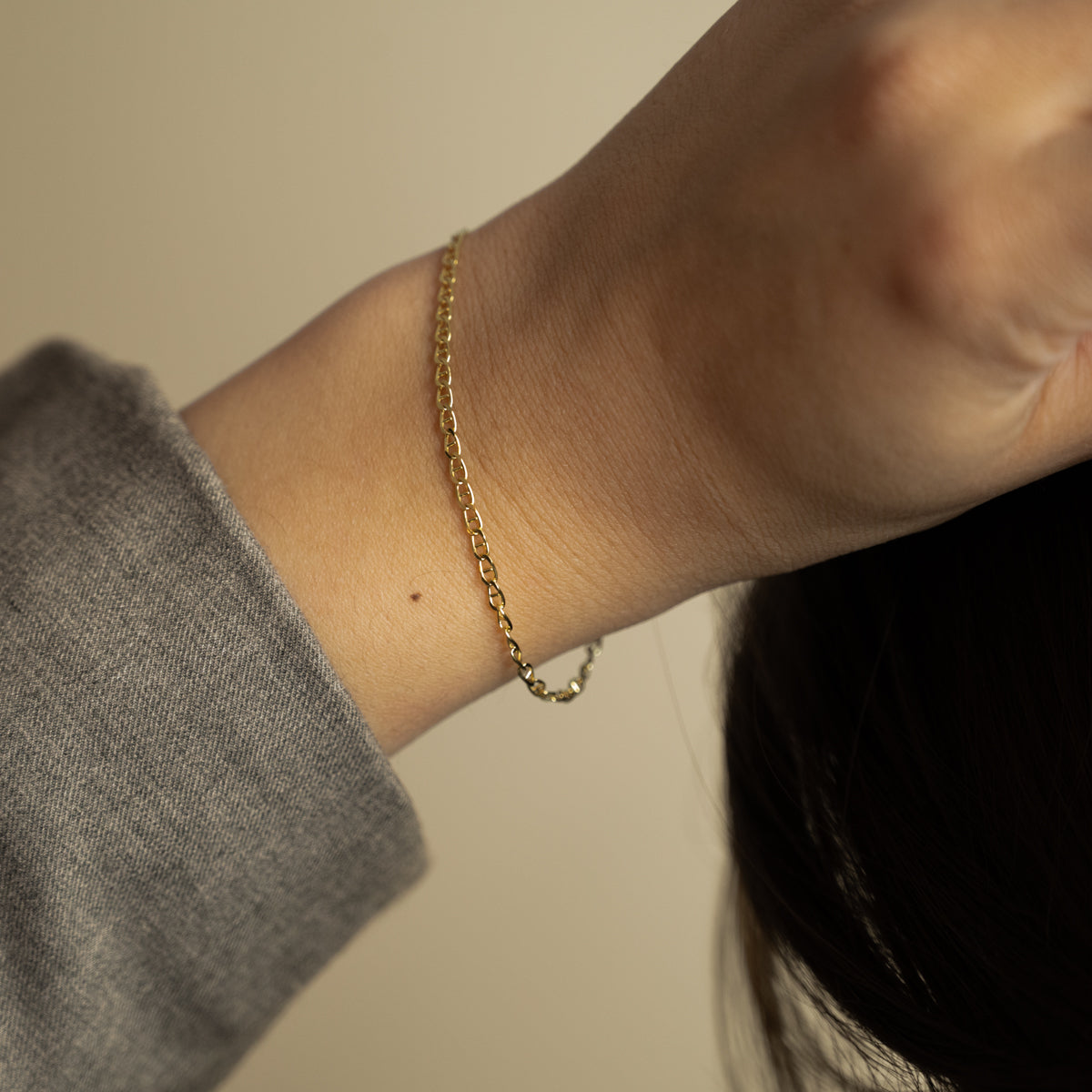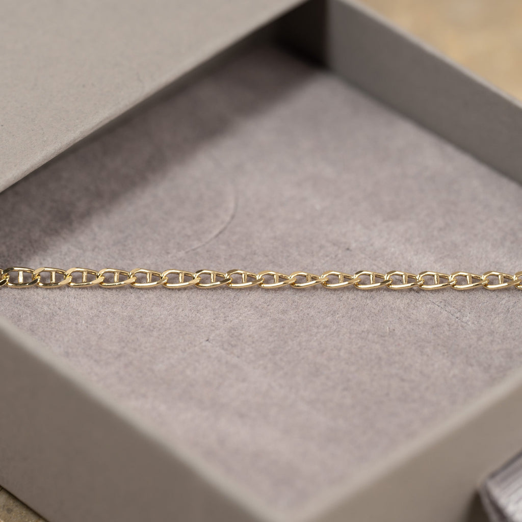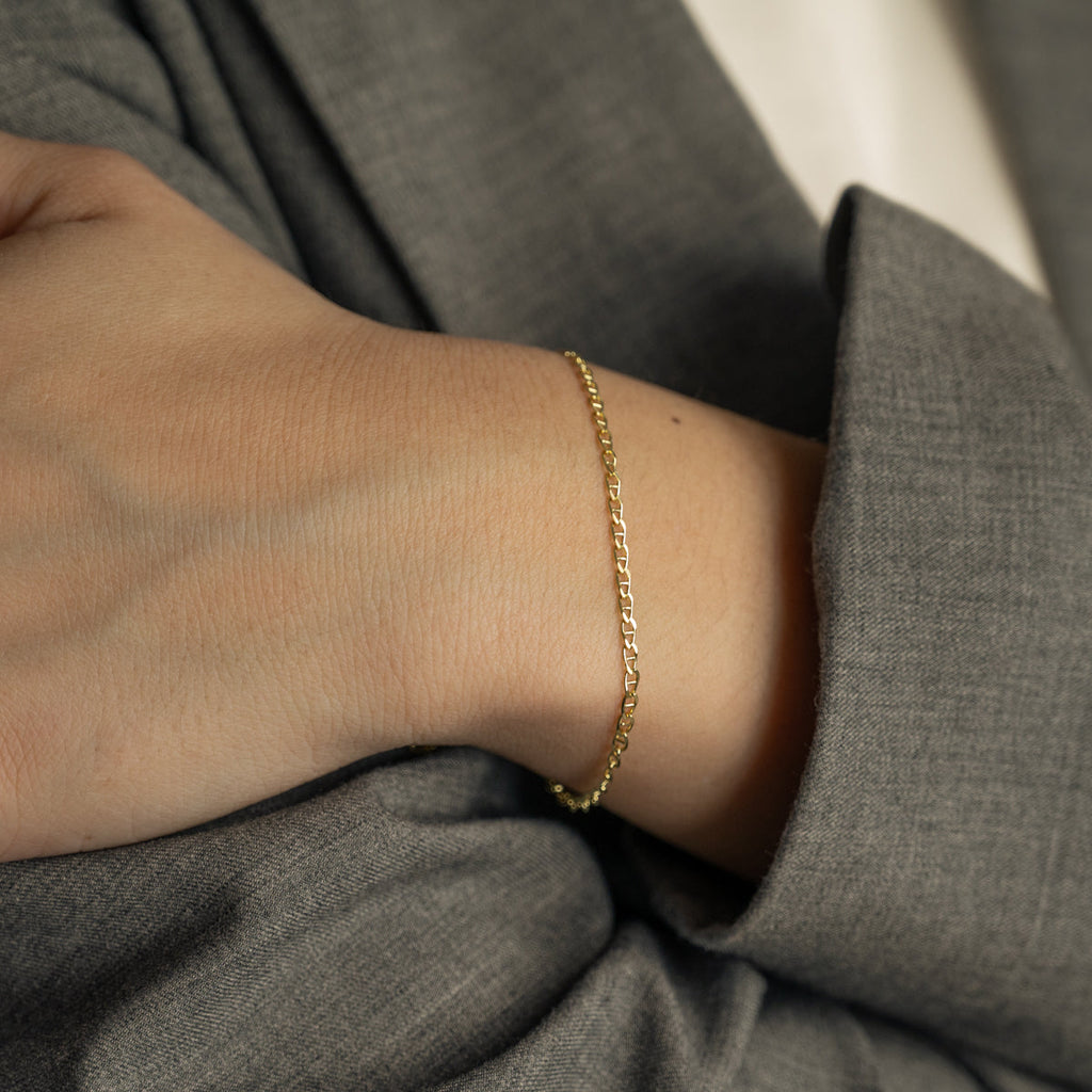Unser Auda Armband ist dezent und leicht. Die flachen Kettenglieder sind angenehm zu tragen und verleihen der Kette gleichzeitig ein feines Muster.