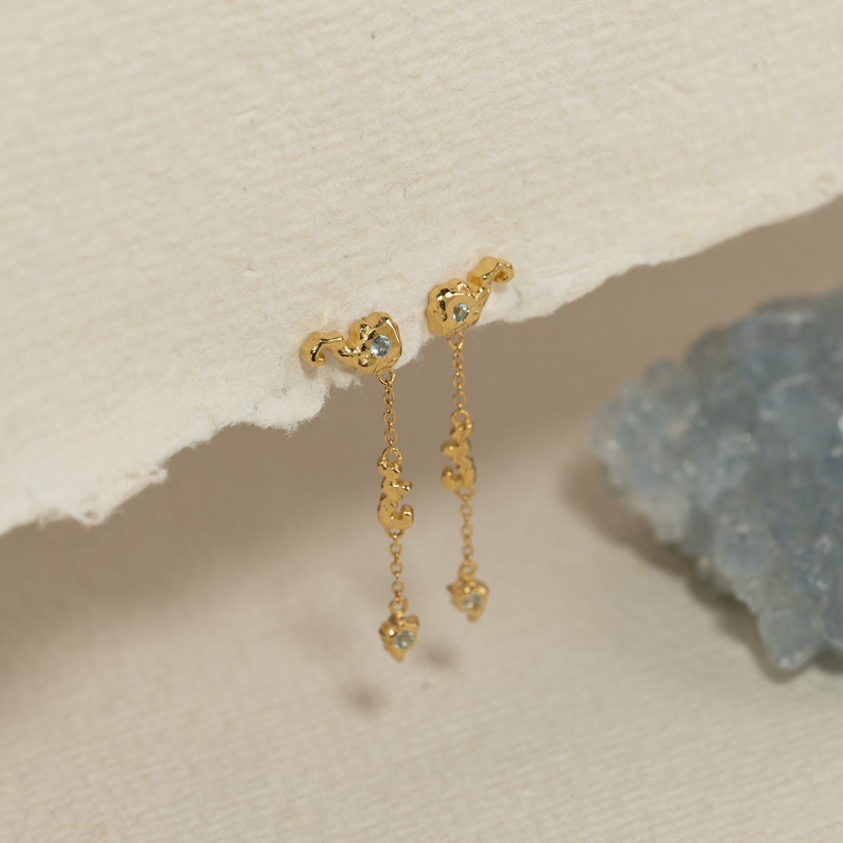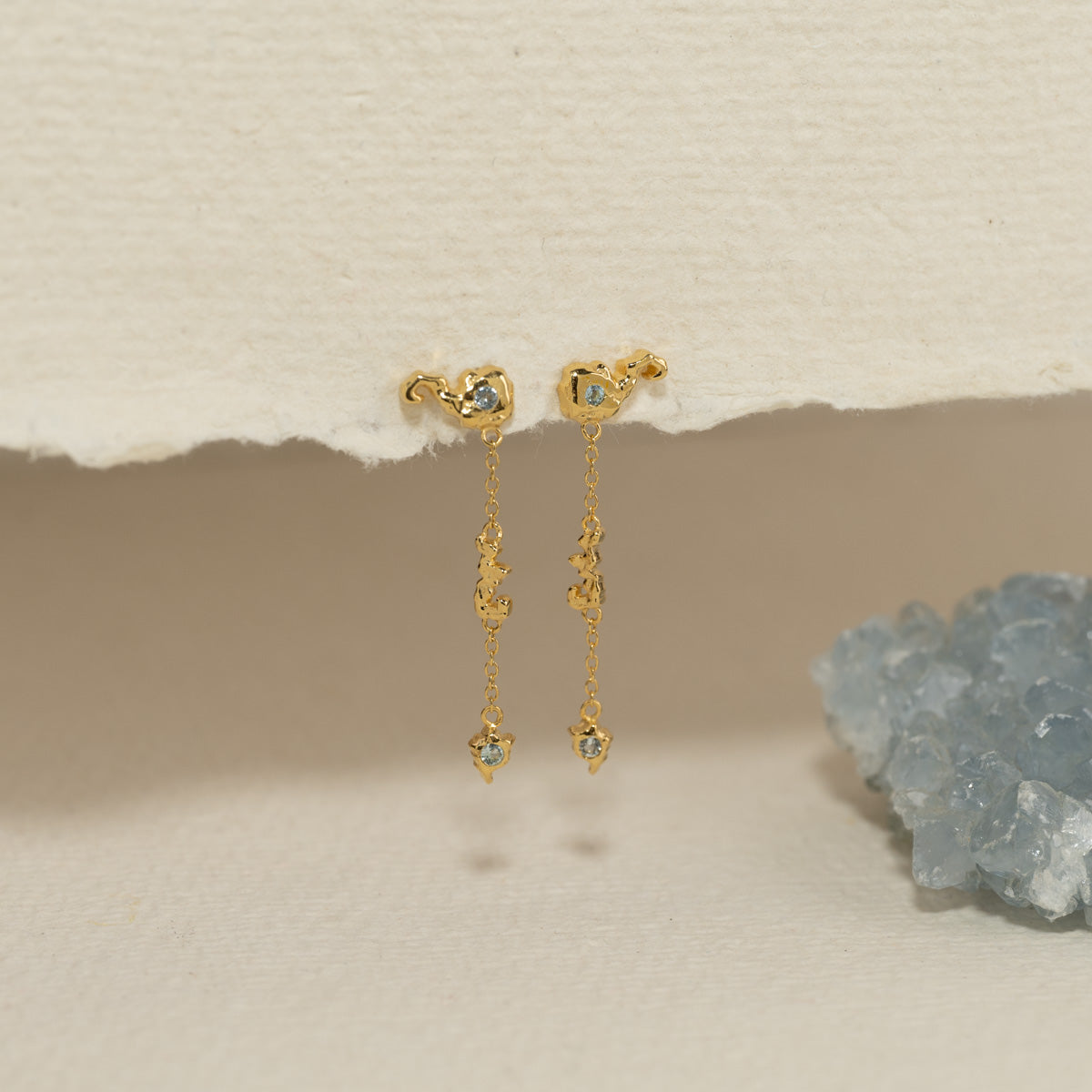 The Aurelia earrings are created in 100% recycled 18 karat gold-plated sterling silver. The earrings are designed as a stud from which two pendants hang on a chain. Both the stud and the pendants are shaped with an organic expression and a 'molded' surface. There are two blue topaz stones in each earring, adding an incredibly beautiful detail to the earrings.