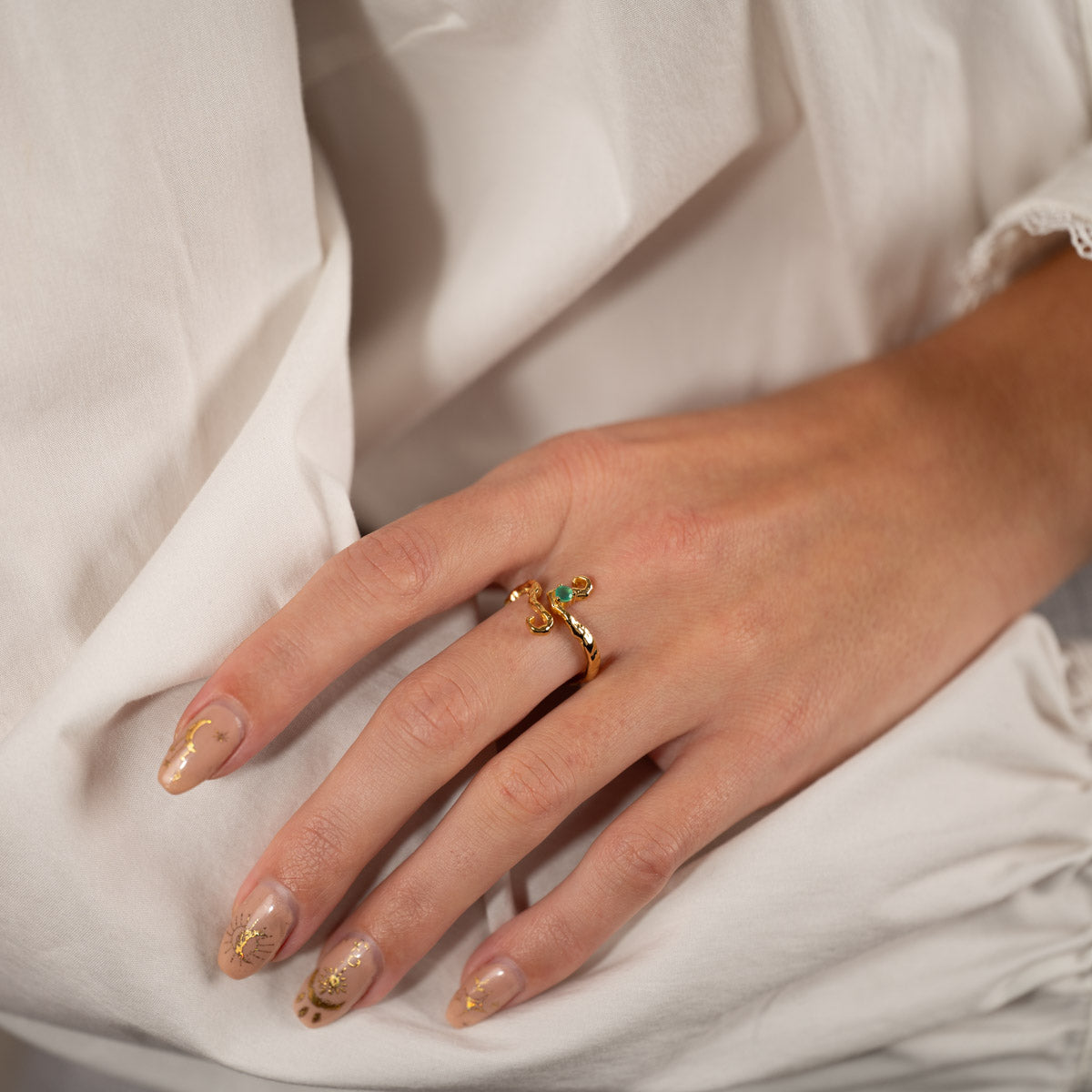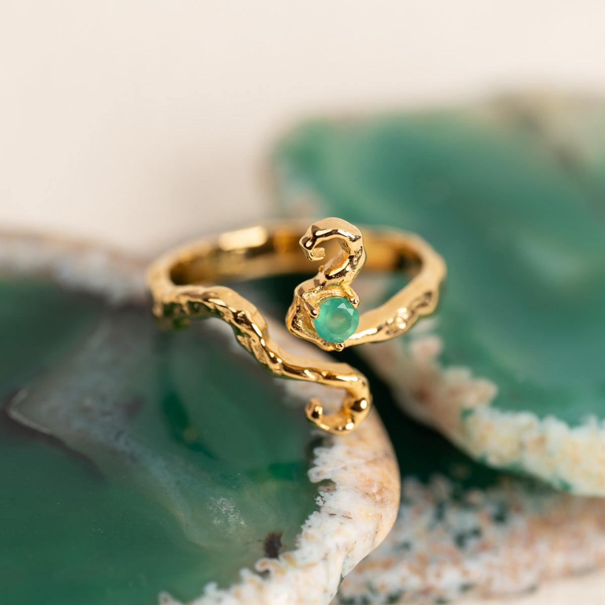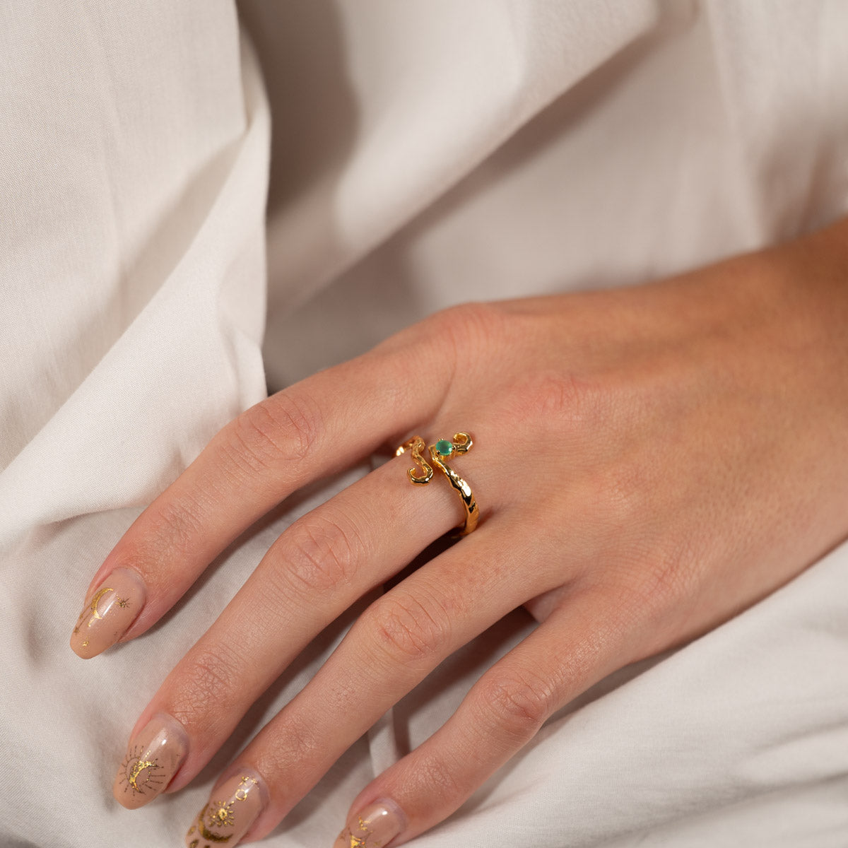 The Aurelia ring is crafted in 100% recycled 18 karat gold-plated silver. The ring is adorned with a green agate featuring the most exquisite deep green hue.