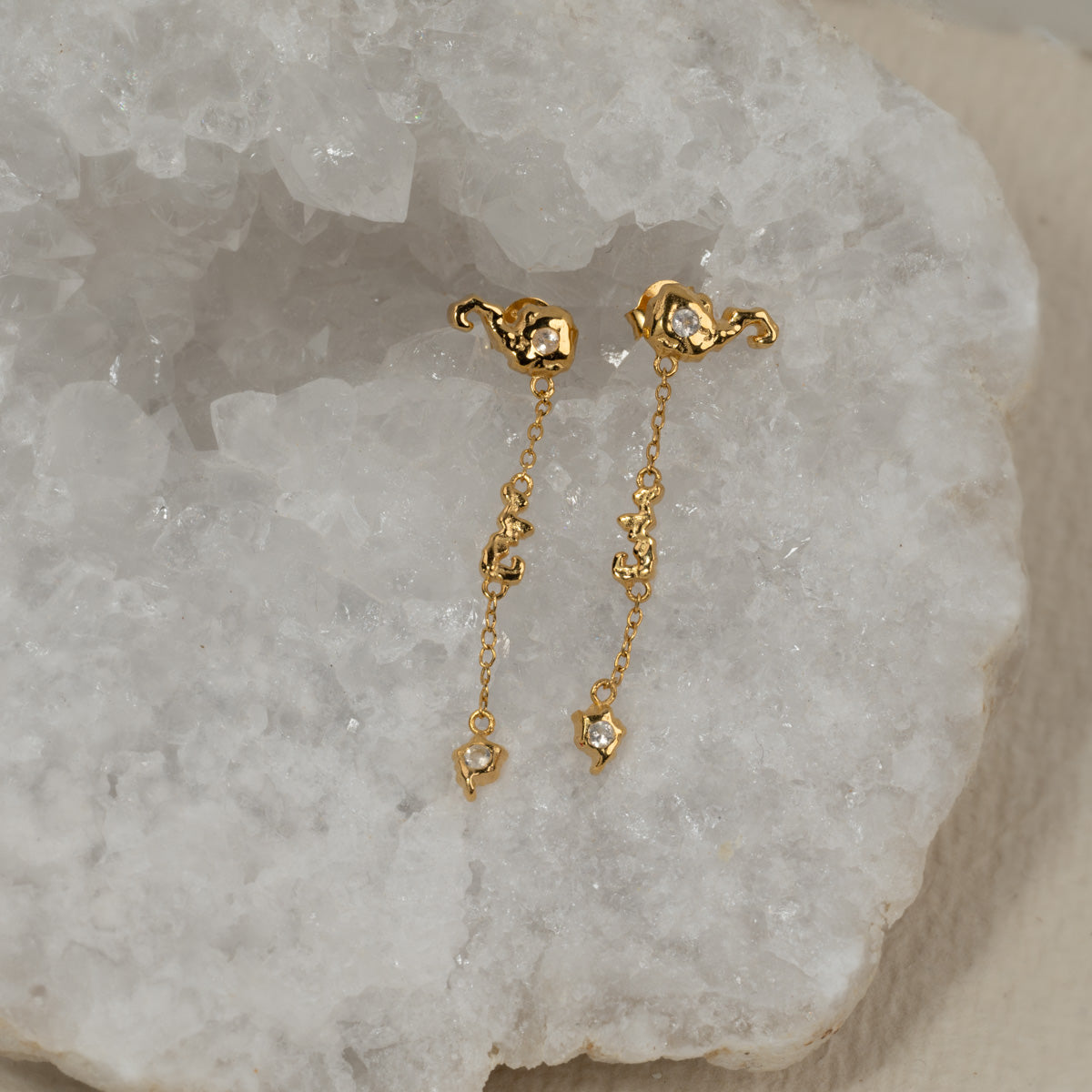 Earrings crafted from recycled 18-carat gold-plated silver. These incredibly beautiful charm earrings are designed to convey an organic and lightweight appearance. Each earring features two moonstones, adding a stunning detail to the design.