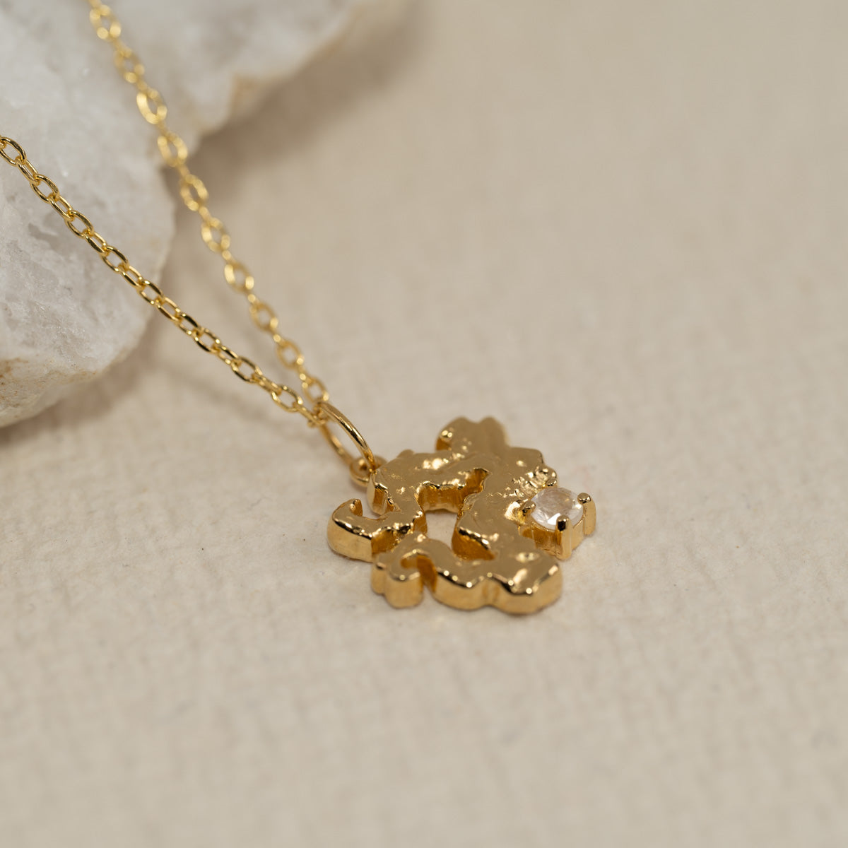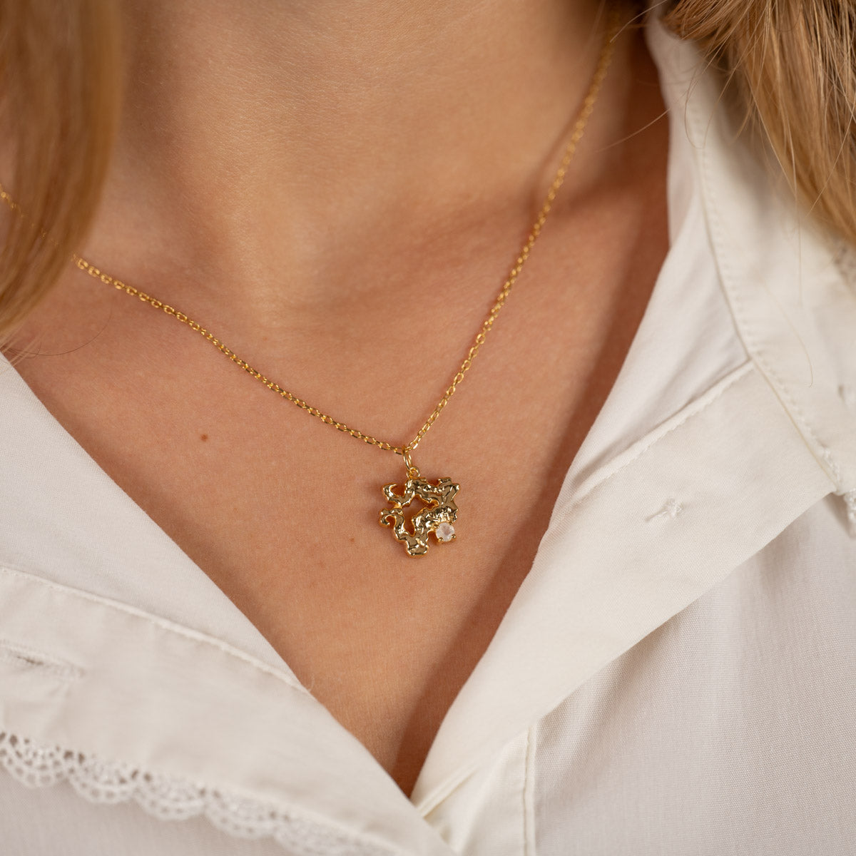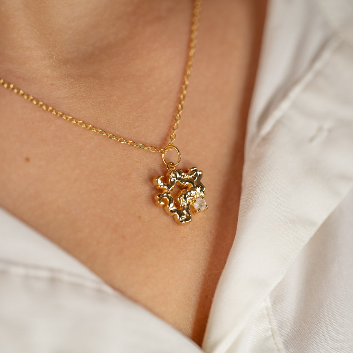 The pendant is crafted in 100% recycled 18 karat gold-plated silver. It is designed with a moonstone that possesses a beautiful - sometimes almost mystical - radiance. The pendant has an organic shape that makes it stand out. The pendant features a textured surface, creating an intriguing and raw expression.