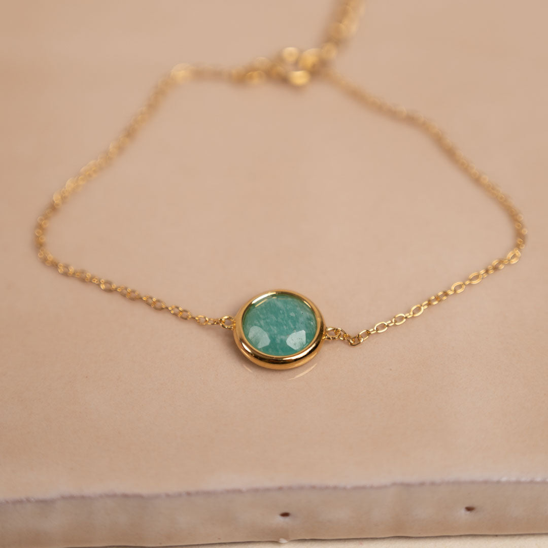 Our Ava bracelet is made in recycled 18-carat gold-plated sterling silver with round faceted amazonite. The delicate design has many classical references but is also elegant and simple in its expression. The beautiful blue-green amazonite stone is opal and full of beautiful lines that can vary in pattern from leopard spots to tiger stripes.
