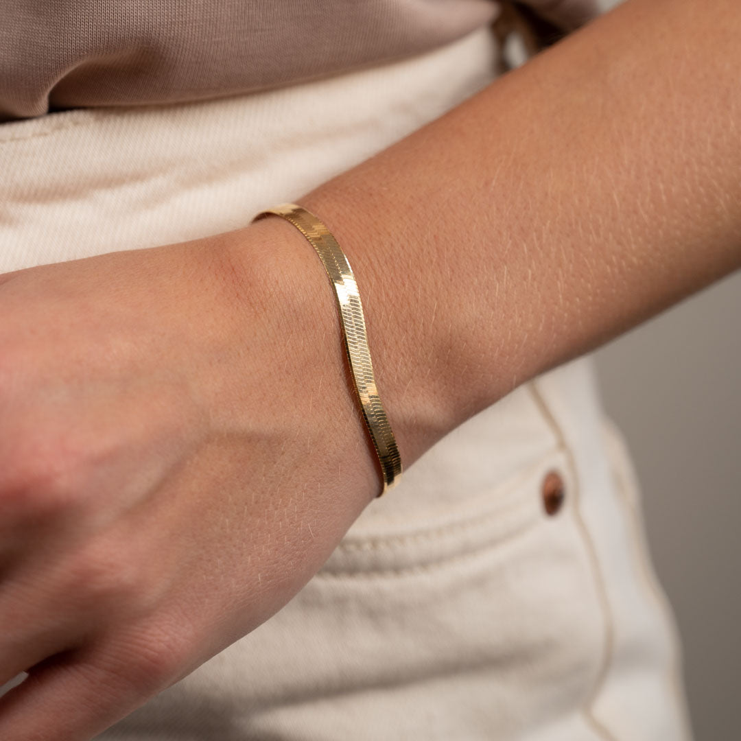 Unser Aya Armband ist die perfekte Ergänzung für Ihre Schmuckkollektion. Mit seiner glänzenden breiten Oberfläche und den eng anliegenden Gelenken hat das Armband ein schlangenartiges Aussehen.