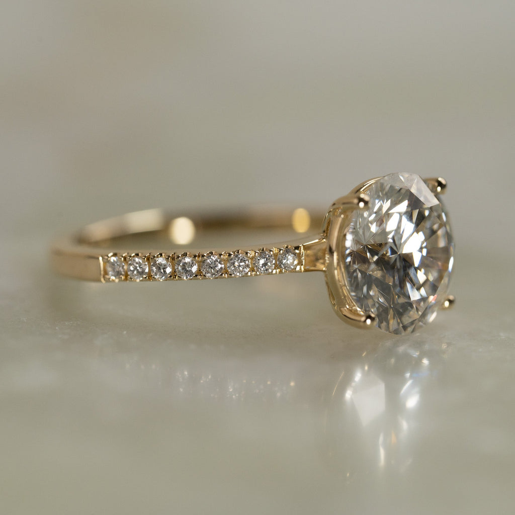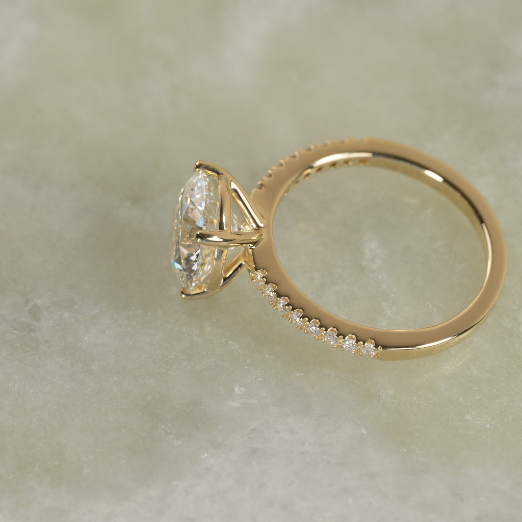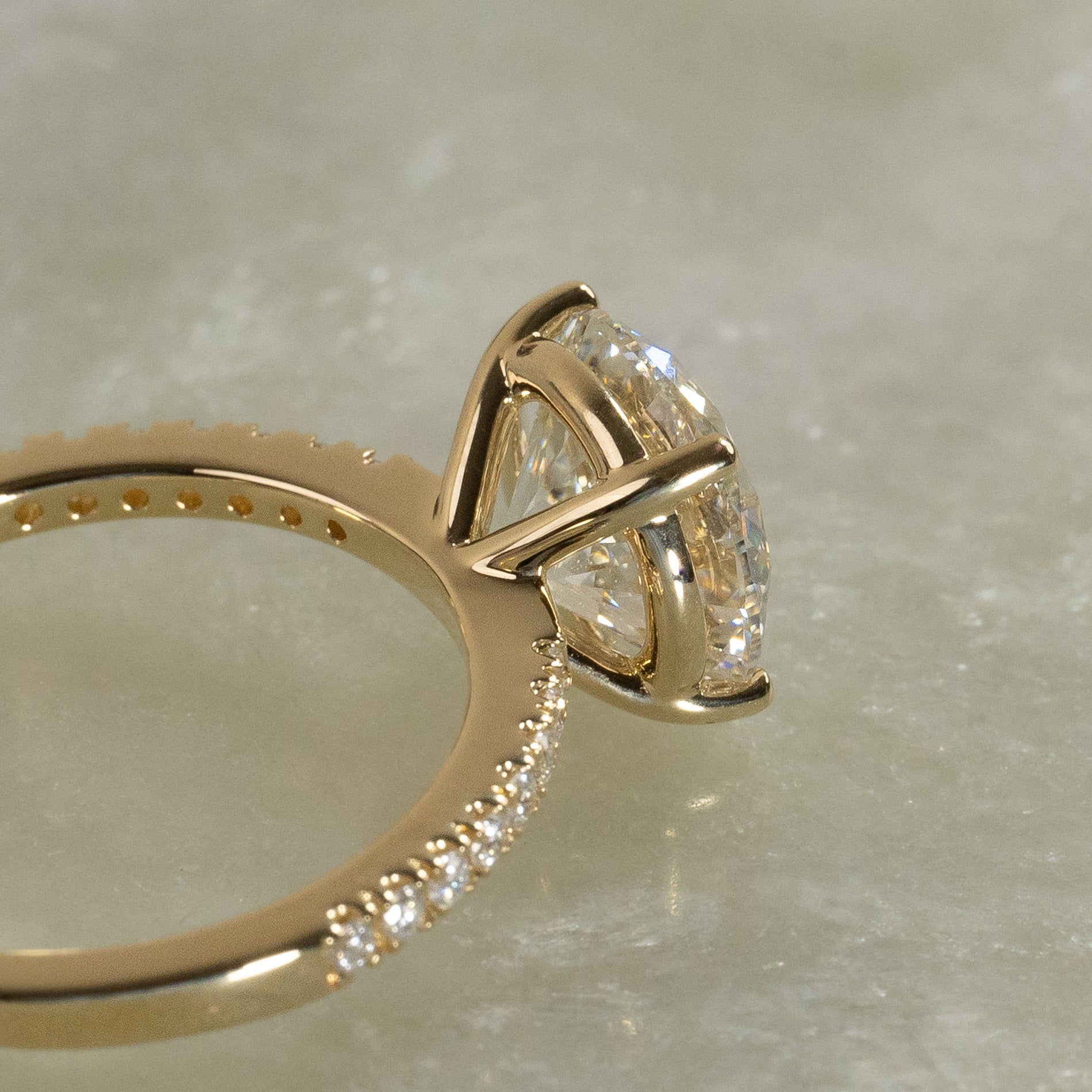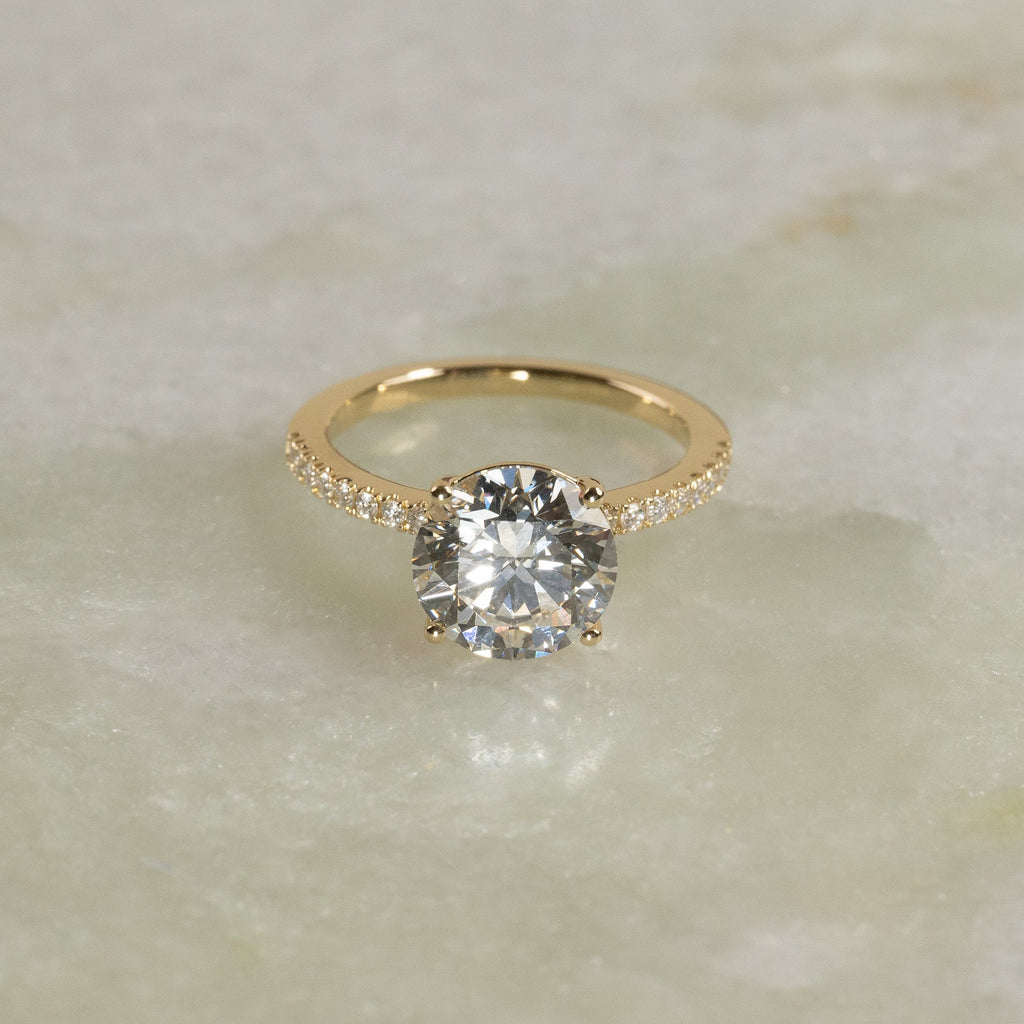 The ring is made in 14 karat solid gold and has a timeless, elegant feel. The slim band is set with small lab-grown diamonds, creating a soft, sparkling frame around the finger. At the center sits an impressive 3.0 ct. lab-grown diamond - the heart of the piece. Altogether, the diamonds weigh 3.1 ct. and are graded (E/F) River in color and VVS1 in clarity, giving the ring a bright, refined and elegant finish.