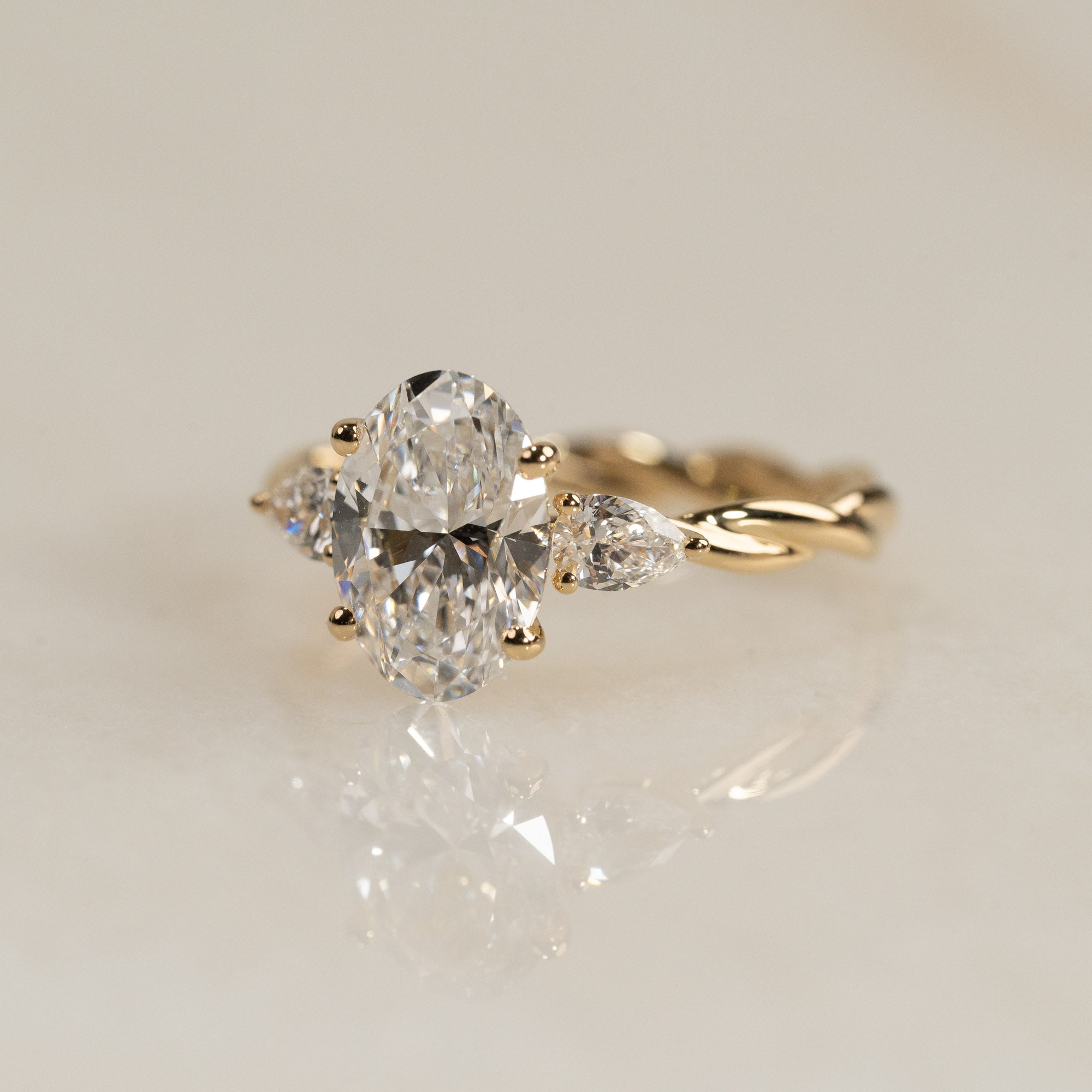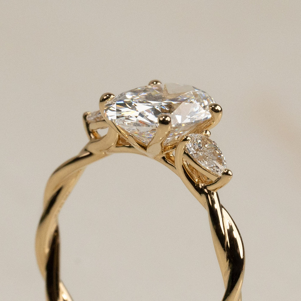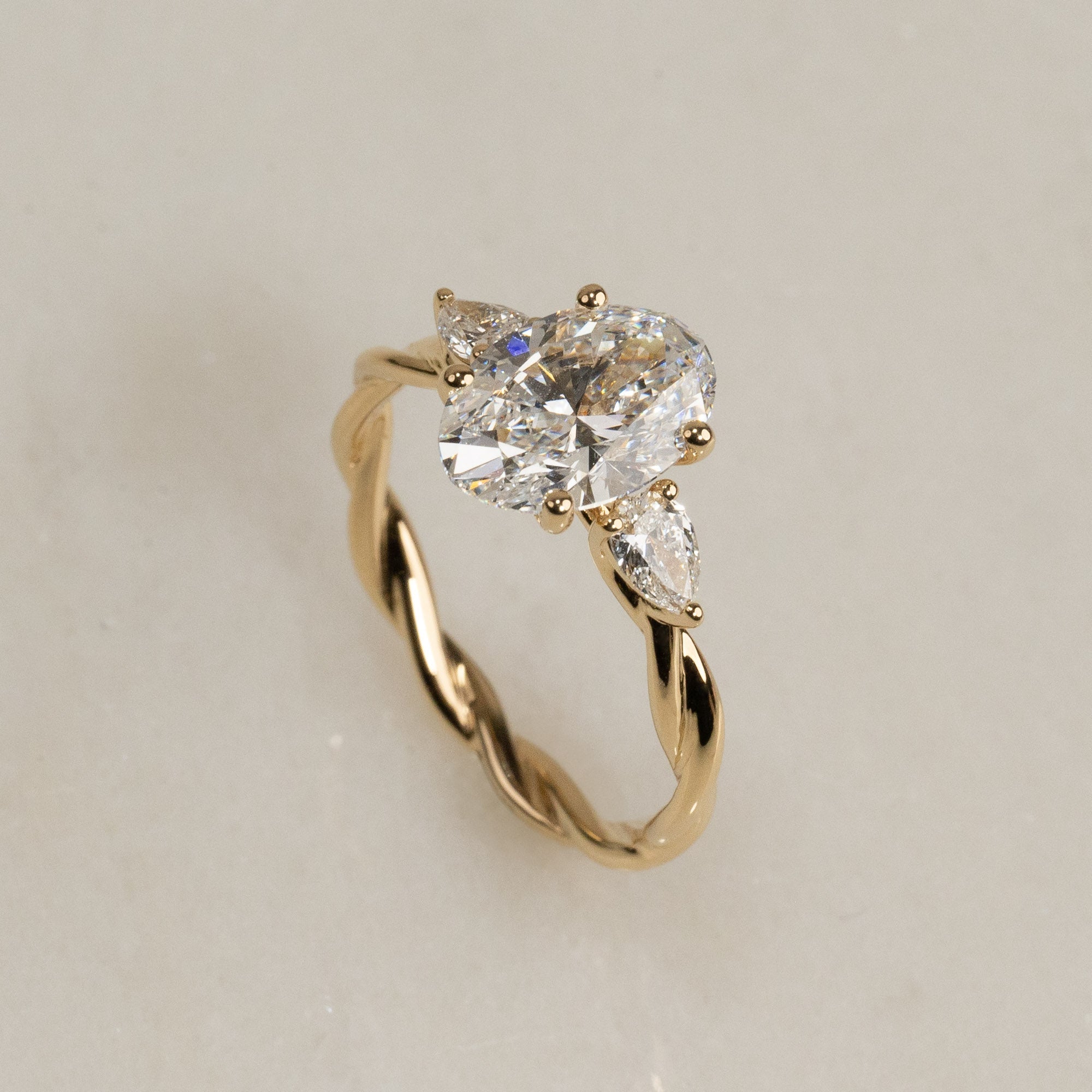 Crafted in 18 karat solid gold, this ring features a gracefully twisted band set with lab-grown diamonds. The oval-cut center stone is framed by two pear-cut side stones, creating a balanced and elegant design. The diamonds have a total weight of 2.3 ct., graded D (River) in color and VVS1 in clarity.