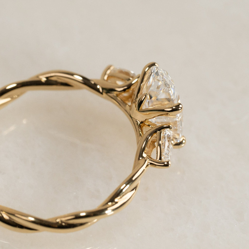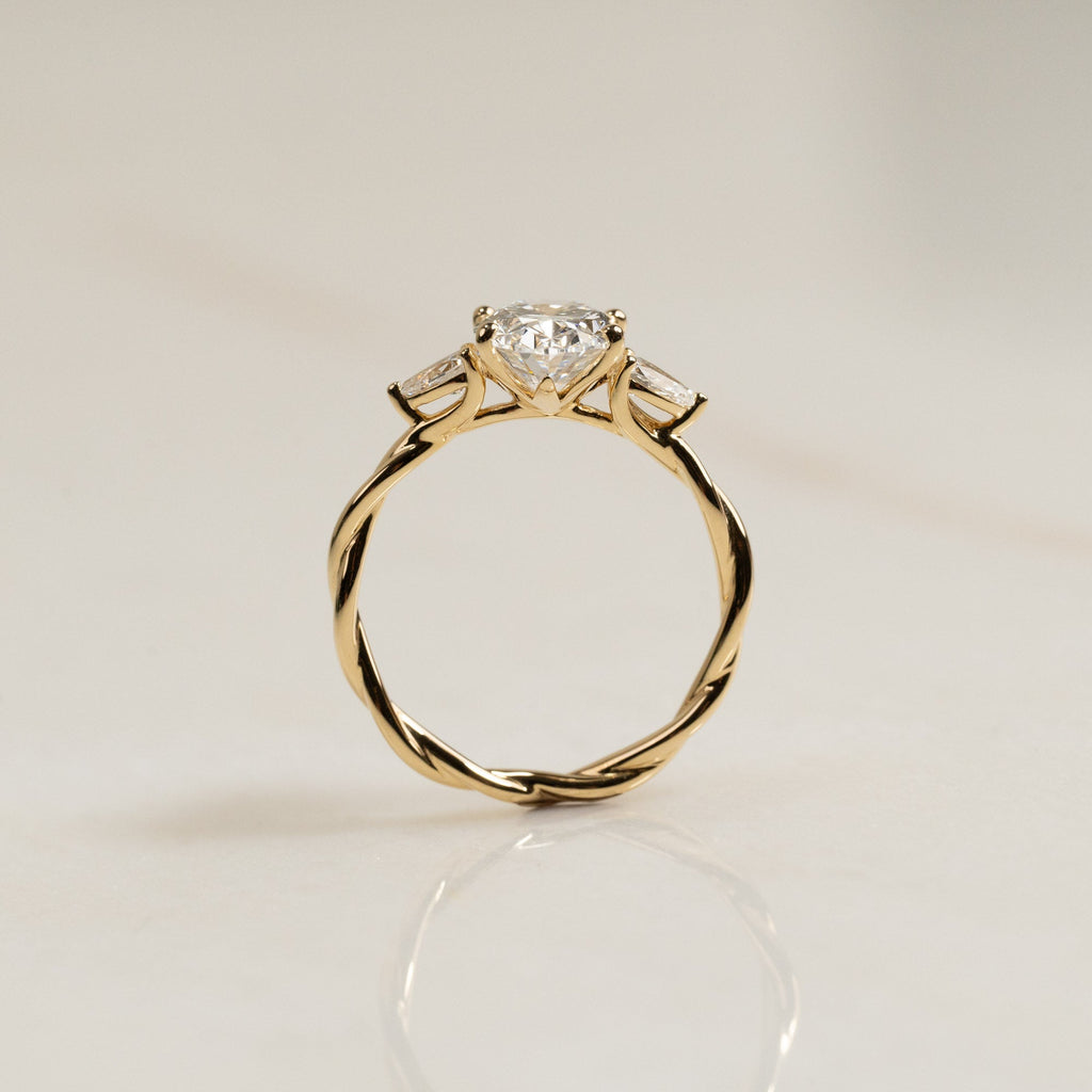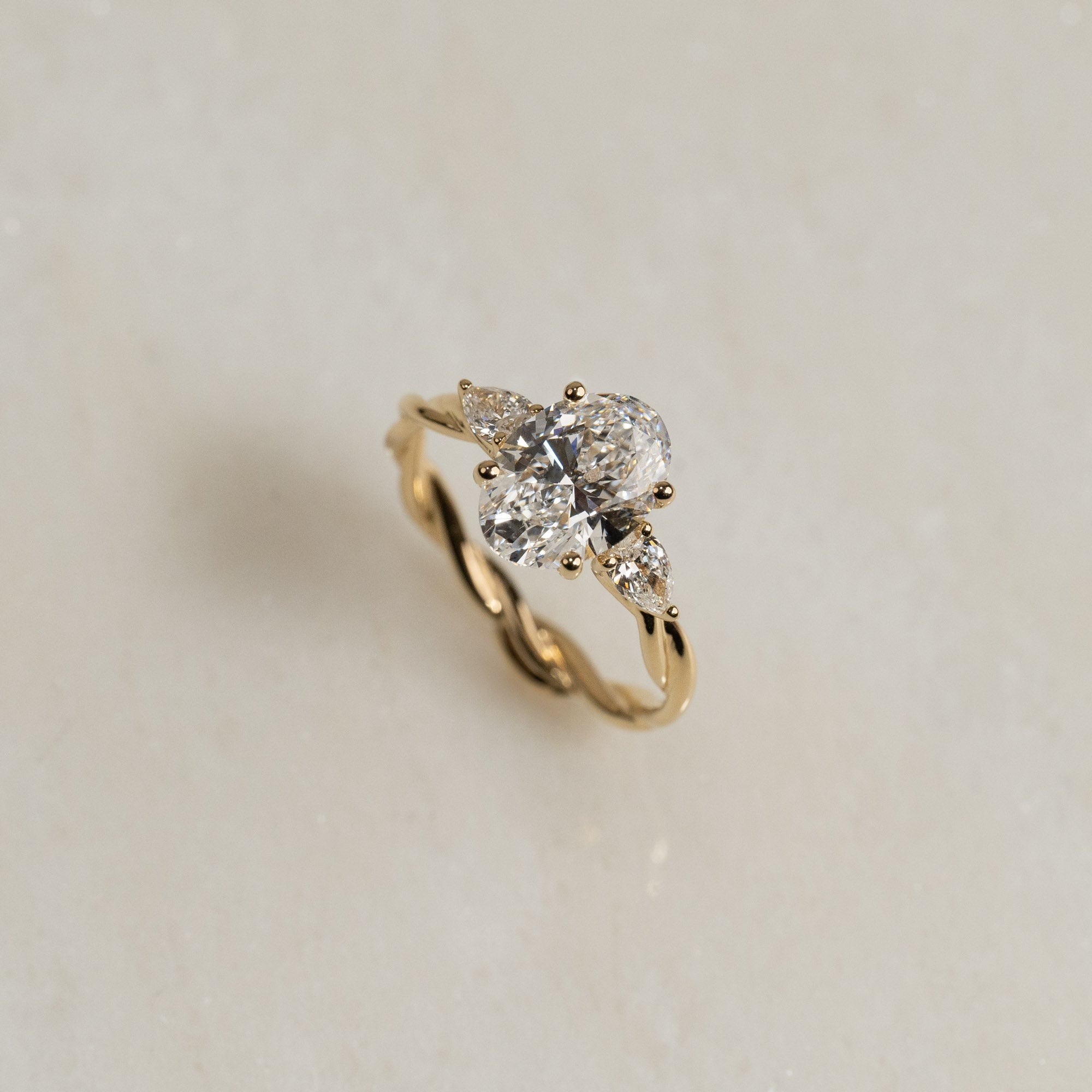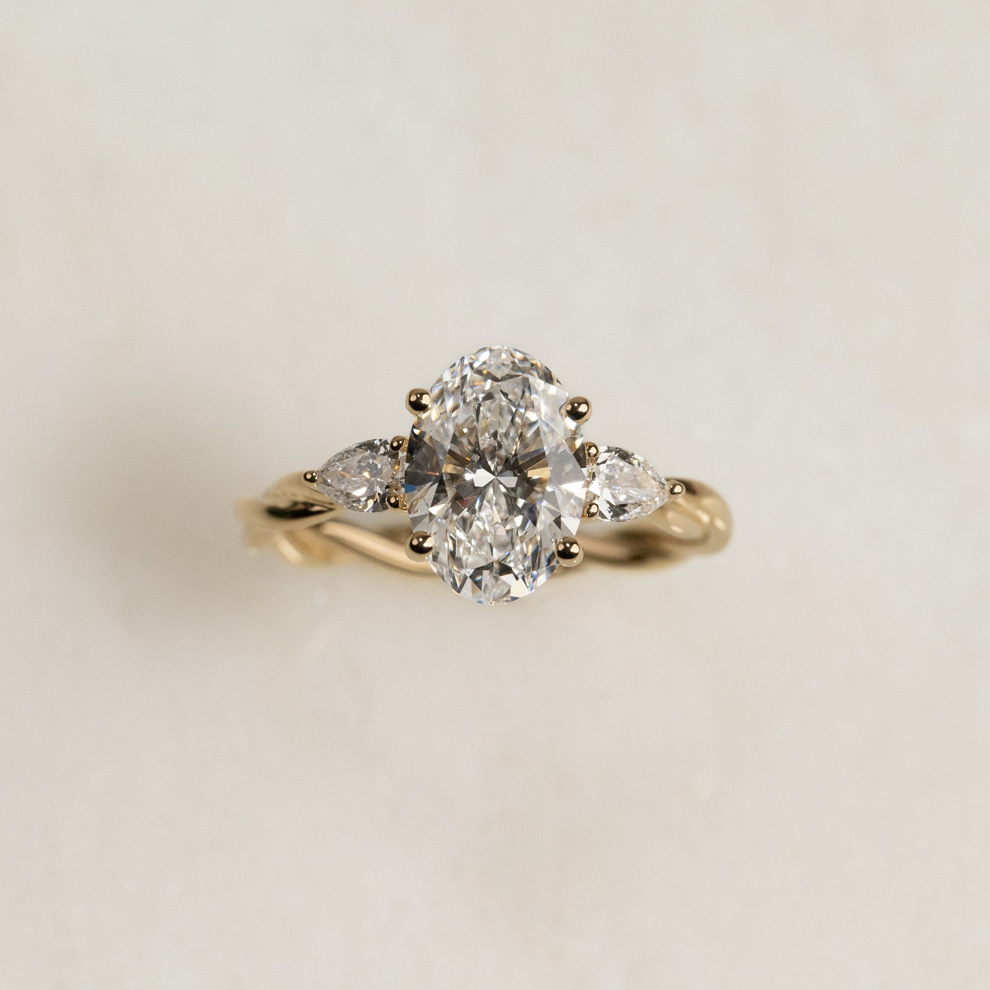 Crafted in 18 karat solid gold, this ring features a gracefully twisted band set with lab-grown diamonds. The oval-cut center stone is framed by two pear-cut side stones, creating a balanced and elegant design. The diamonds have a total weight of 2.3 ct., graded D (River) in color and VVS1 in clarity.