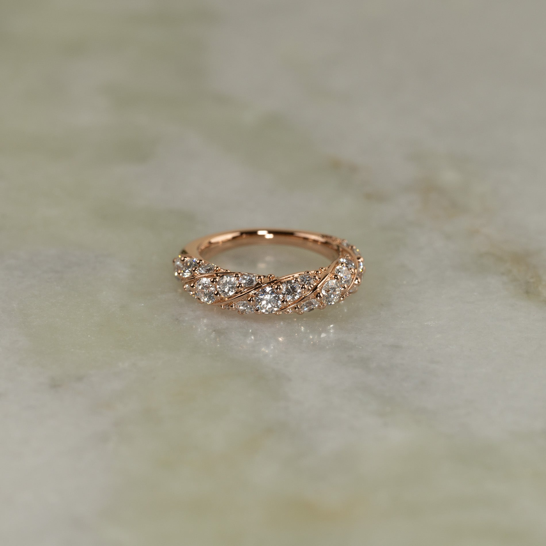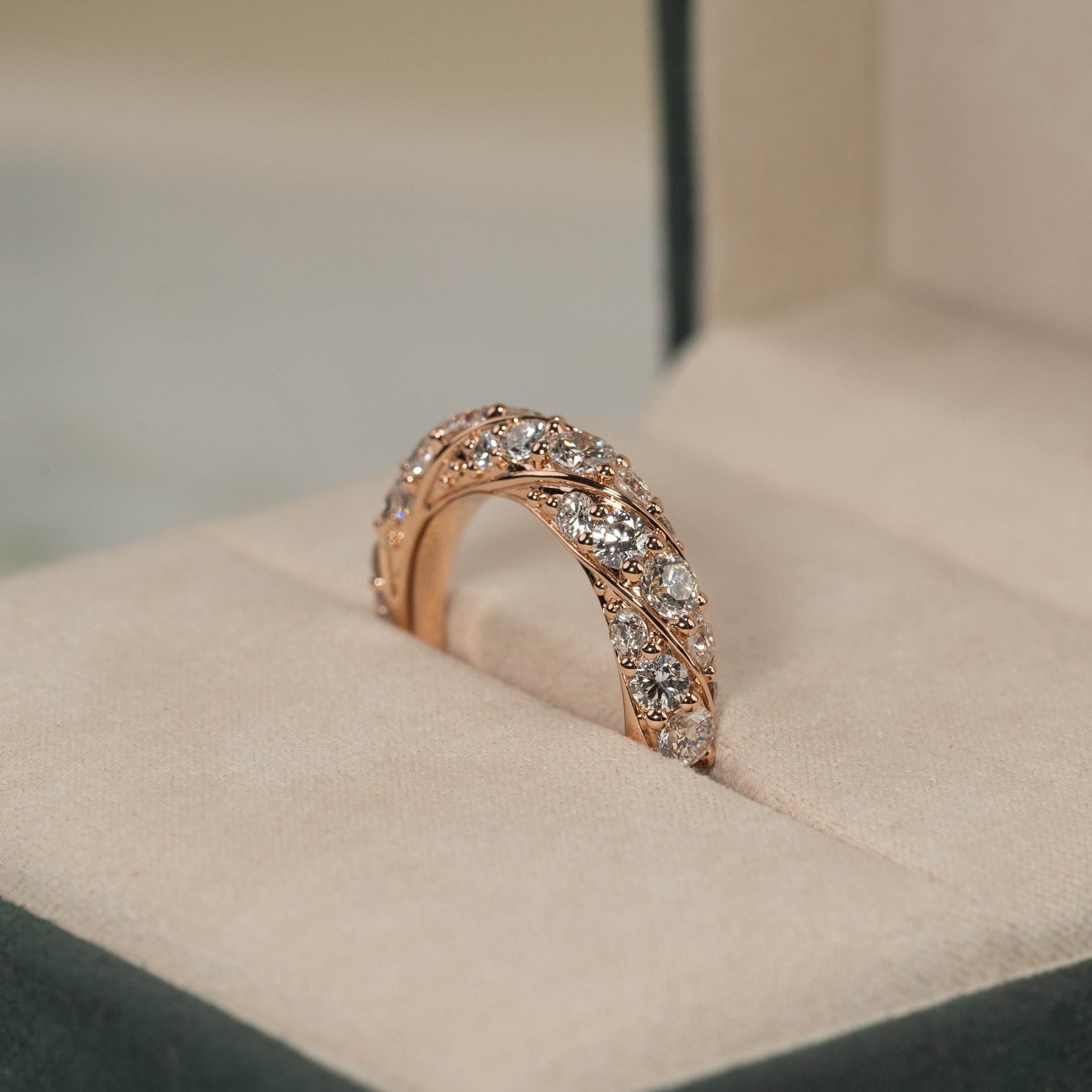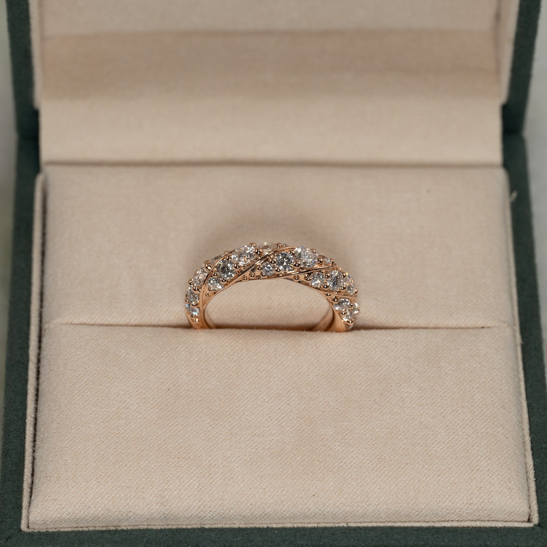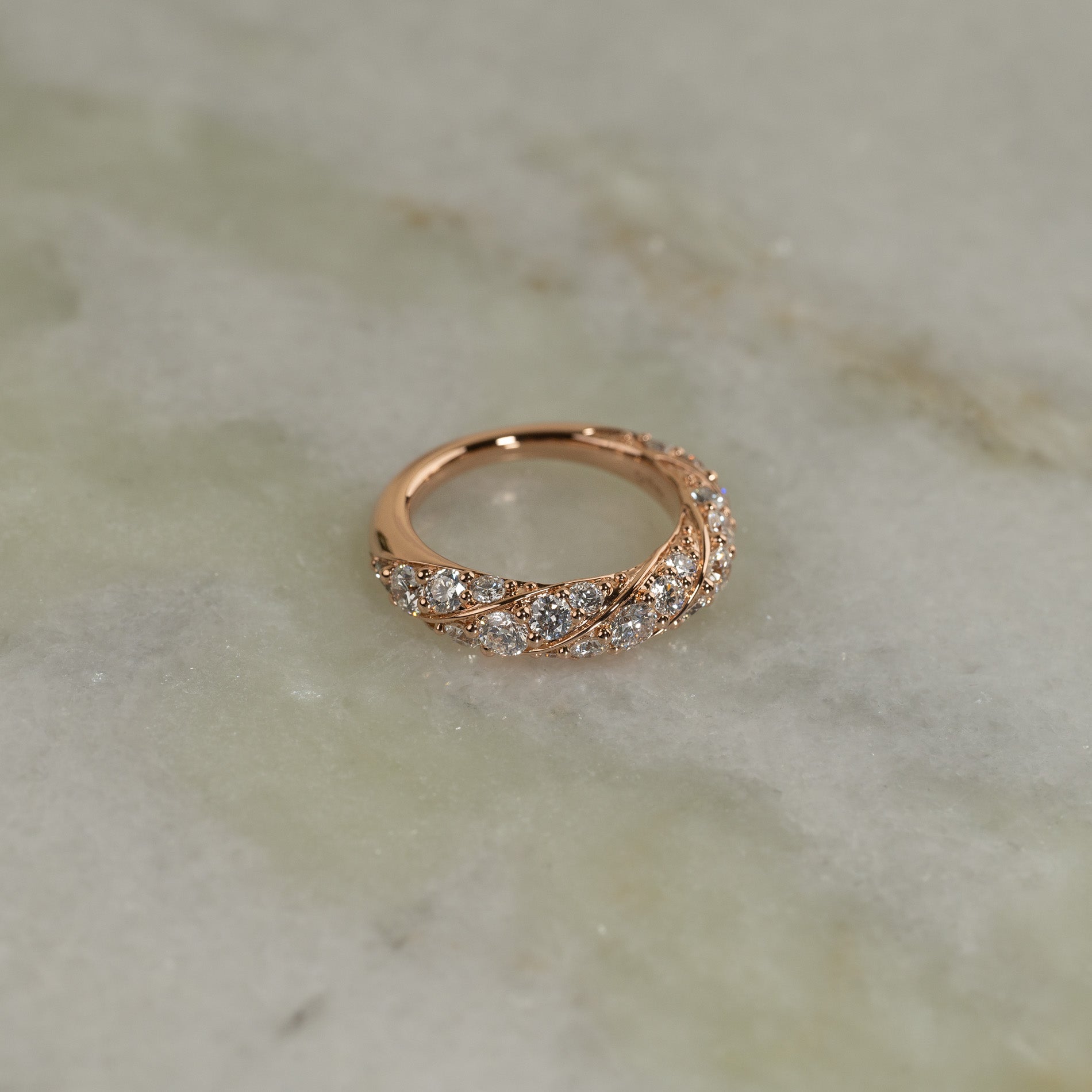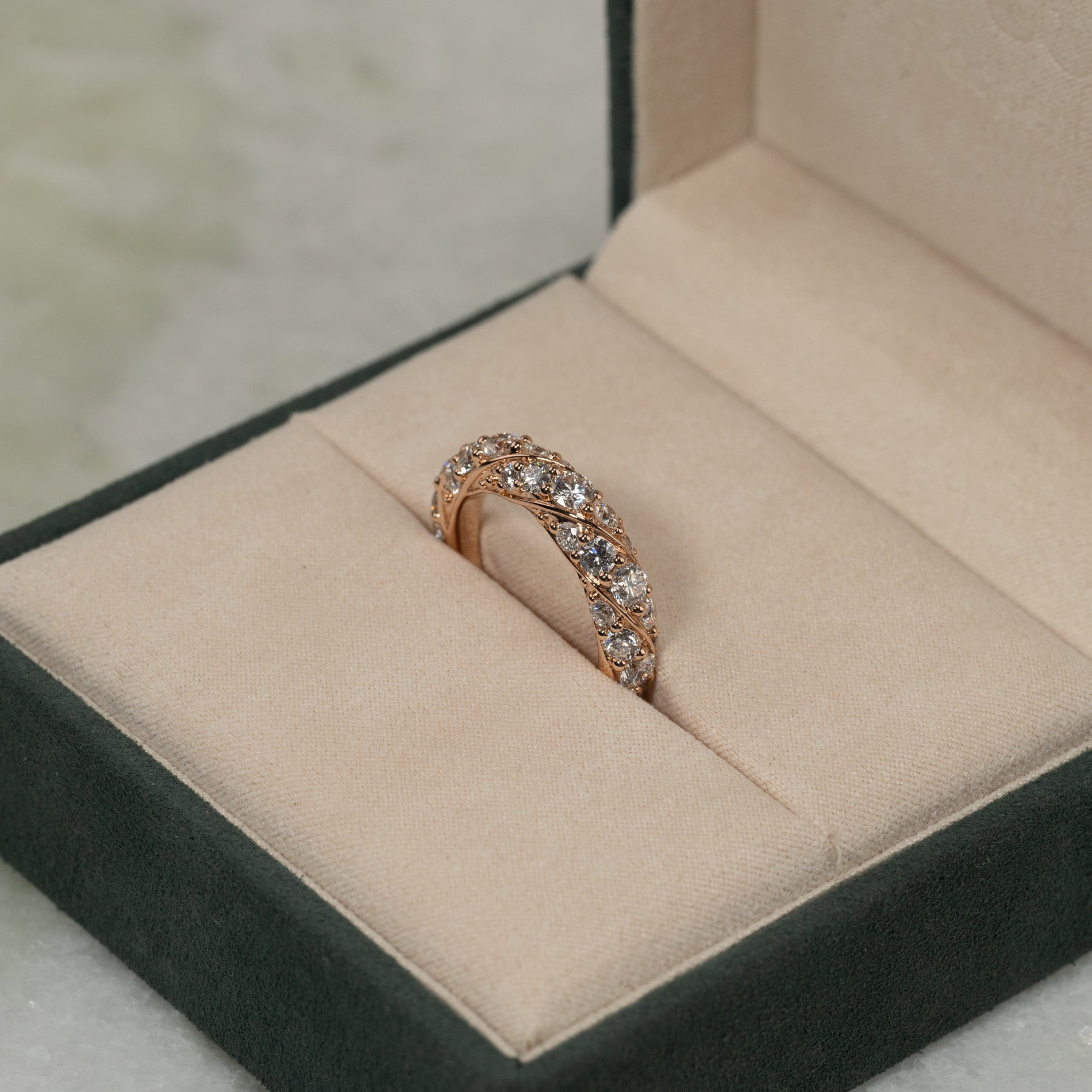 The ring is designed in 18 kt. solid rose gold and features an elegant twisted eternity setting, where the diamonds gracefully follow the curved shape of the band. The organic shape gives the ring a soft, exclusive expression, allowing the light to move beautifully across the stones and enhance their natural brilliance from every angle. The ring has a total weight of 2.64 ct., and the diamonds are graded E/F (River) in colour and VVS1 in clarity.