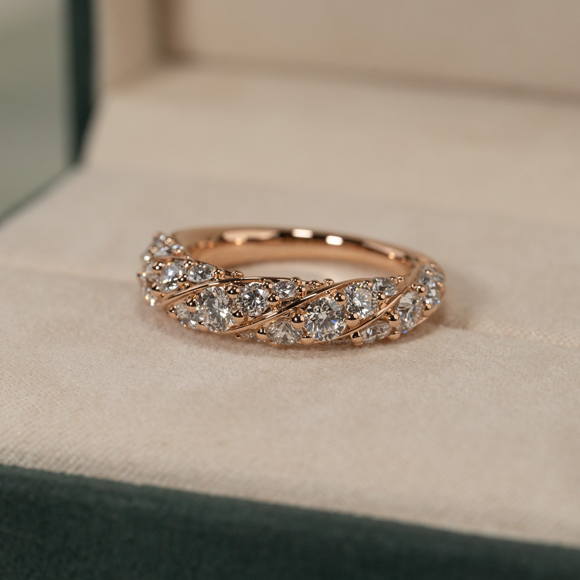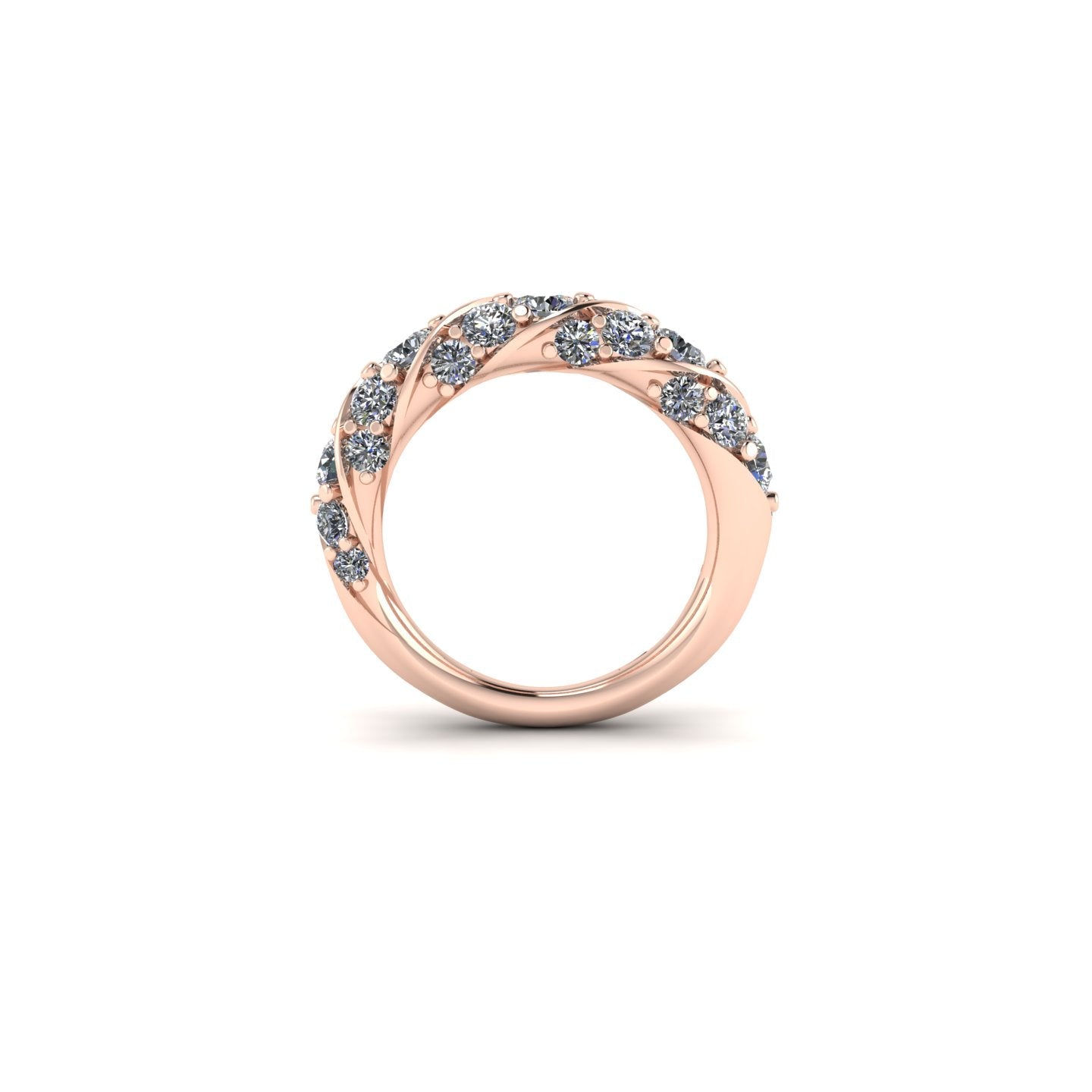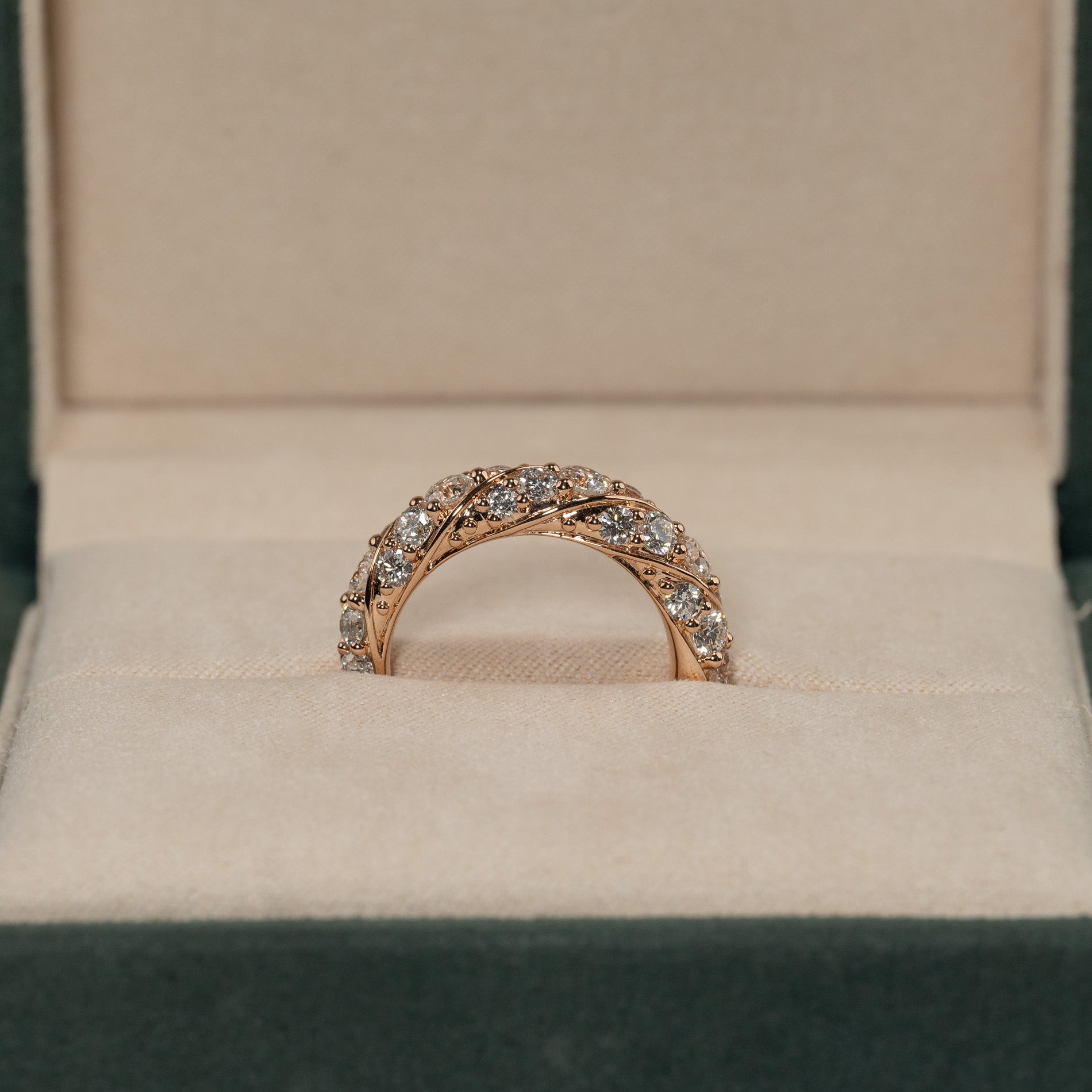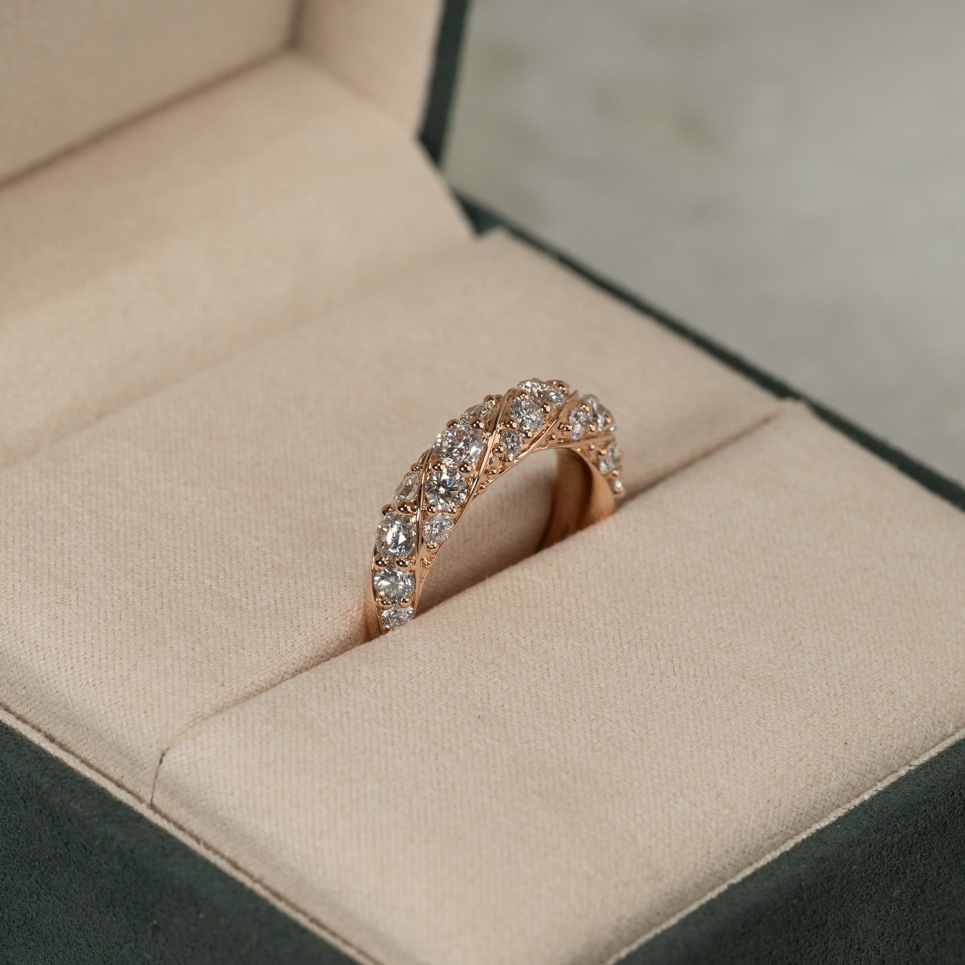 The ring is designed in 18 kt. solid rose gold and features an elegant twisted eternity setting, where the diamonds gracefully follow the curved shape of the band. The organic shape gives the ring a soft, exclusive expression, allowing the light to move beautifully across the stones and enhance their natural brilliance from every angle. The ring has a total weight of 2.64 ct., and the diamonds are graded E/F (River) in colour and VVS1 in clarity.