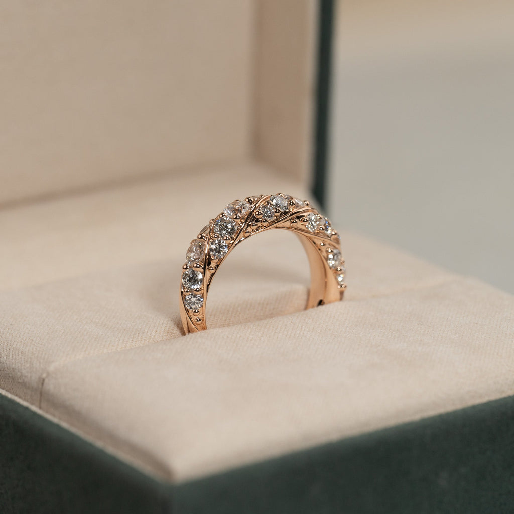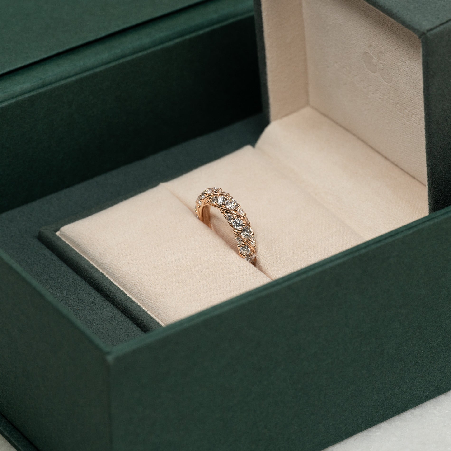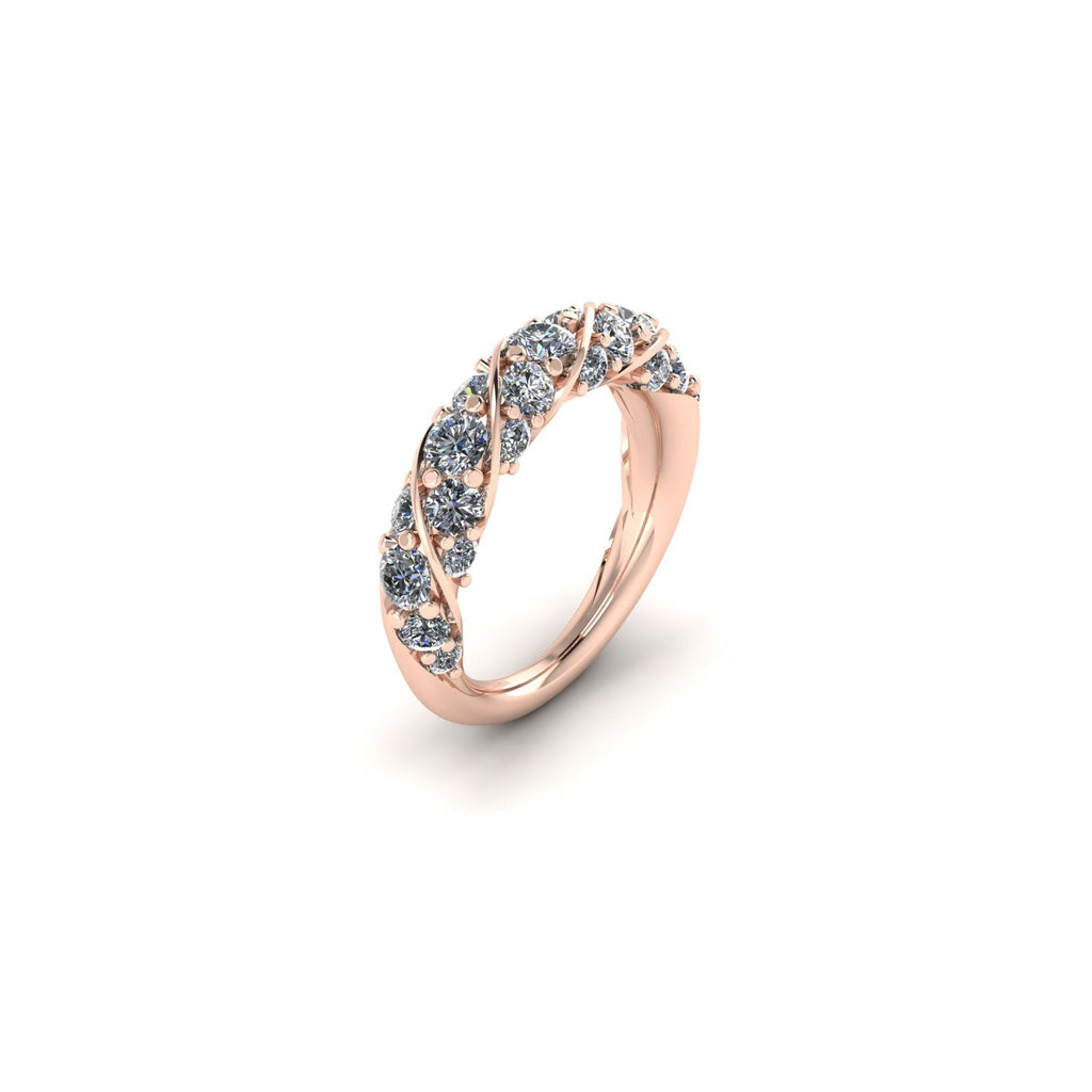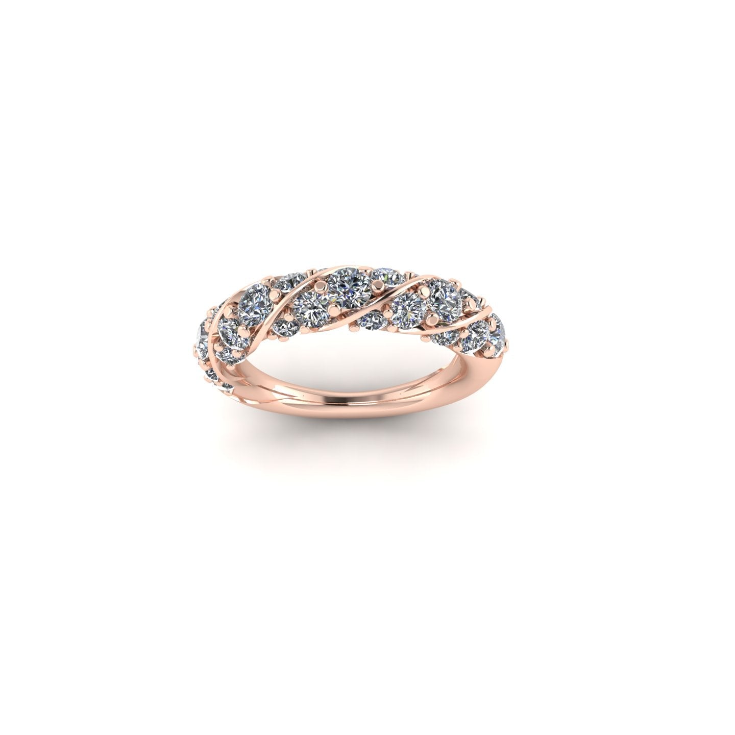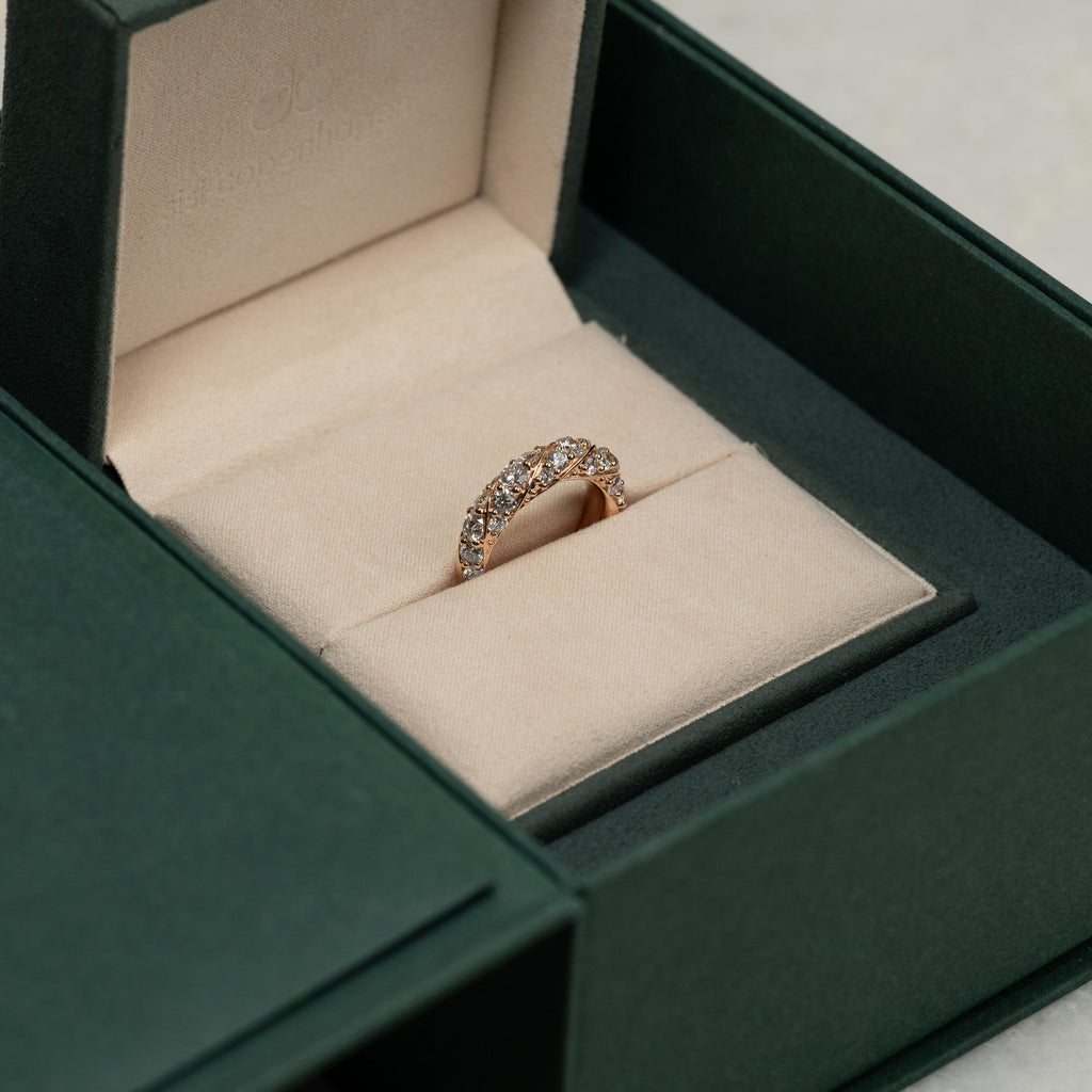 The ring is designed in 18 kt. solid rose gold and features an elegant twisted eternity setting, where the diamonds gracefully follow the curved shape of the band. The organic shape gives the ring a soft, exclusive expression, allowing the light to move beautifully across the stones and enhance their natural brilliance from every angle. The ring has a total weight of 2.64 ct., and the diamonds are graded E/F (River) in colour and VVS1 in clarity.