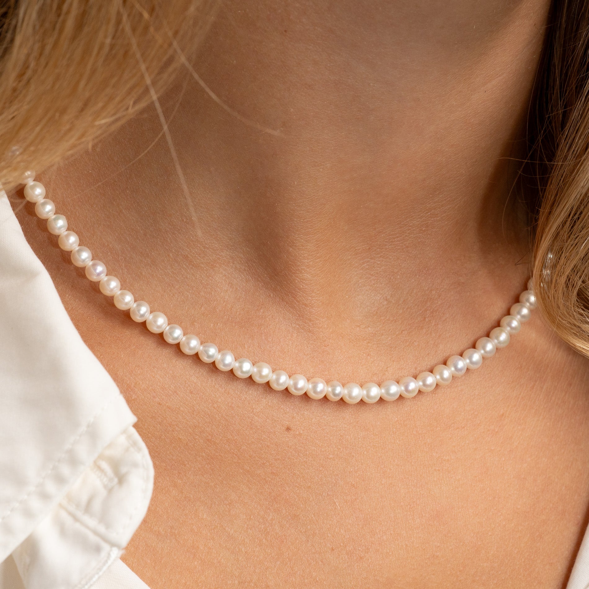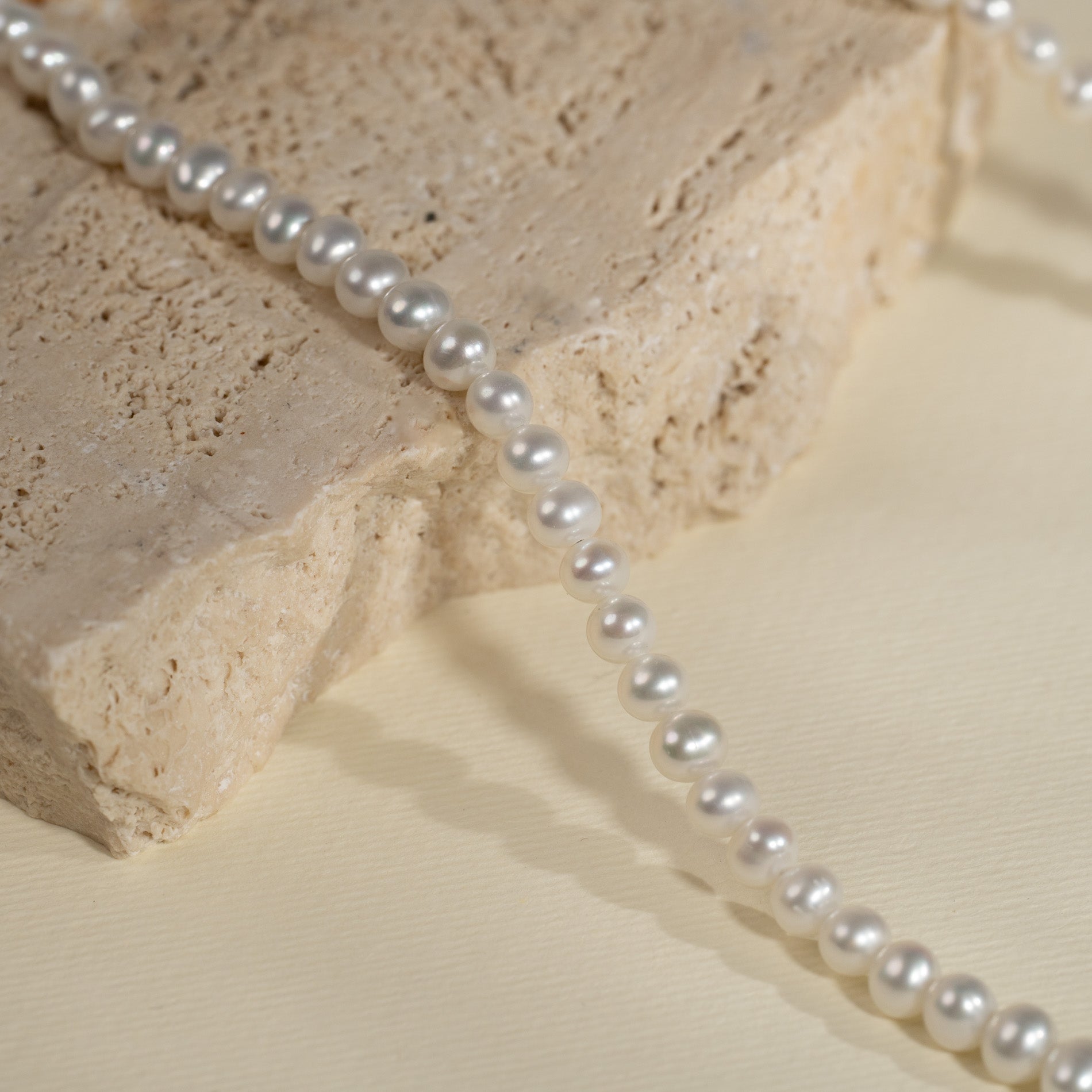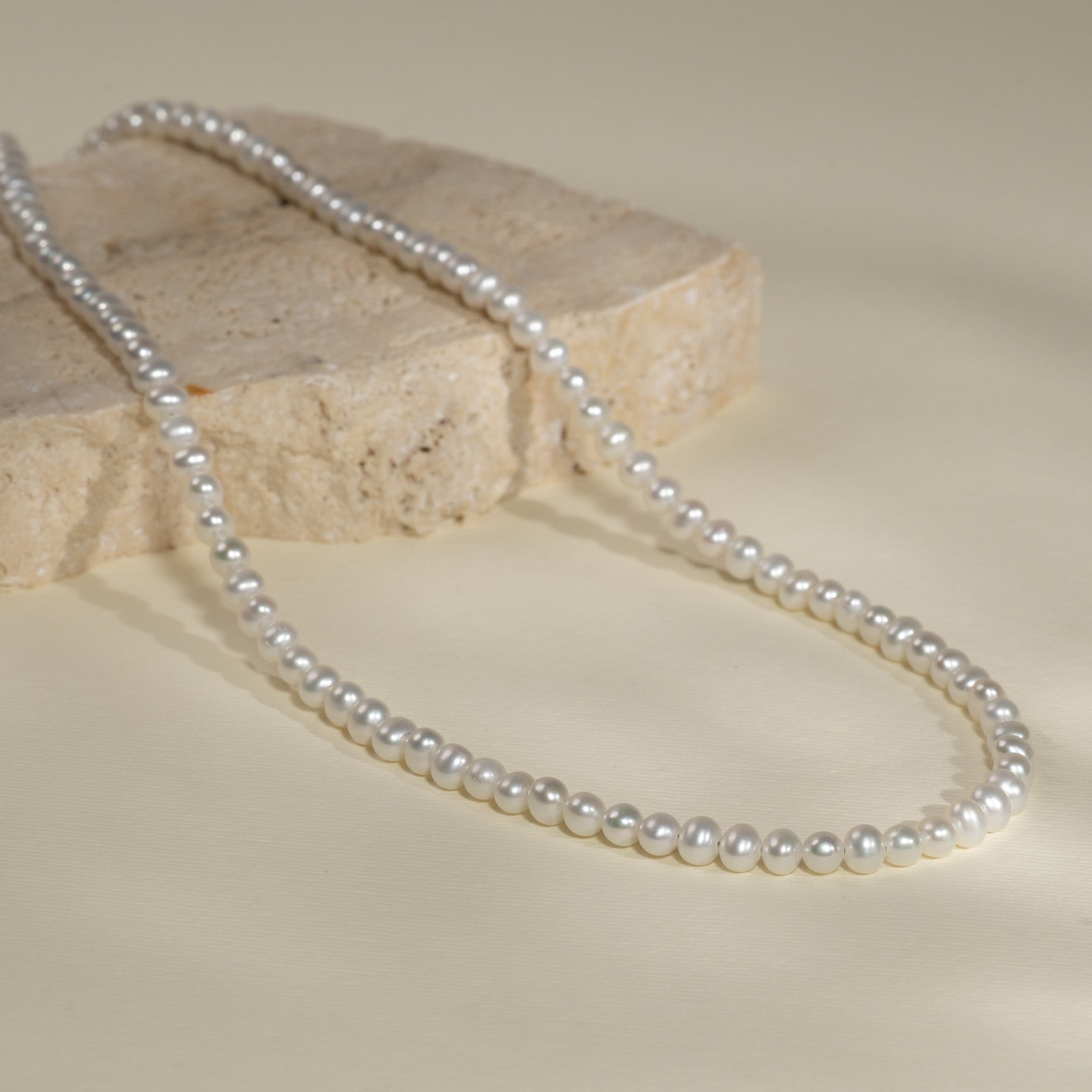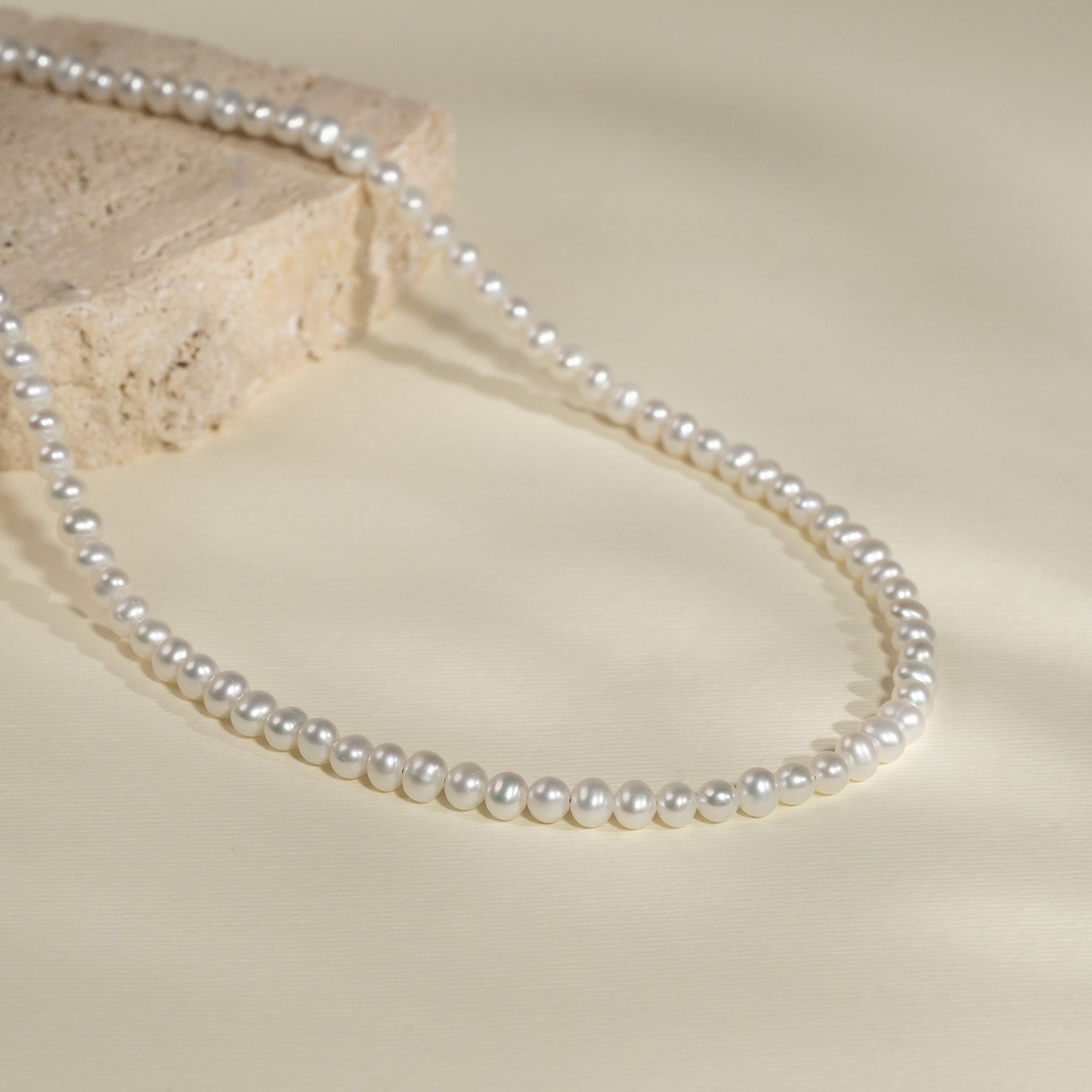 The necklace is a timeless piece of jewelry that never goes out of style. It suits both everyday wear and special occasions, and the small white freshwater pearls add an elegant and feminine expression.