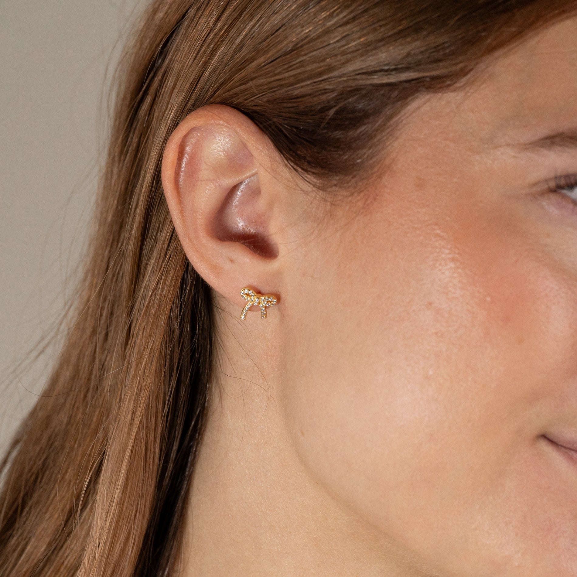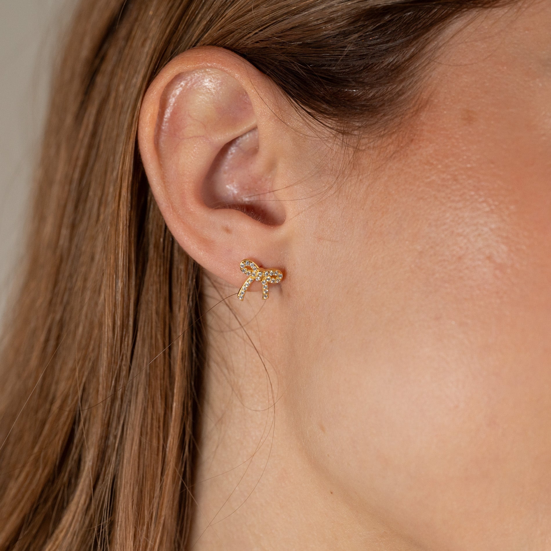 Stud earrings with a bow motif made from 100% recycled 18 karat gold-plated sterling silver with clear white zirconia stones.