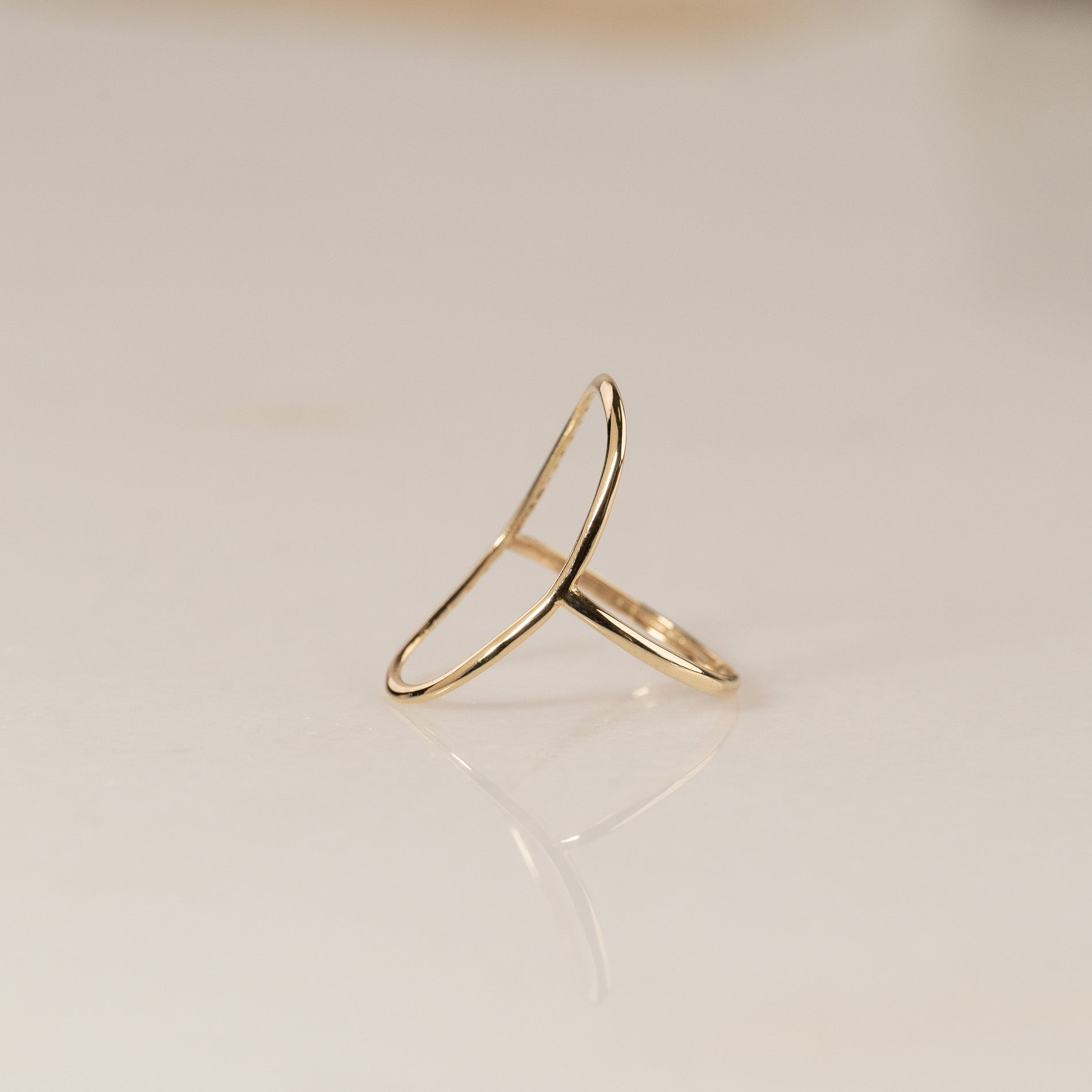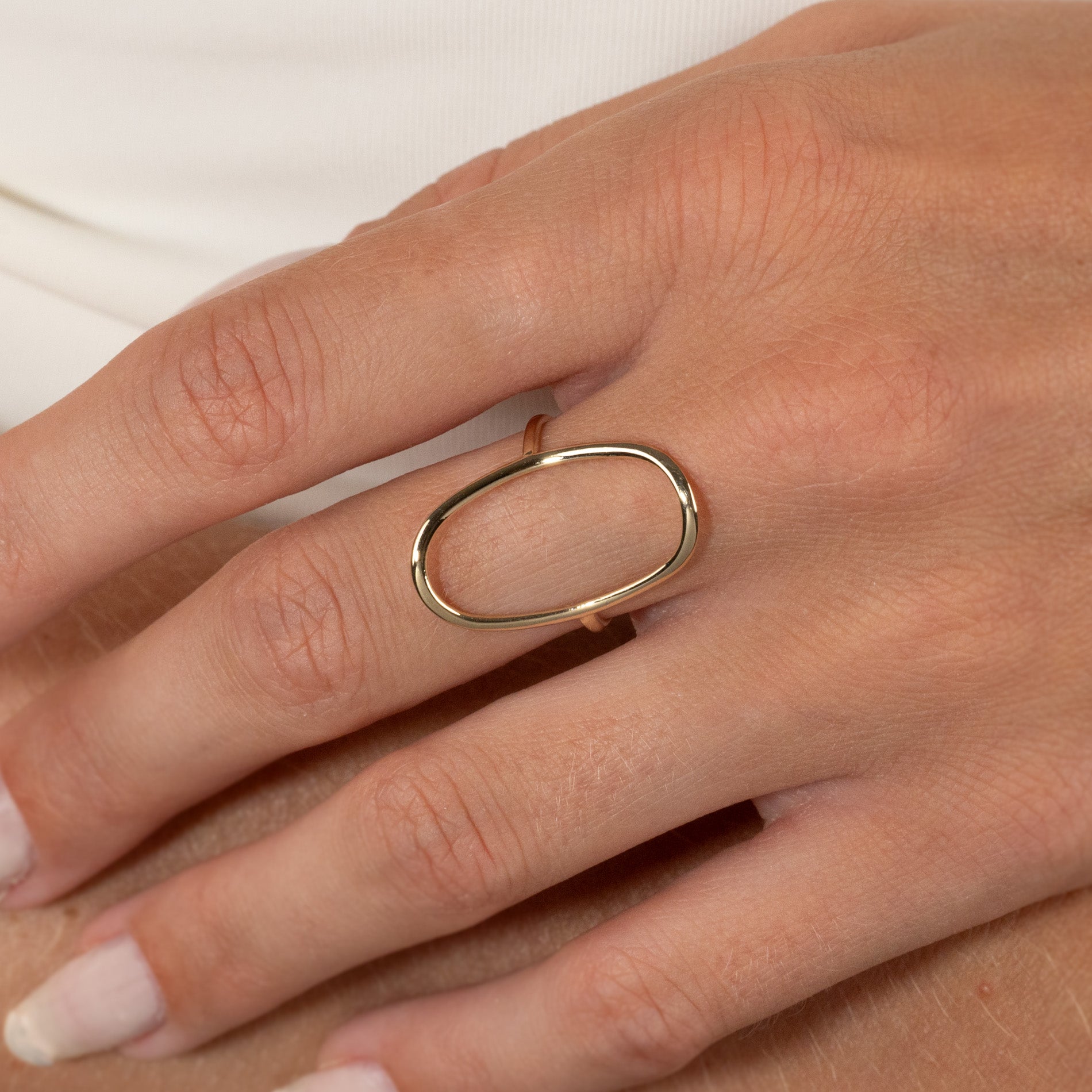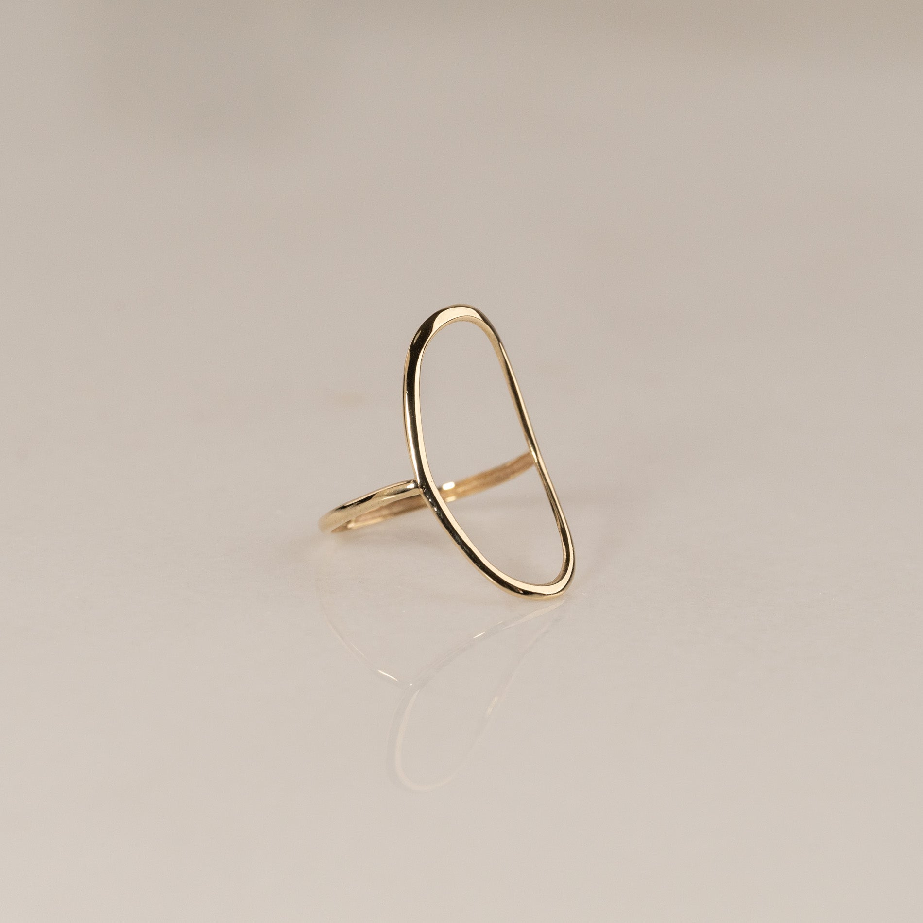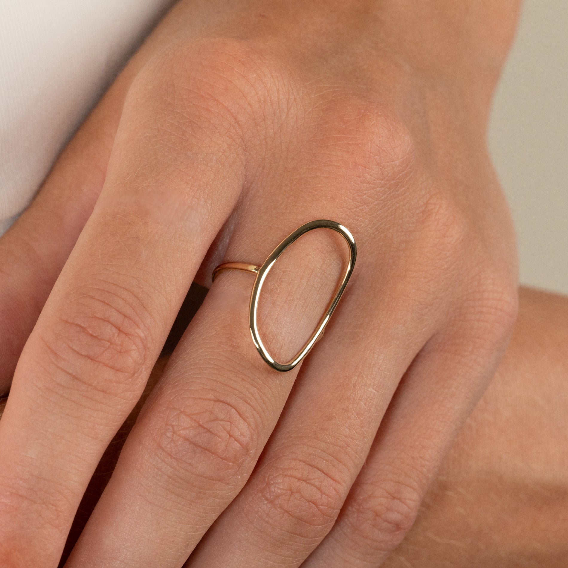 The ring is designed with a large open oval that closely shapes the finger. The open oval creates a unique expression that stands out from other gold rings. The oval measures approximately 25 x 15mm.
