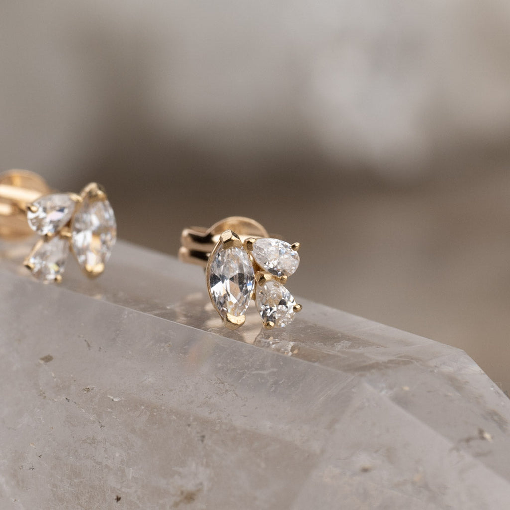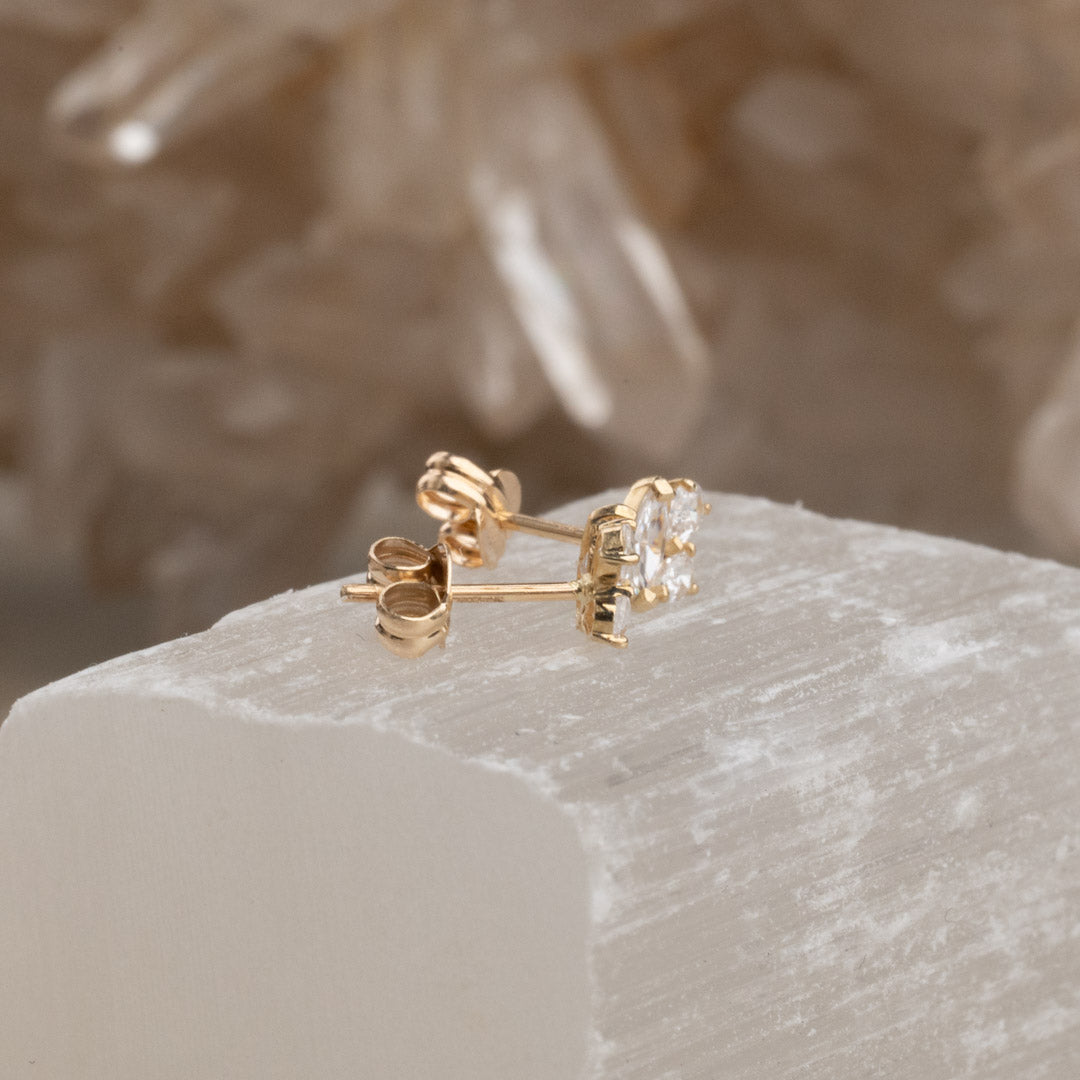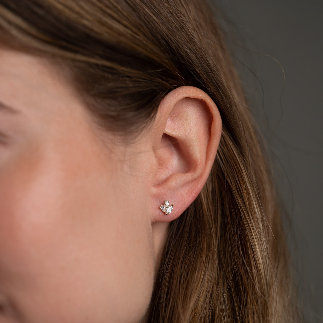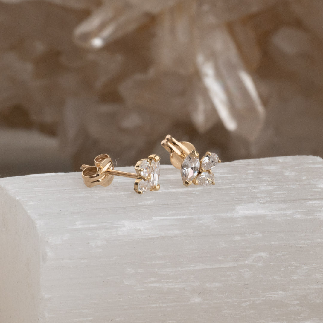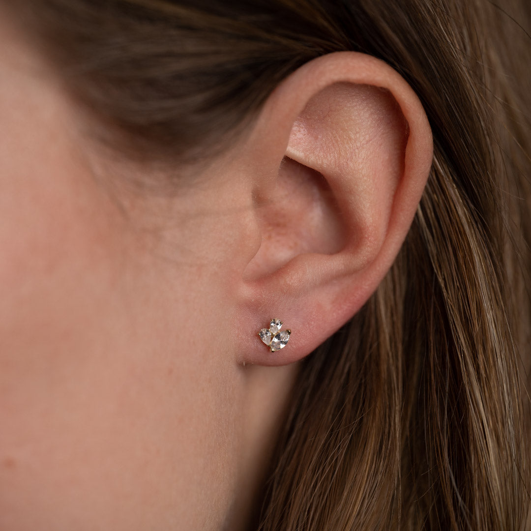 Solid 9 carat gold stud earrings. The earring features three white oval zirconias and closes with a butterfly back.