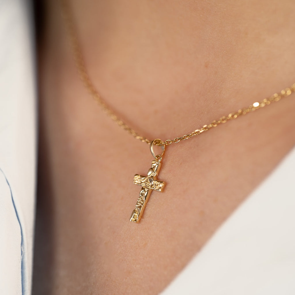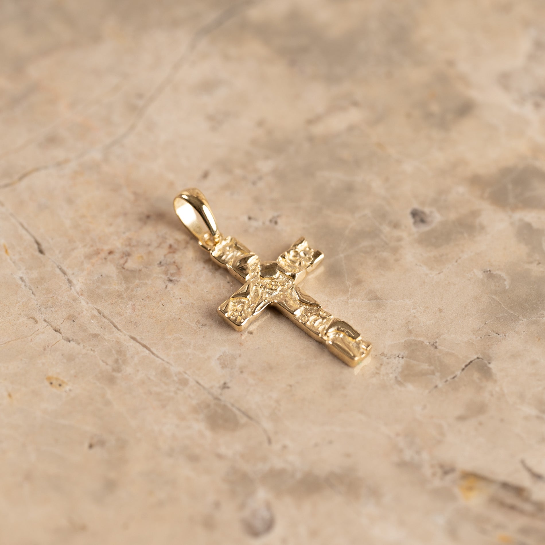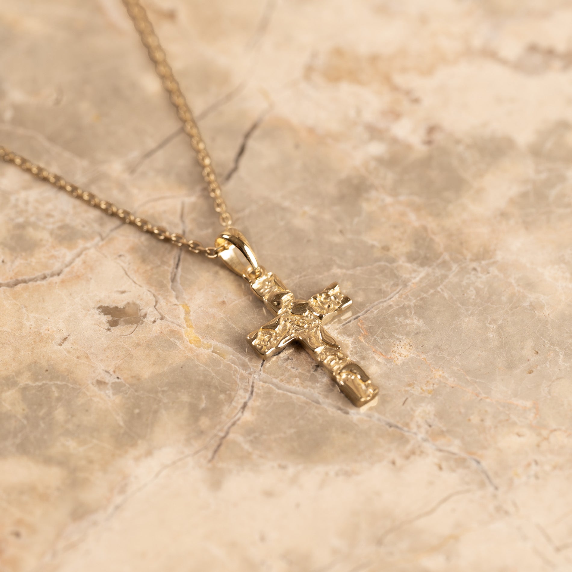 This pendant is made of 100% recycled solid 9-karat gold. The pendant is a modern twist on a classic piece of jewelry; the cross has a 'melted' surface, which gives the pendant fine details and a more rustic look. Perfect if you want a Christian symbol that still has a modern expression. A great confirmation gift for both boys and girls.