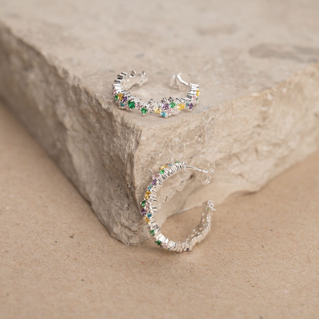 Our clair earrings are made in 925 sterling silver with a lot of small colored zircons set in an asymmetrical structure. This unstructured design makes the earrings exciting and organic, while the glittering zircons in blue, green, purple and yellow colors create a colorful but at the same time sofisticated and elegant jewelry.
