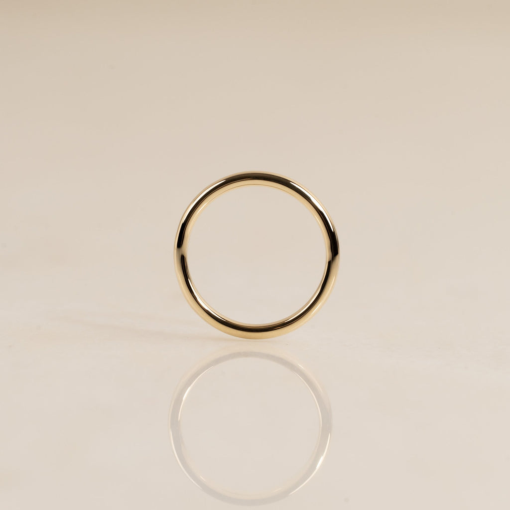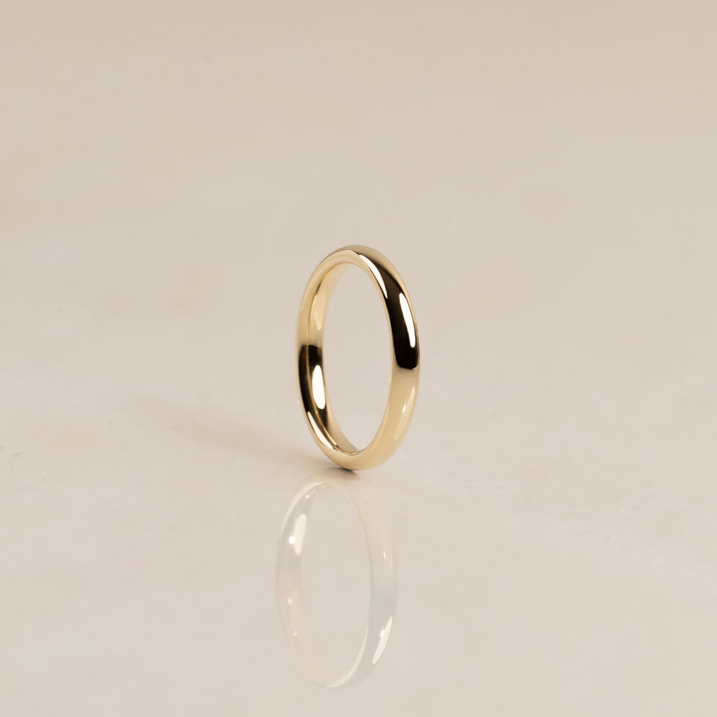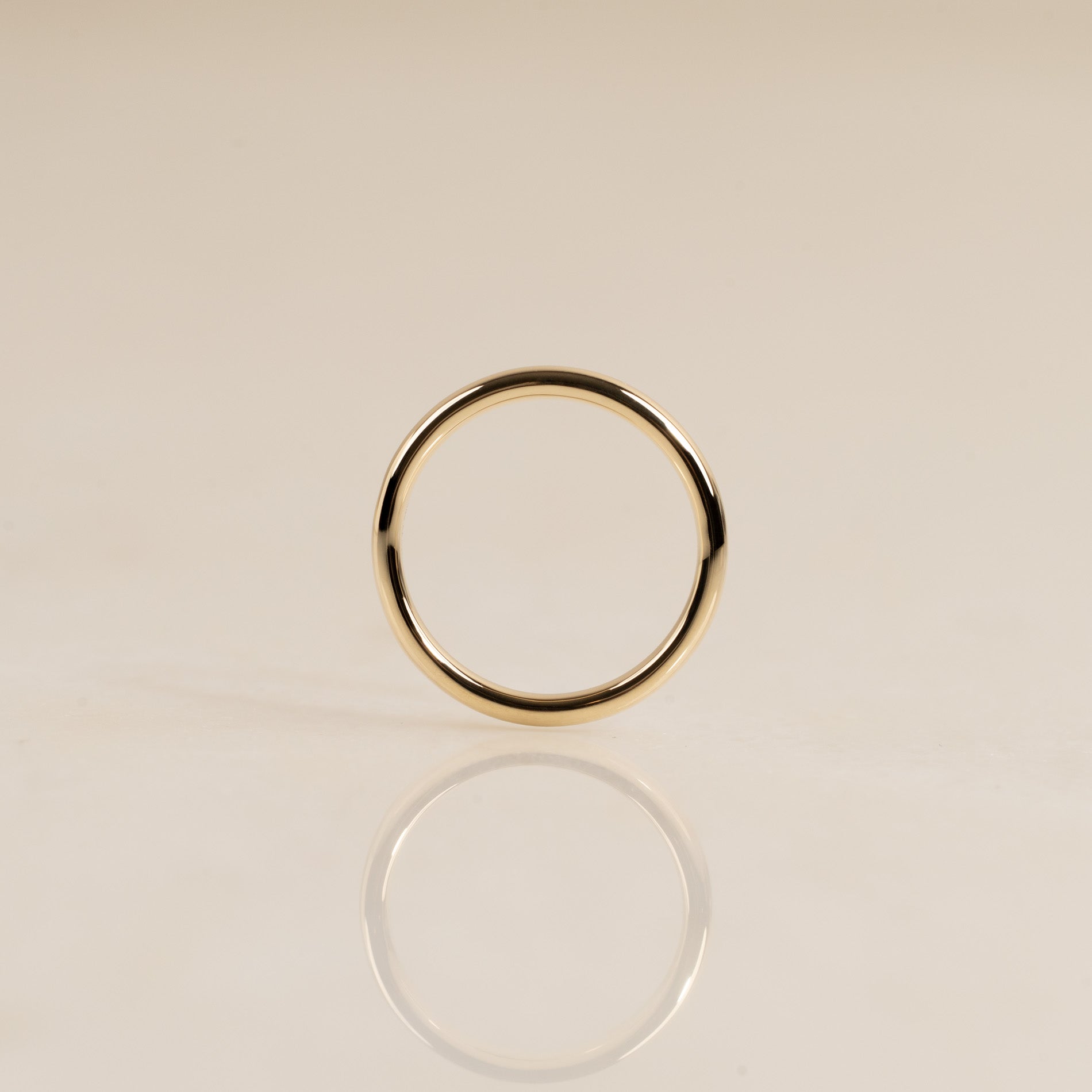 Wedding band in 14 karat gold in a classic and elegant court profile. This profile is softly rounded on both the inside and outside, offering a smooth and comfortable fit for everyday wear.