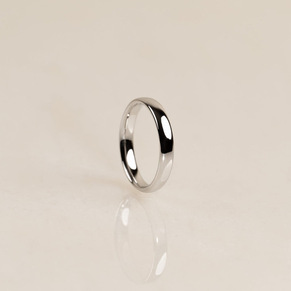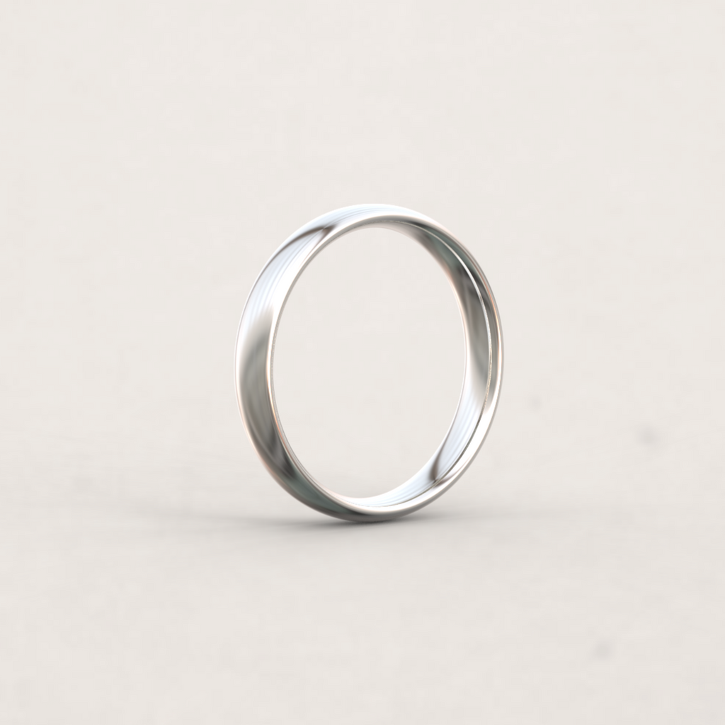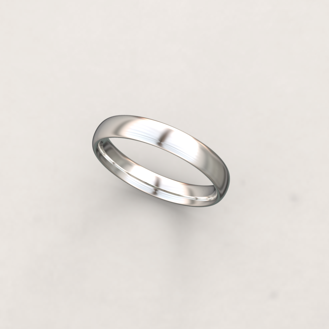 The D-shape has a flat interior and a softly curved exterior, creating the signature ‘D’ silhouette. It’s a traditional wedding band profile with a timeless feel.