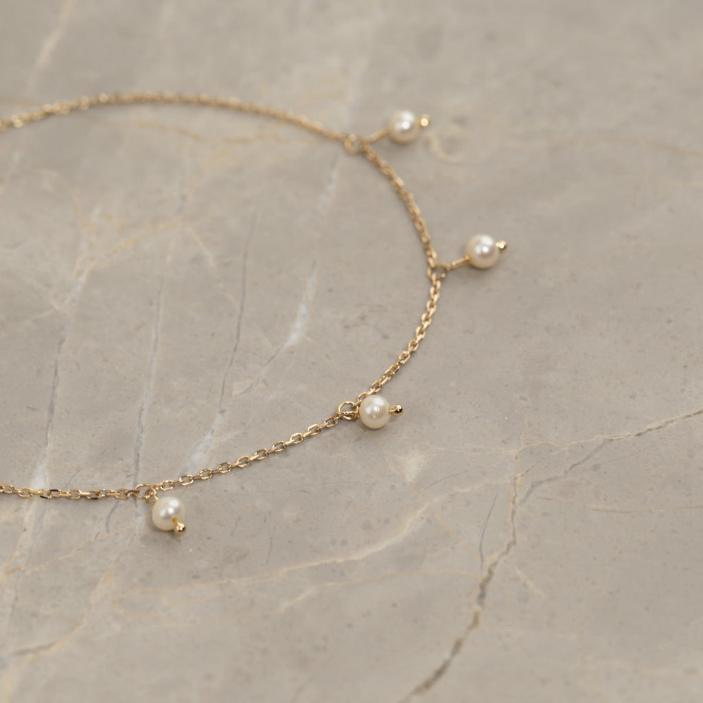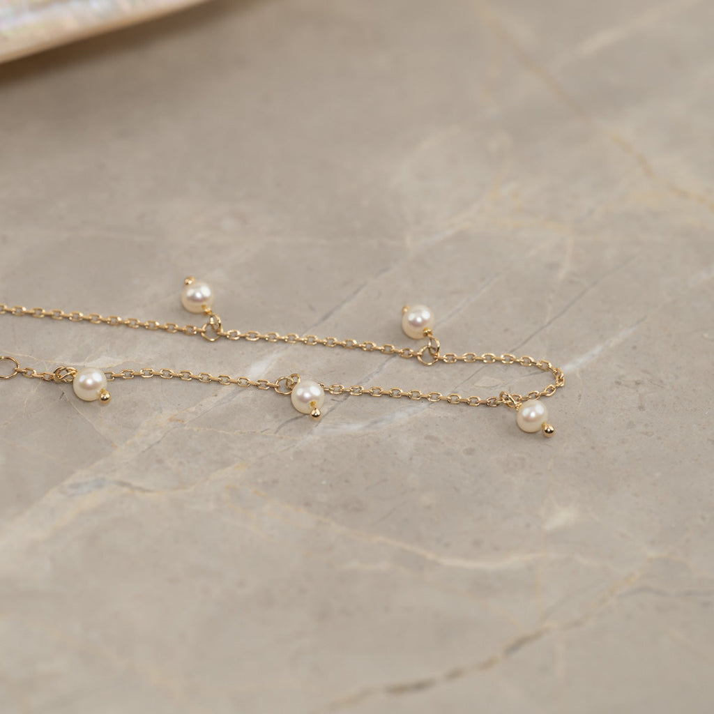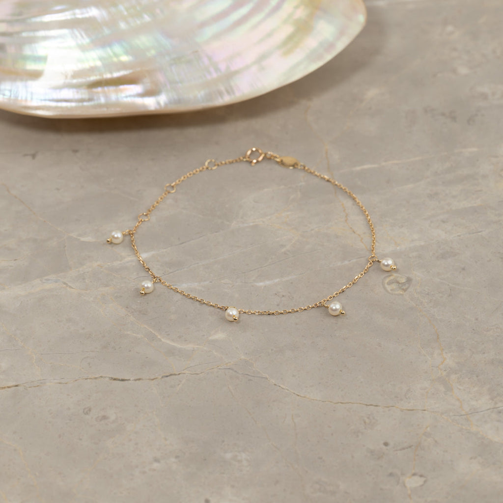 This bracelet is made of 100% recycled solid 9 karat gold. The bracelet is designed as a fine anchor chain with 5 small pendants, each featuring a 2.5-3mm white freshwater pearl. The bracelet has an elegant and feminine expression that can easily be combined with our other beautiful bracelets or worn alone.