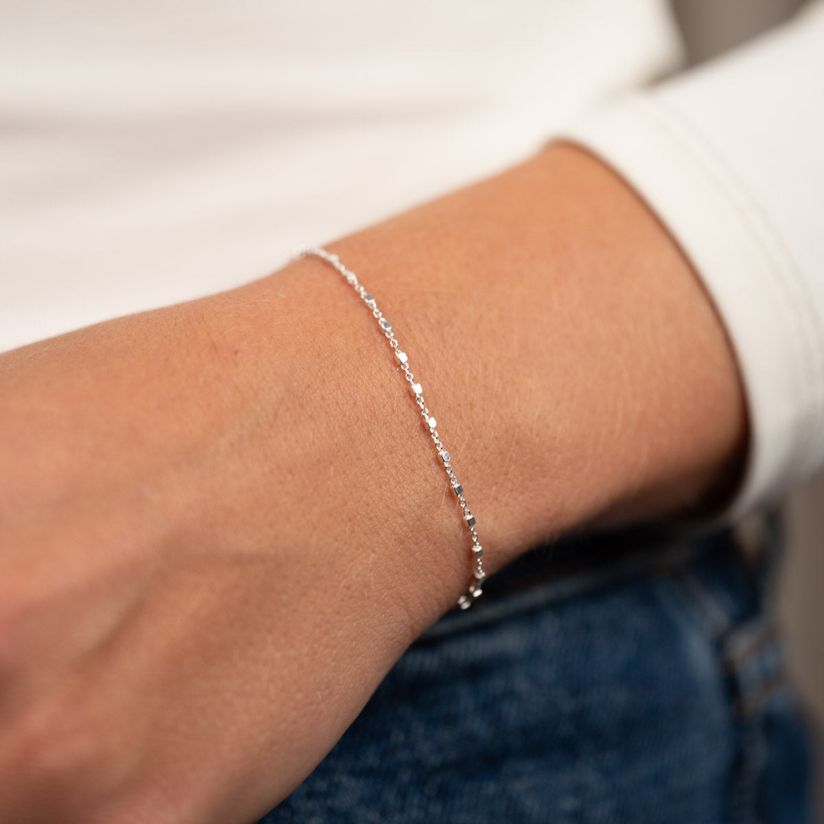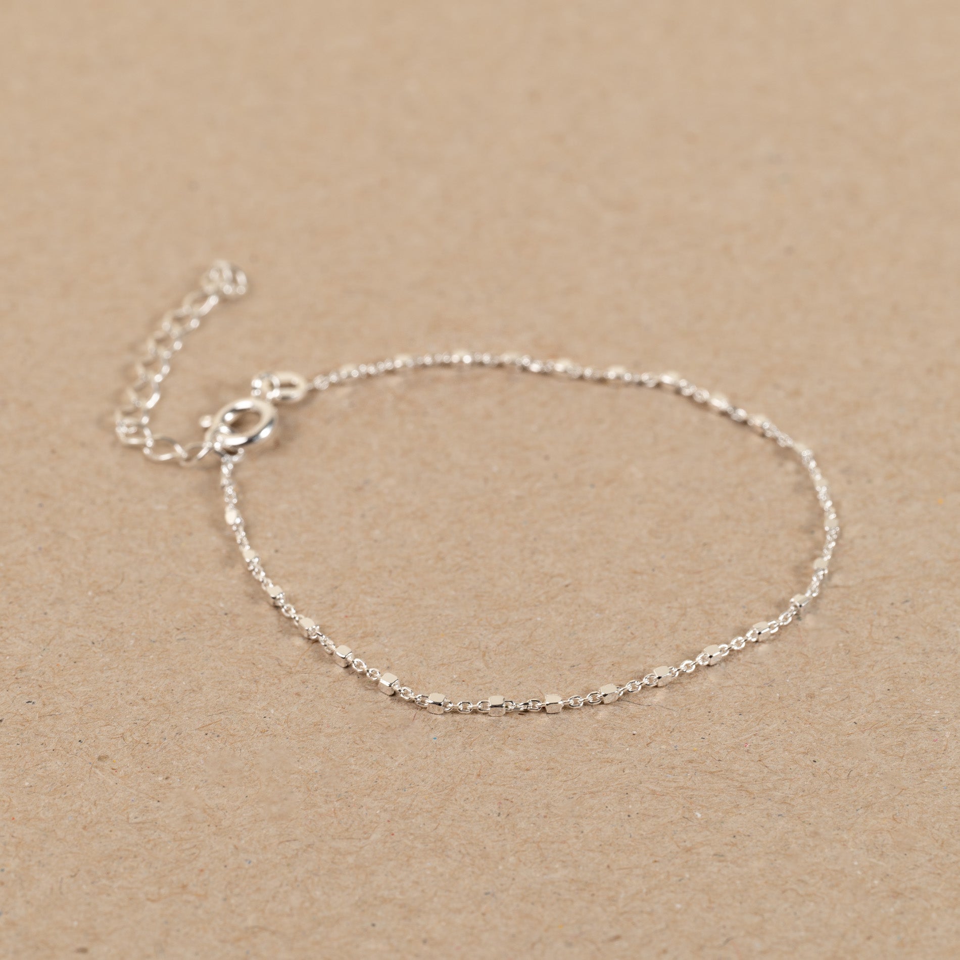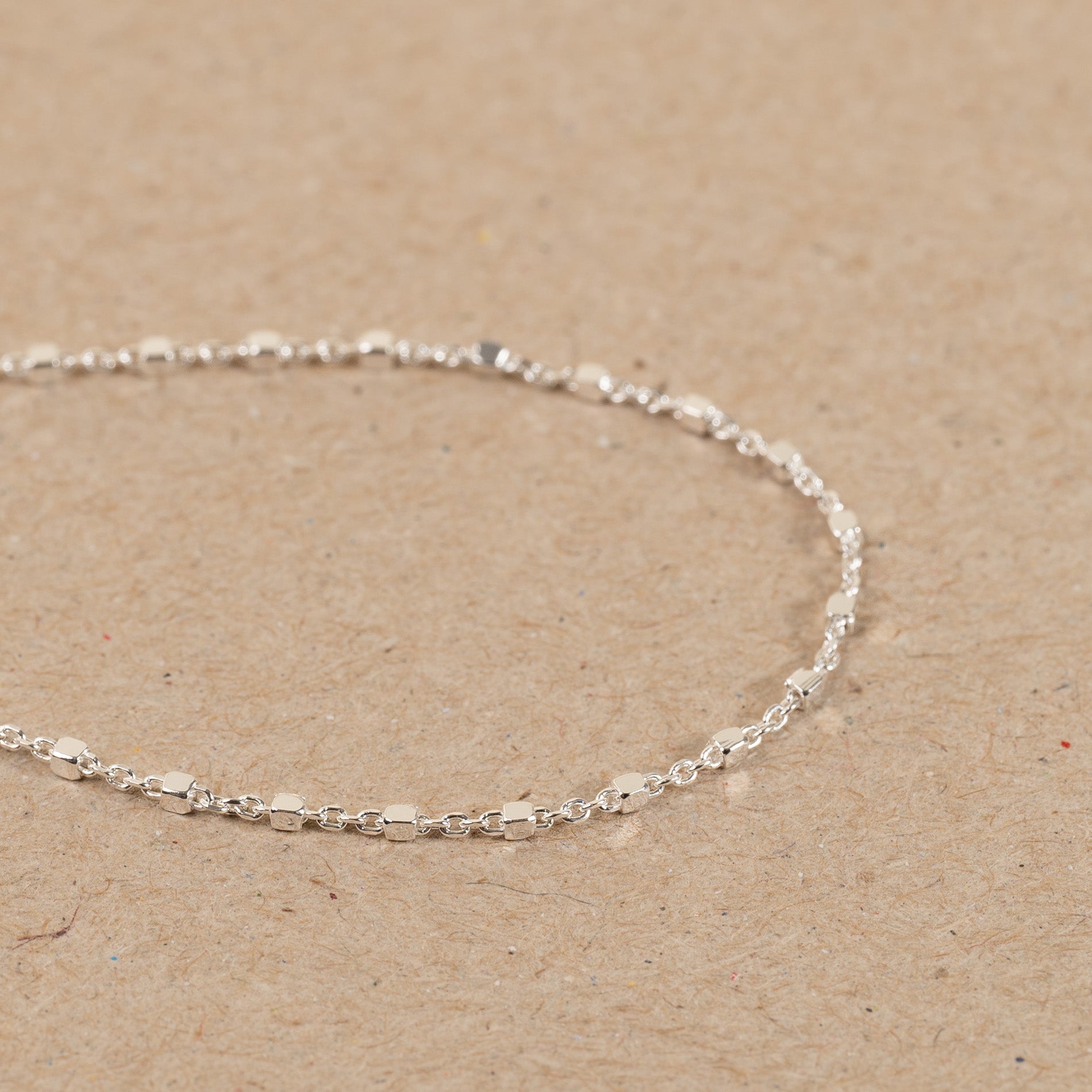 The fine delta bracelet is made of 100% recycled 925 sterling silver. The chain is designed with small anchor joints composed with a small square joint that makes the bracelet feminine, adds unique details and creates a fine pattern. The little cubes have blank sides that make light reflections in the chain closest to it to gleam.
