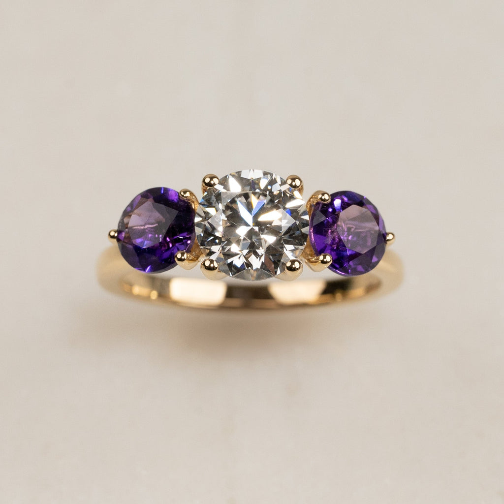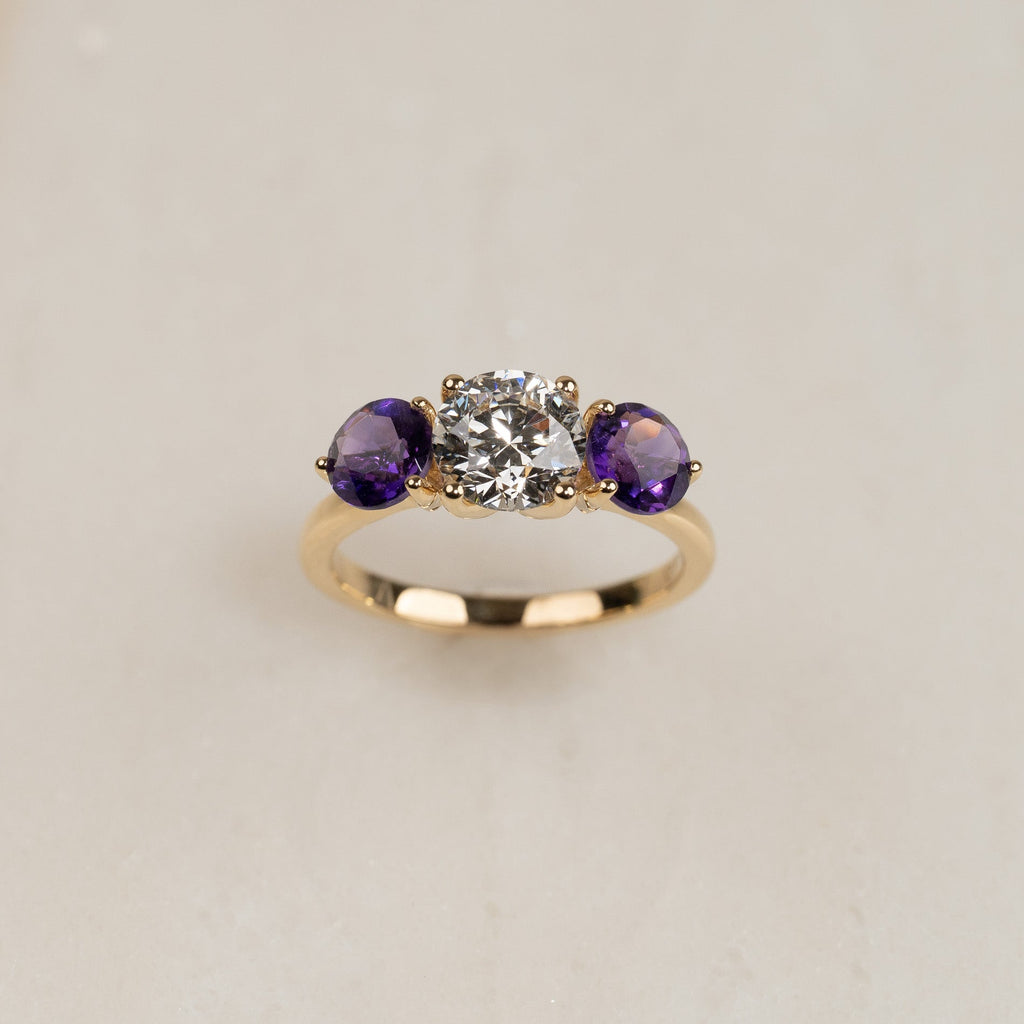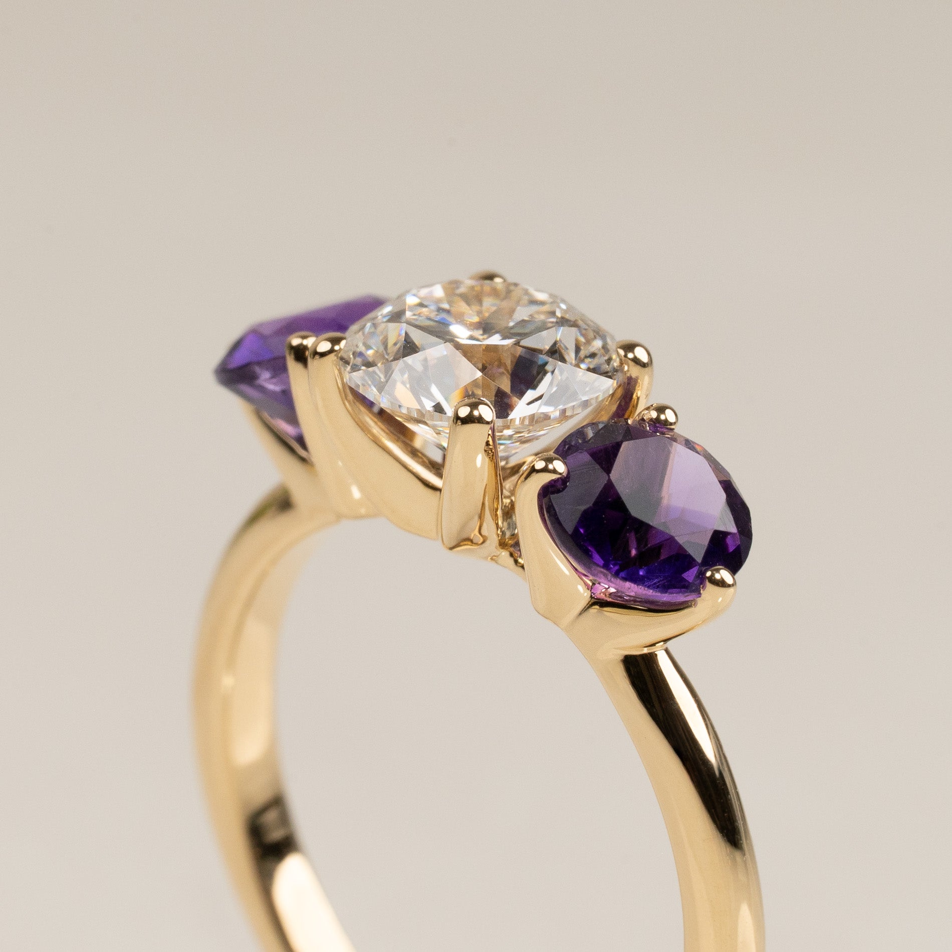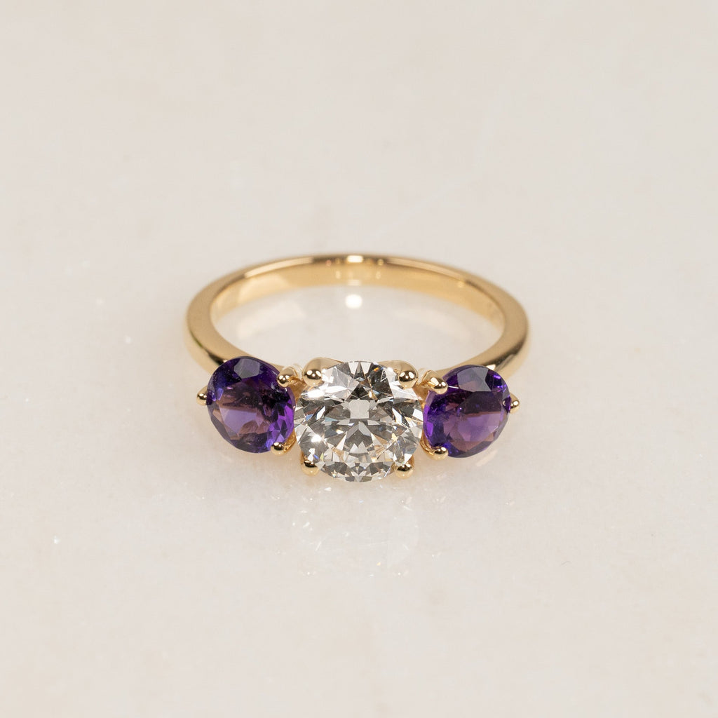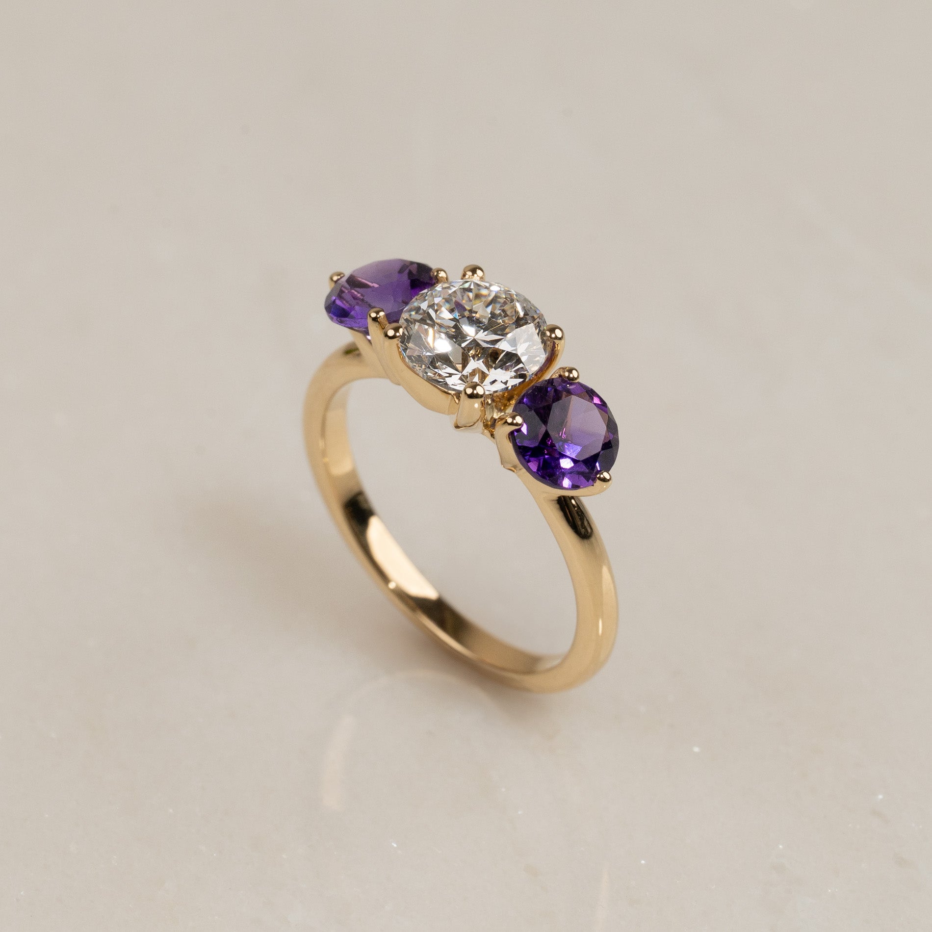 The ring is crafted in 18 kt solid gold with a beautiful play of colors and an elegant expression. The sparkling 1.5 ct center diamond is framed by two deep purple amethysts, which add both depth and character to the design. The interplay between the clear diamond, the colorful amethysts, and the warm gold results in a ring that appears both personal and sophisticated.