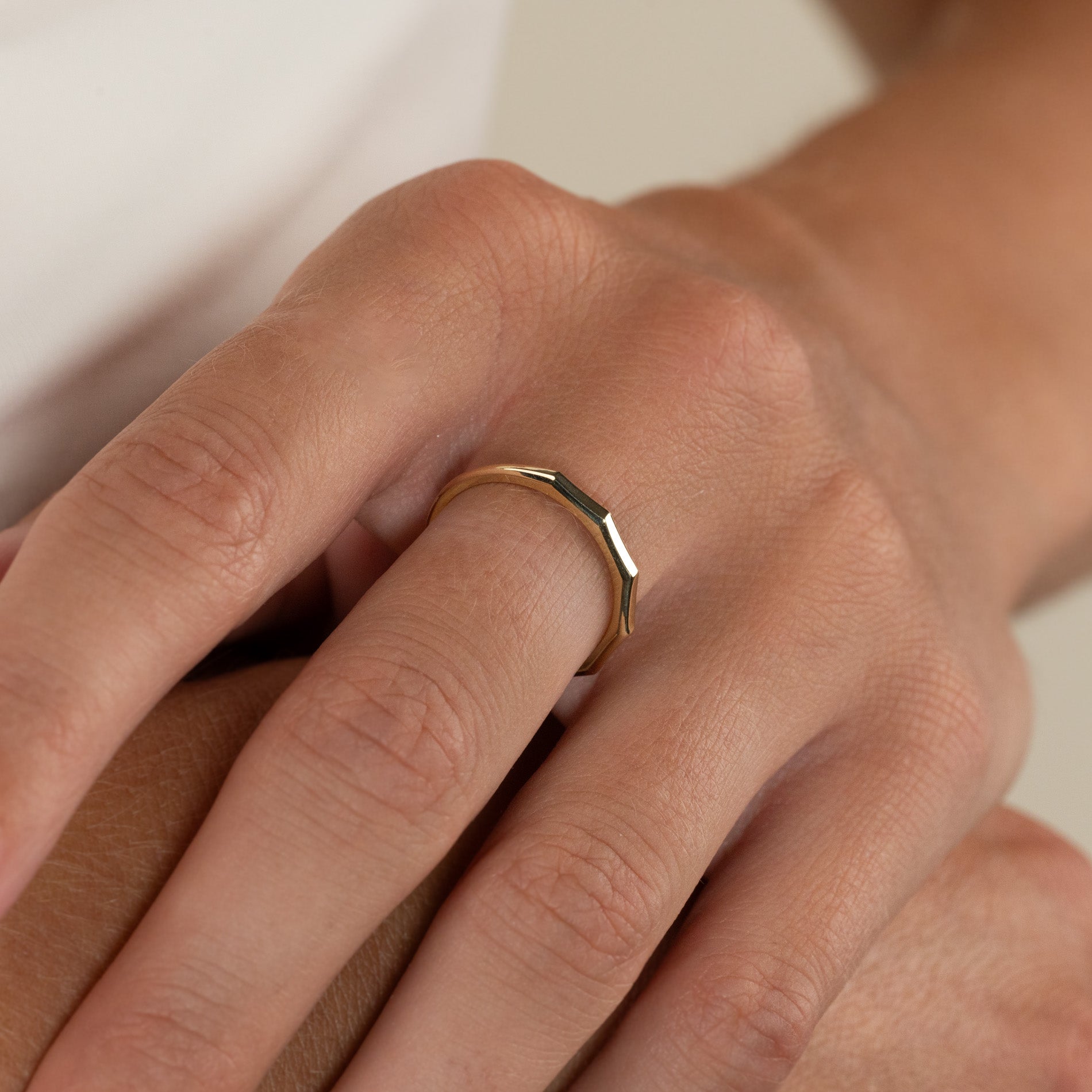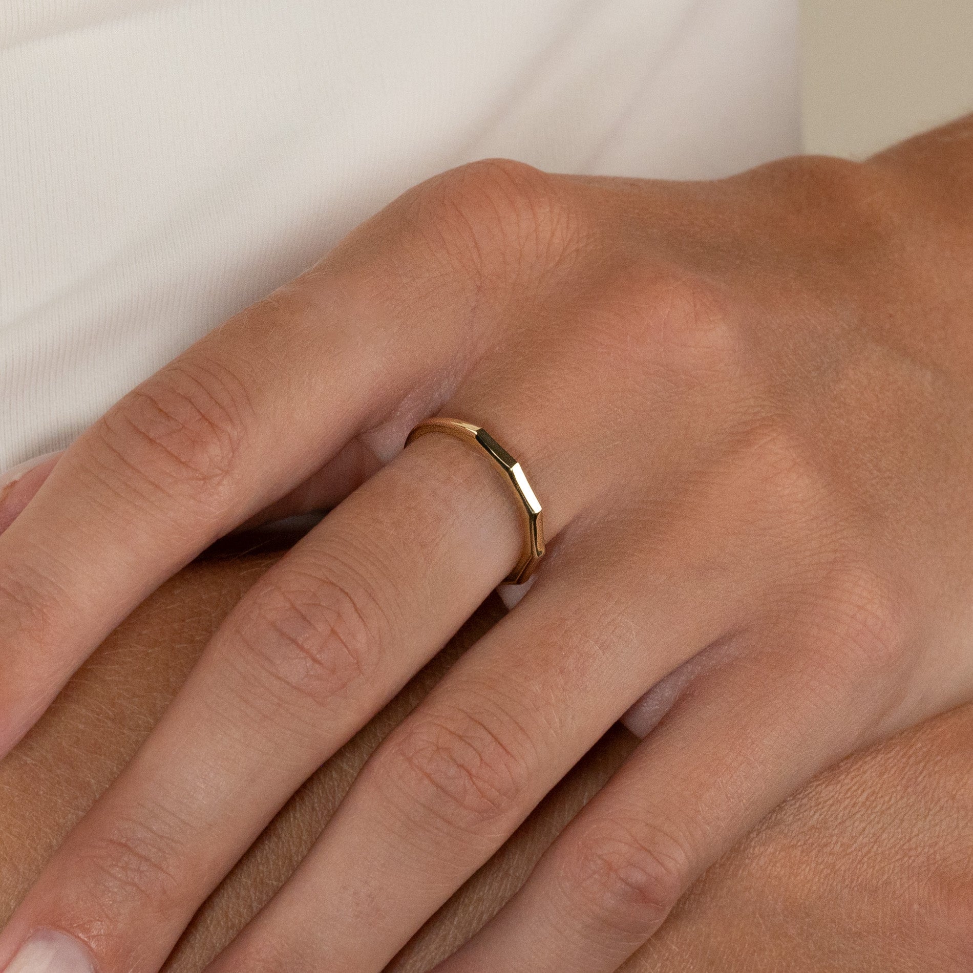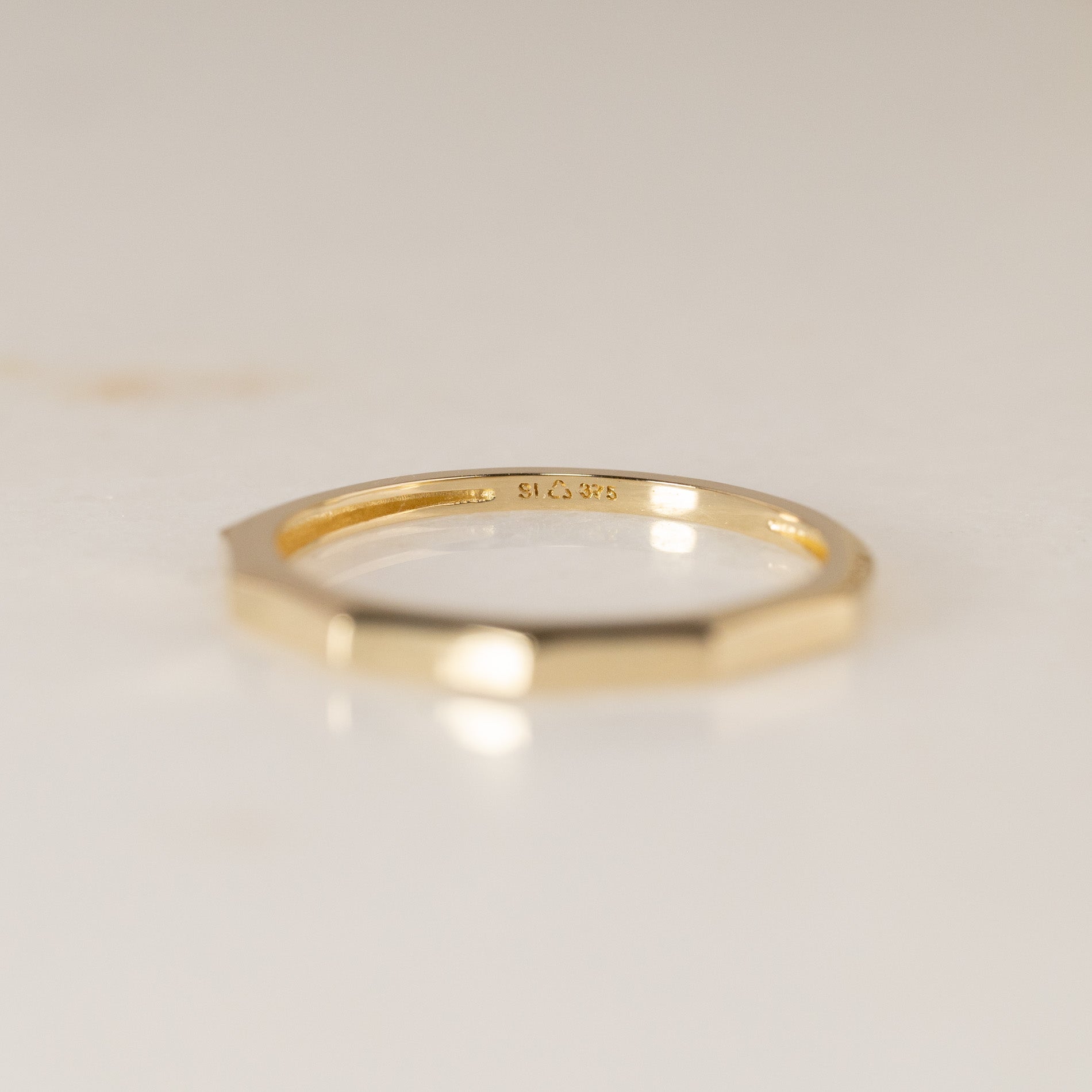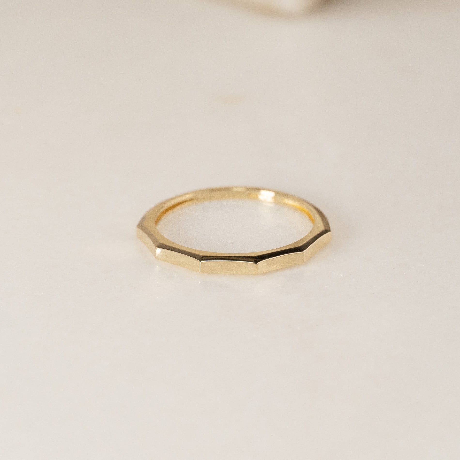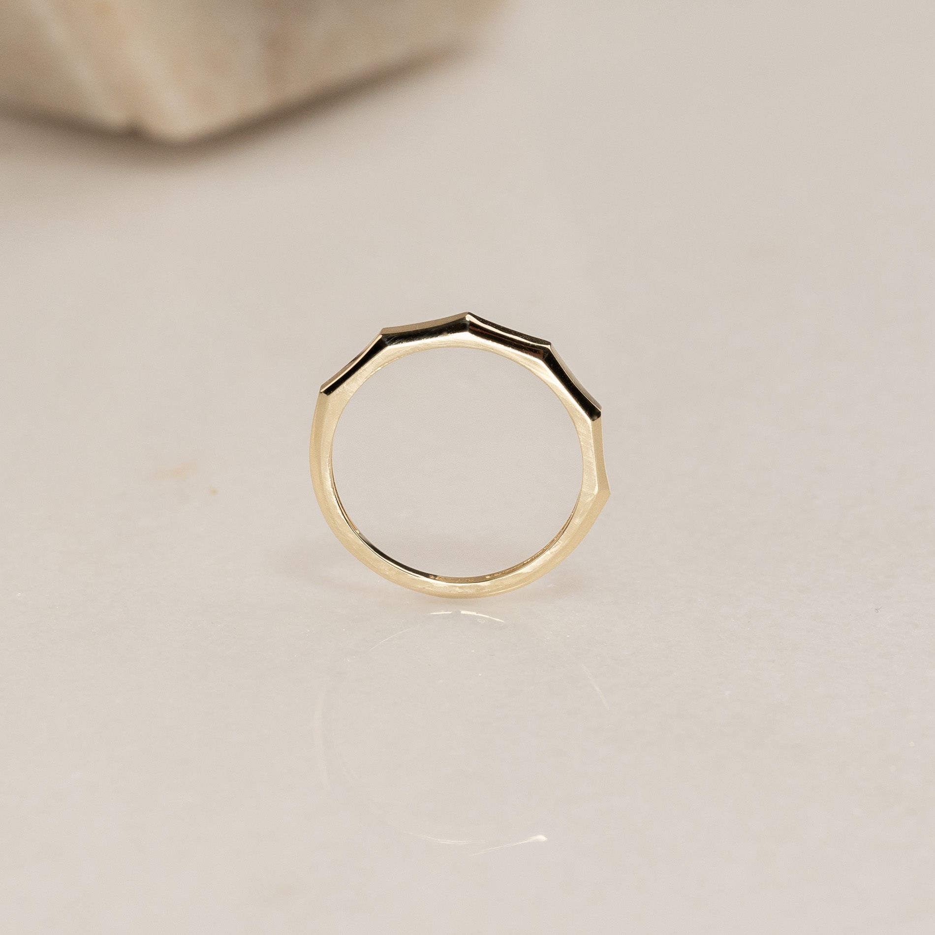 The ring is crafted from 100% recycled 9 karat solid gold. It features a faceted top with five flat surfaces that together form the upper half of the ring.