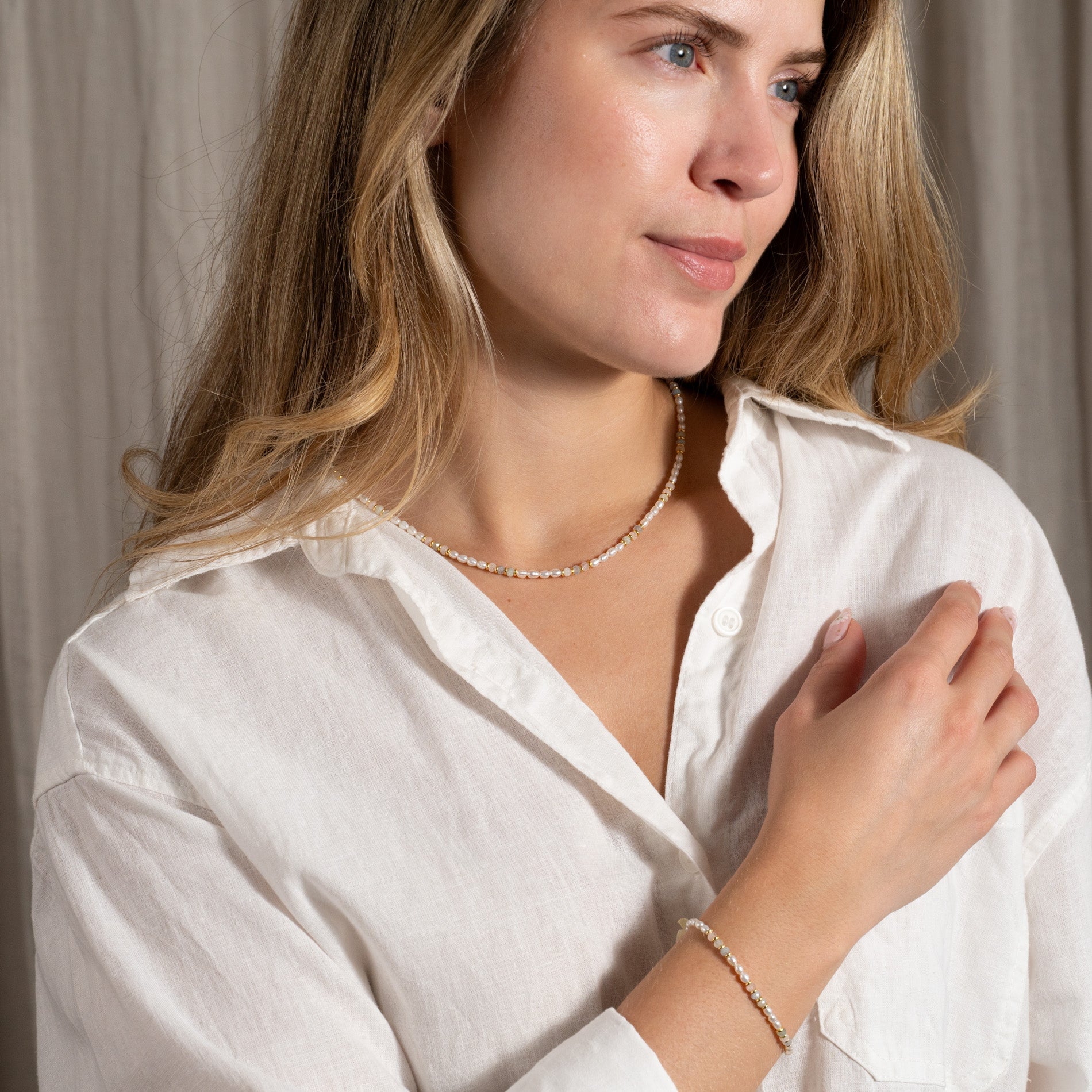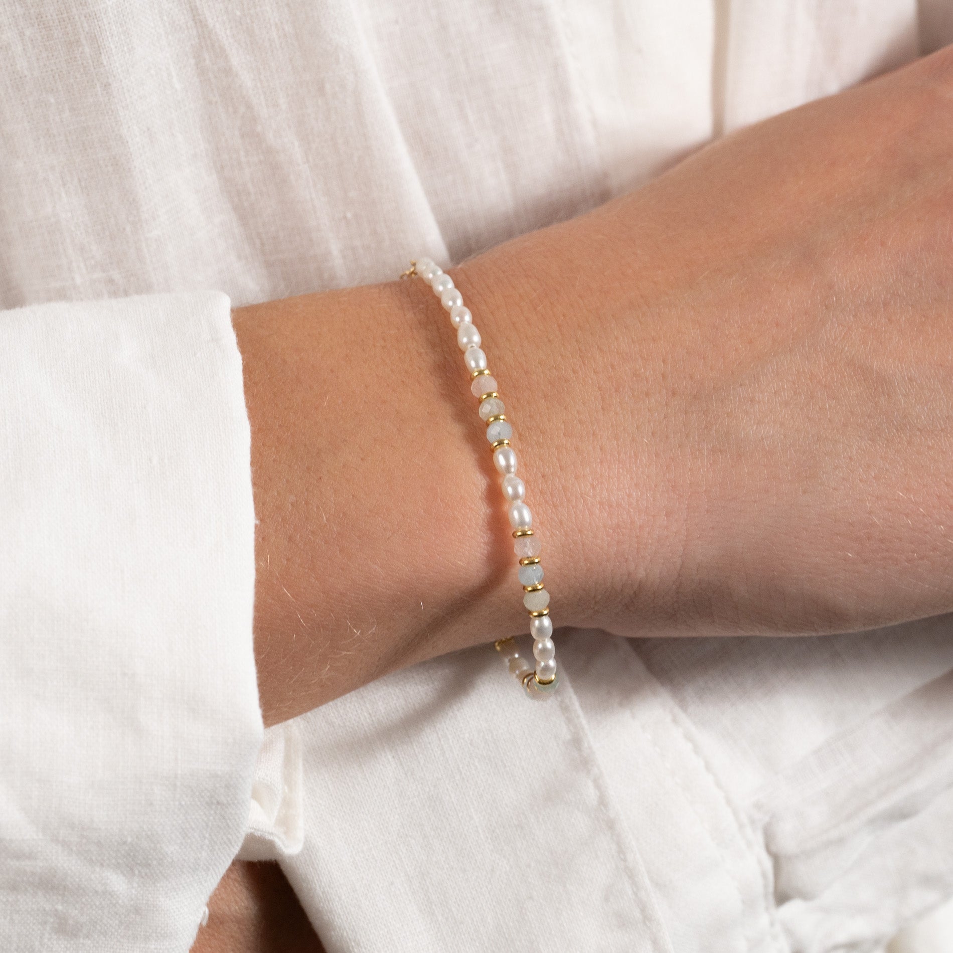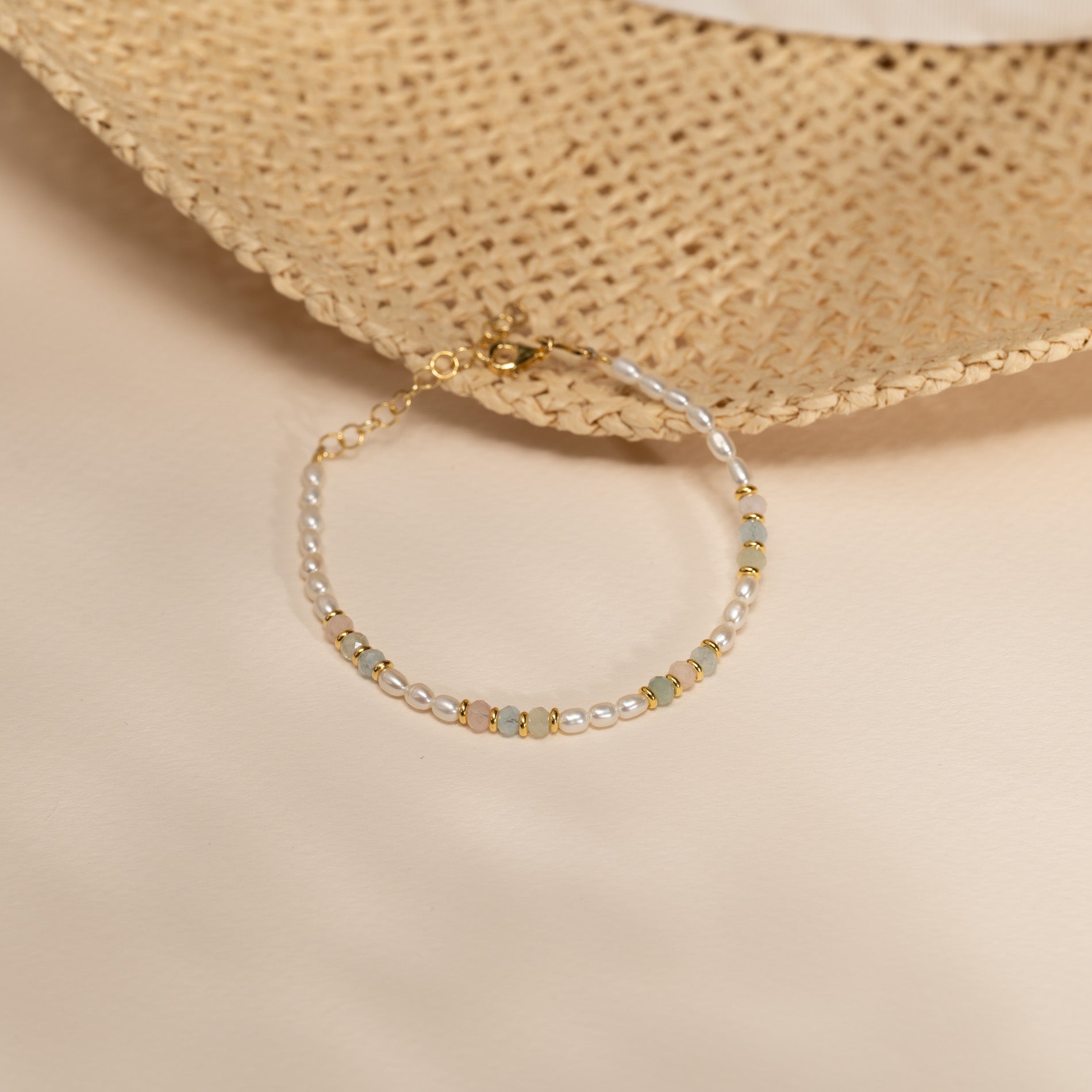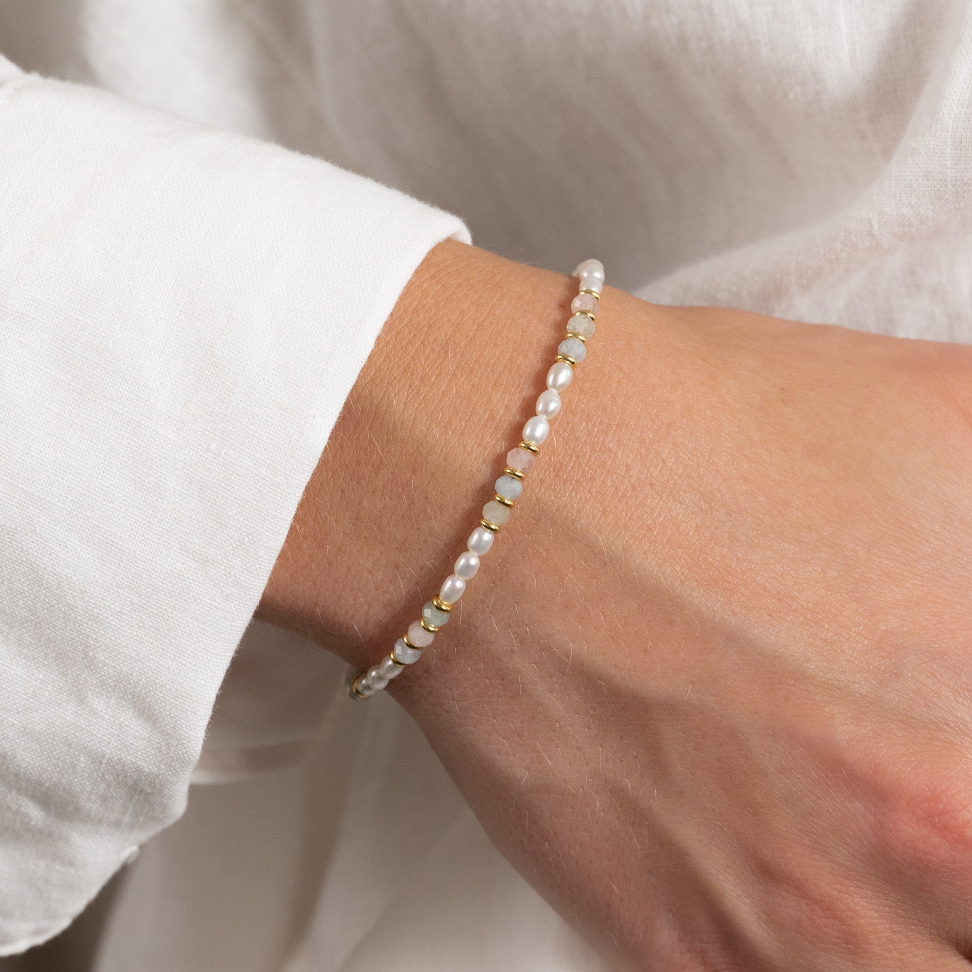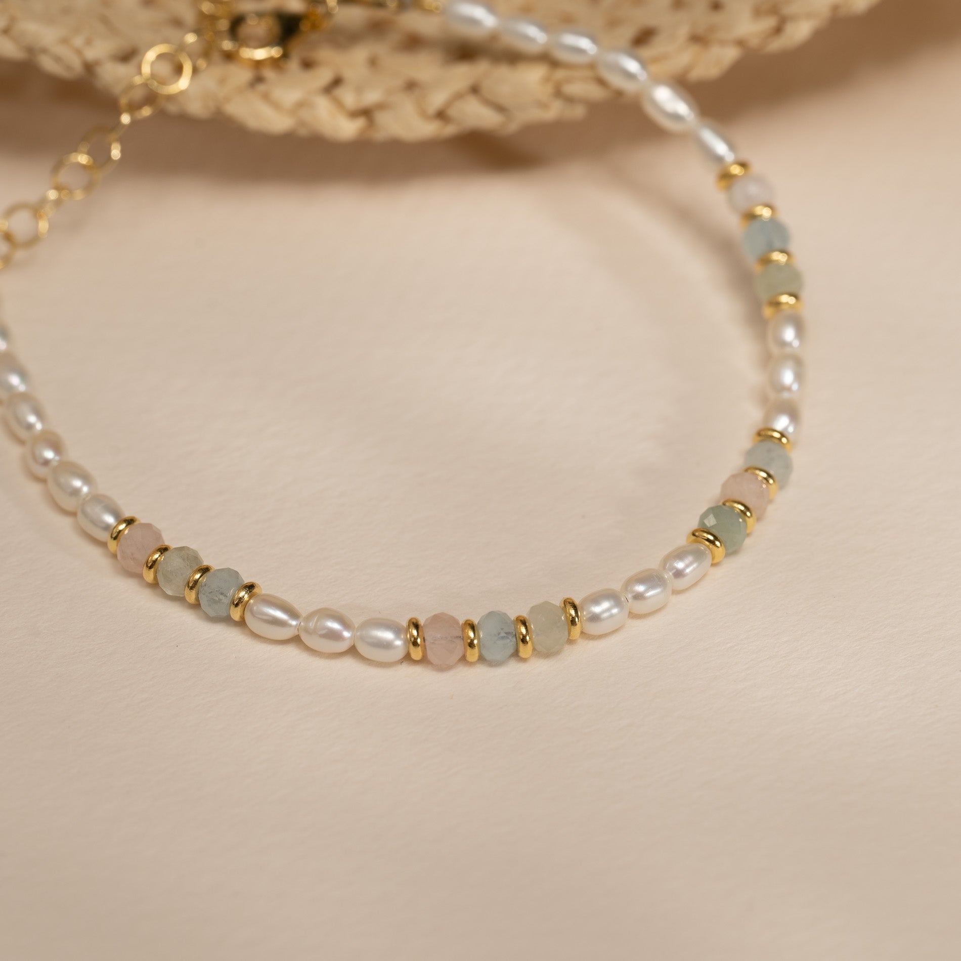 Bracelet made from 100% recycled 18-carat gold-plated sterling silver with oval white freshwater pearls and morganite stones in beautiful light pastel colors.
