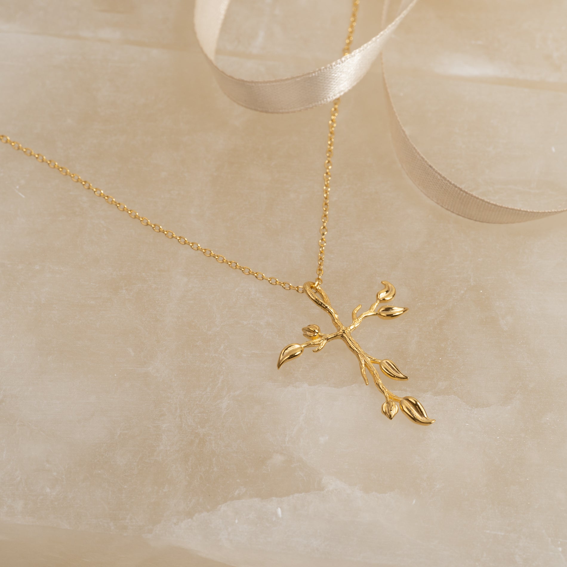 Cross pendant with tree-inspired details in 100% recycled 18 karat gold-plated sterling silver.