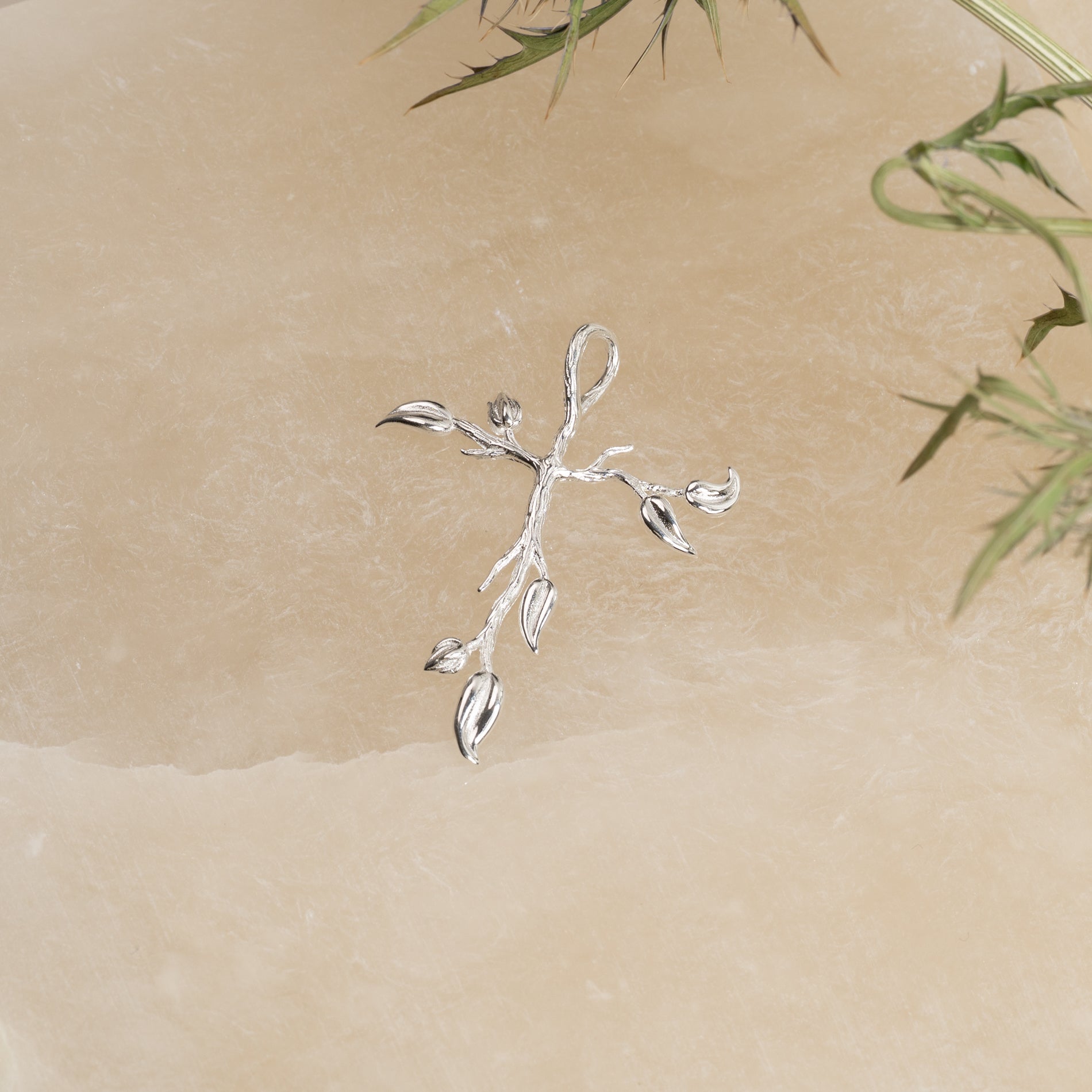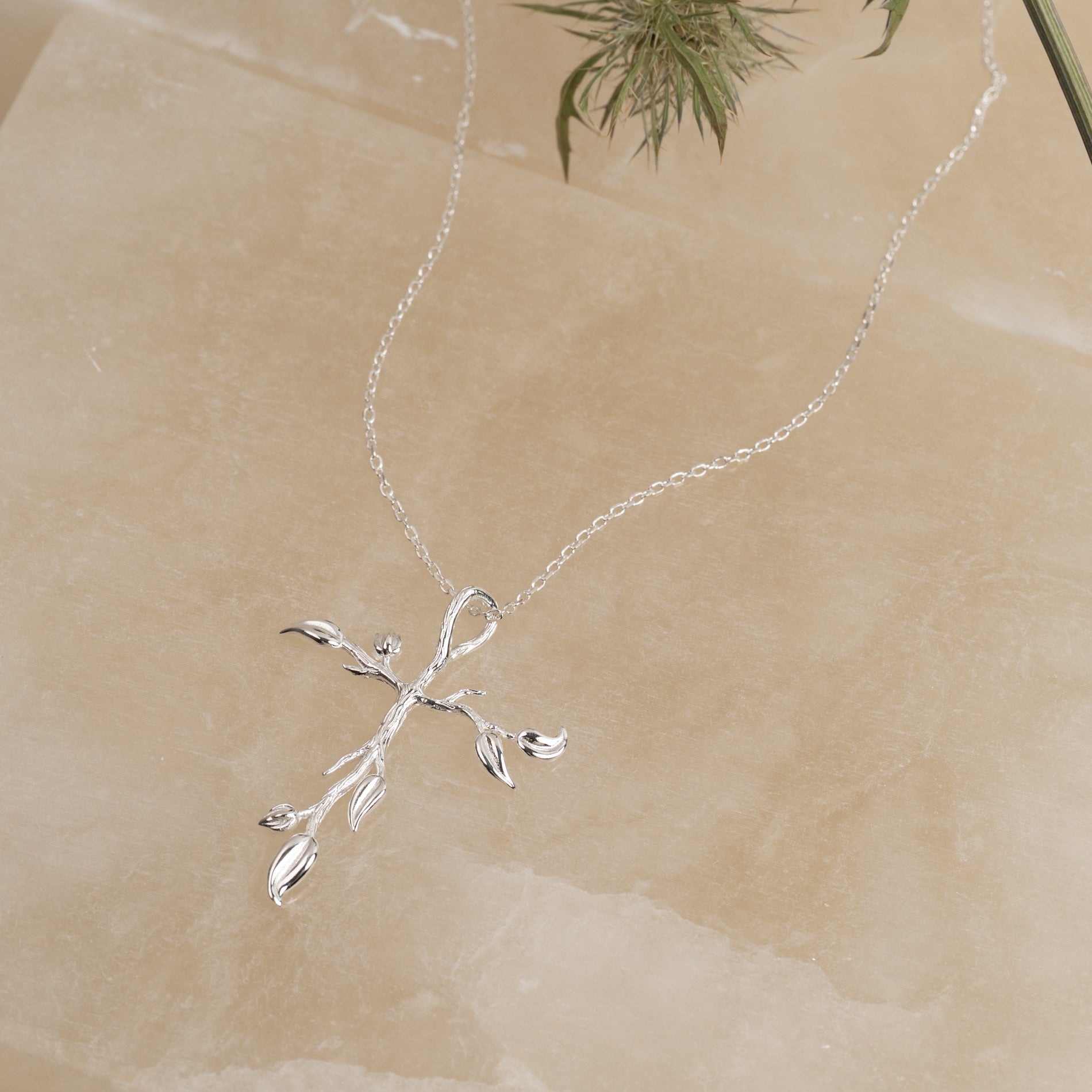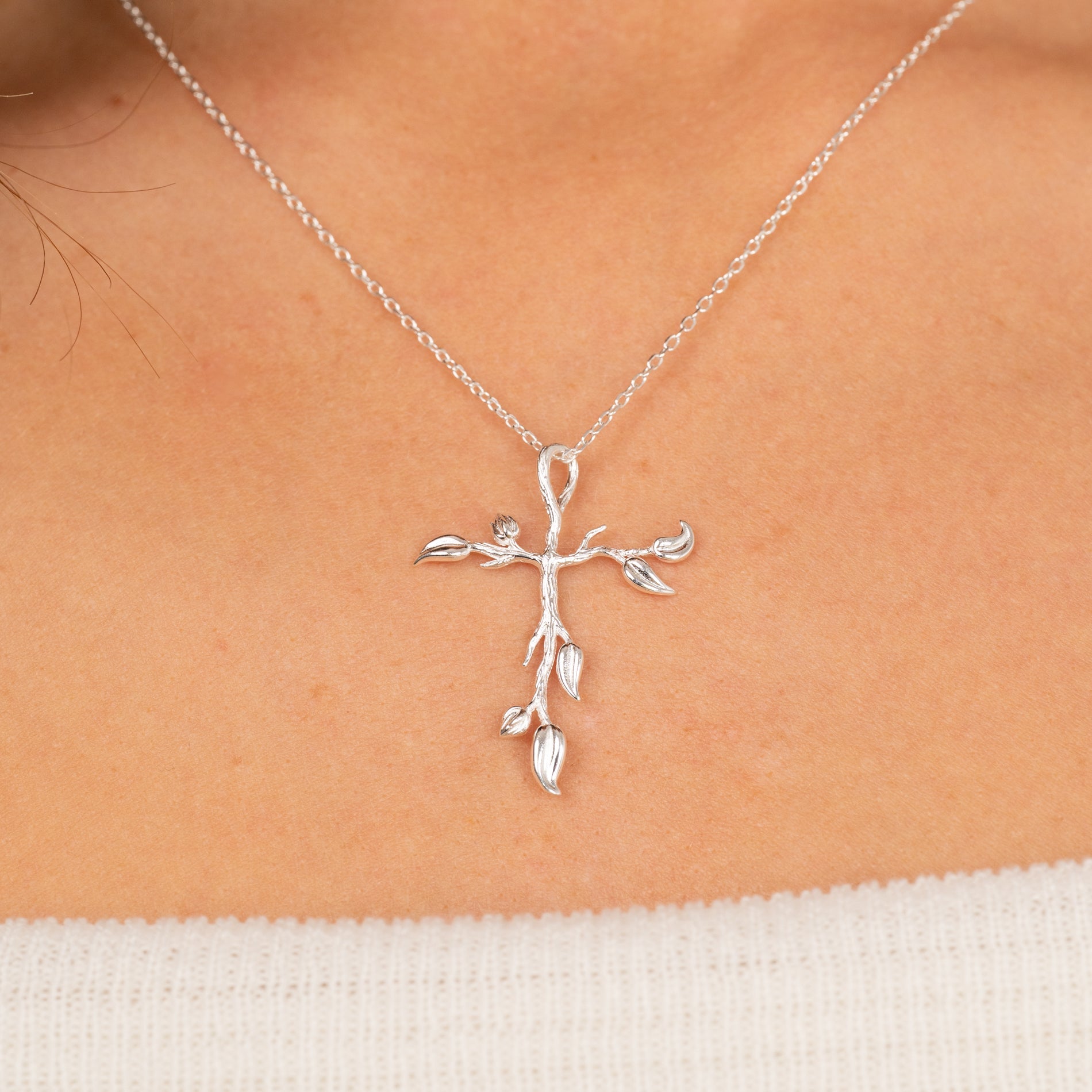 Cross pendant with tree-inspired details in 100% recycled 925 sterling silver.