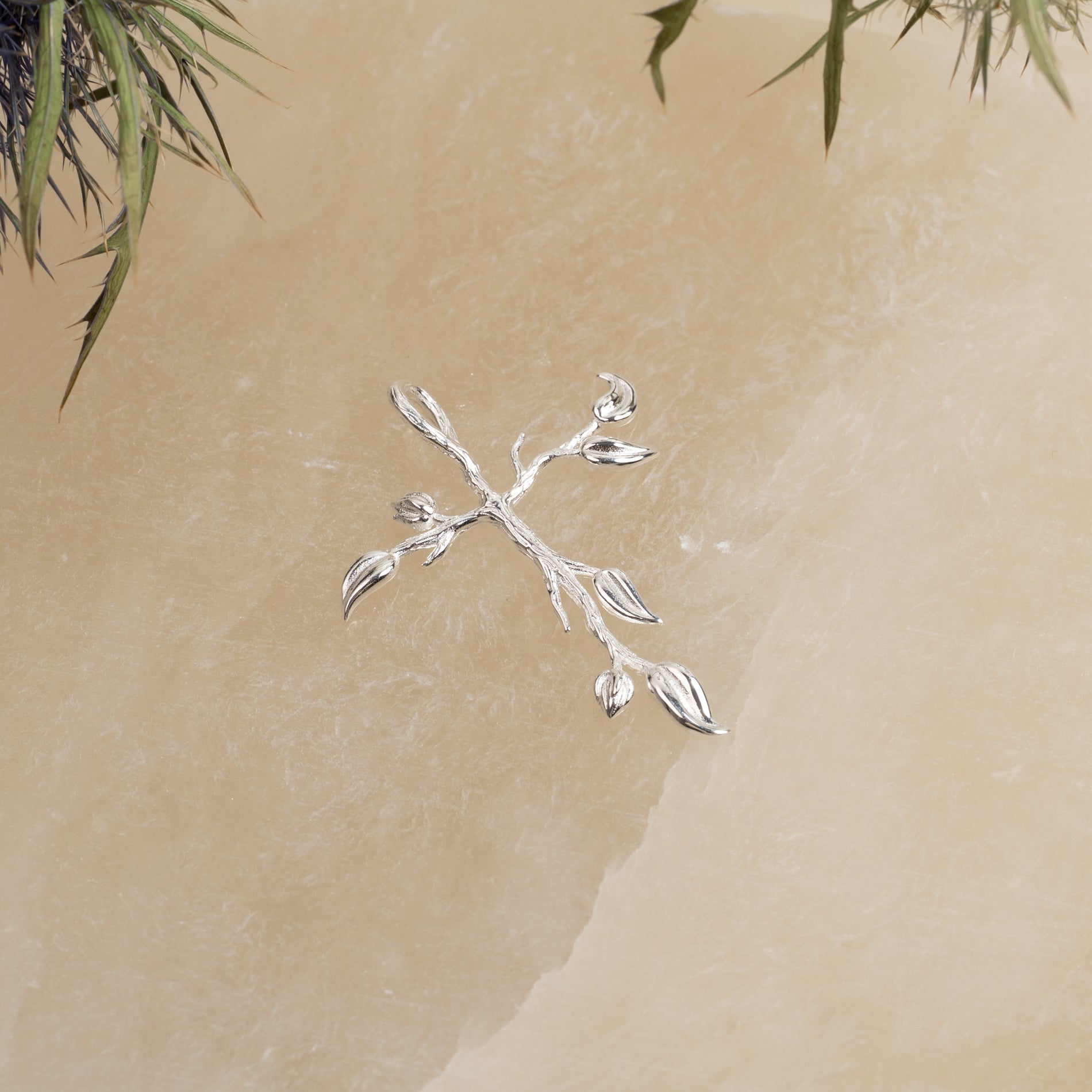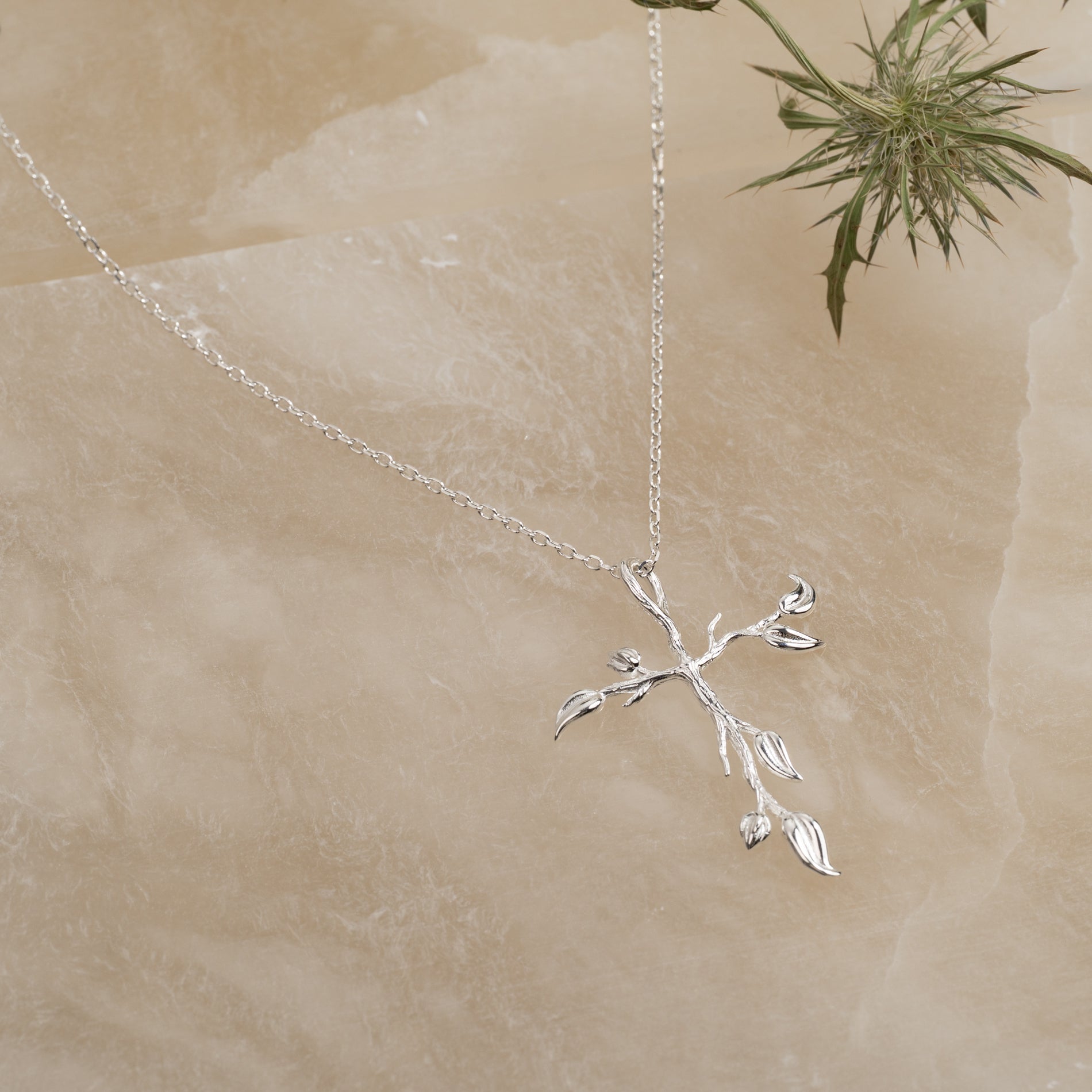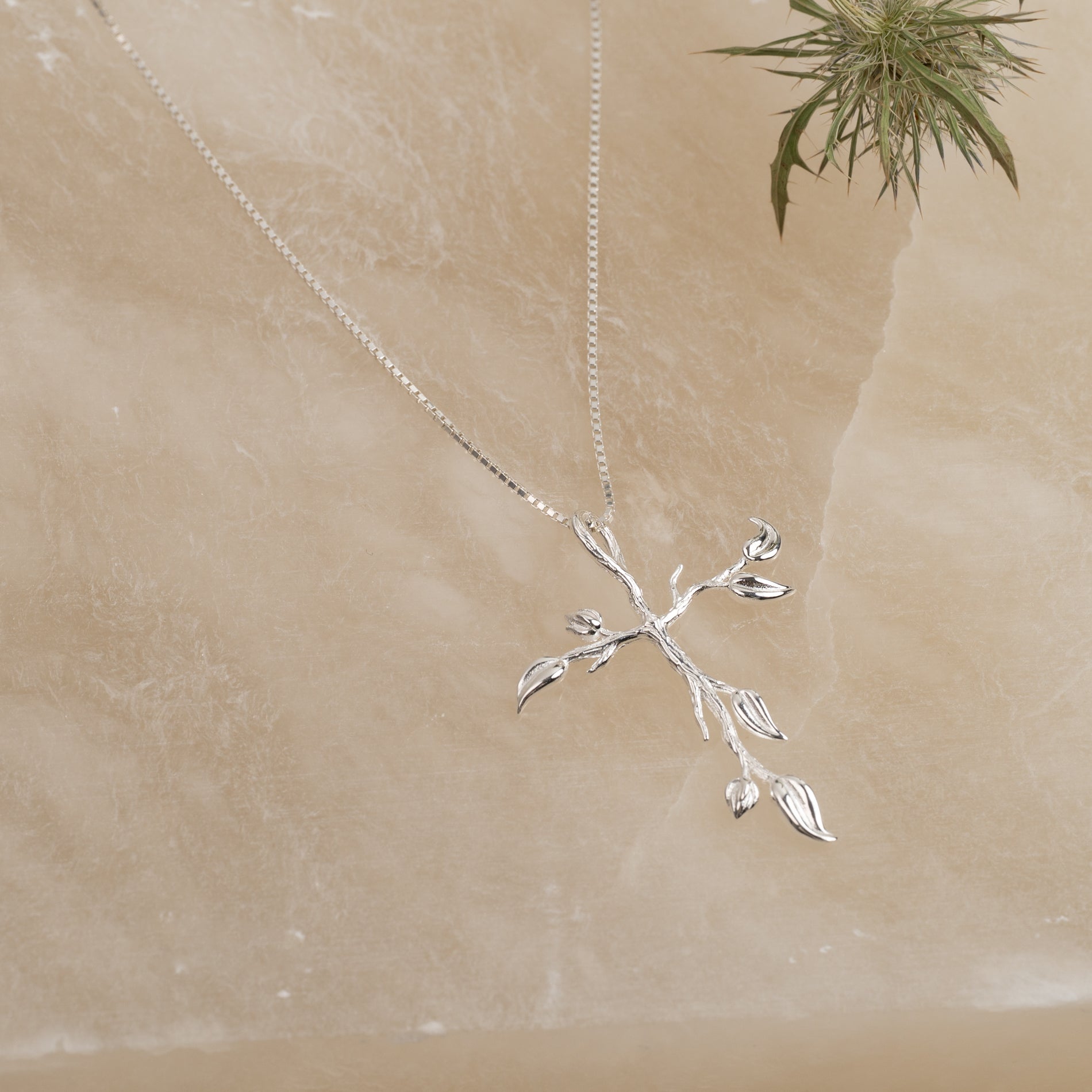 Cross pendant with tree-inspired details in 100% recycled 925 sterling silver.