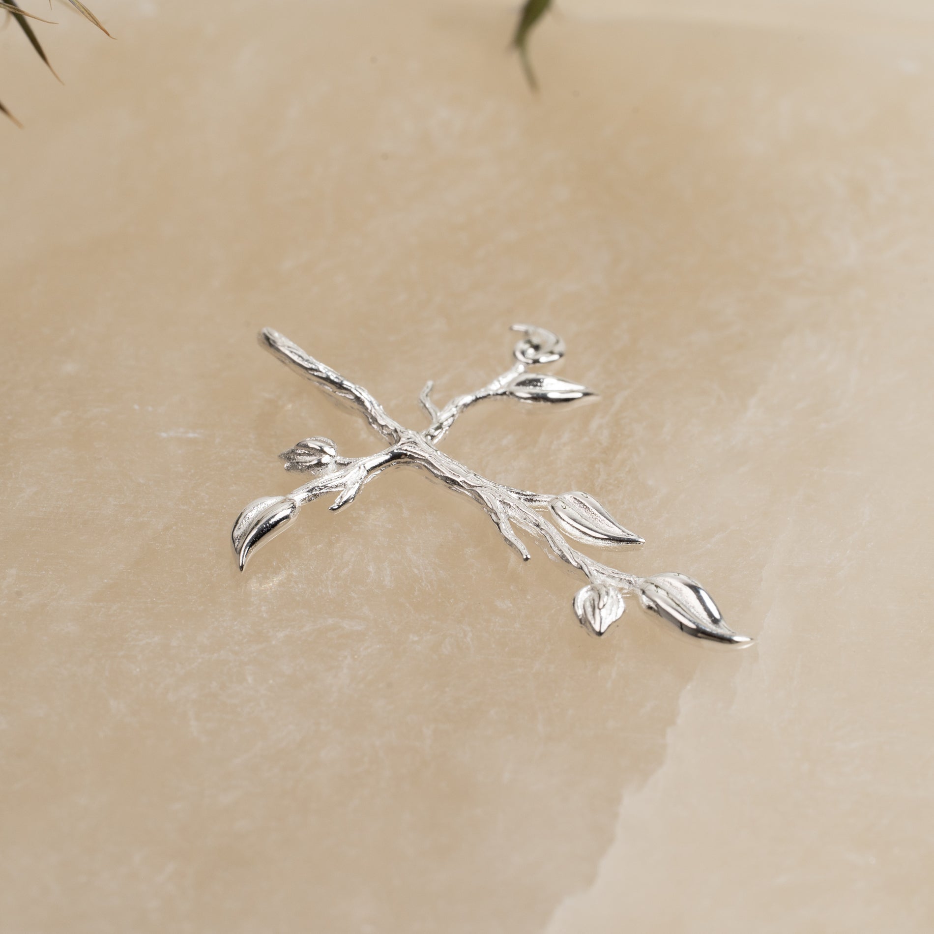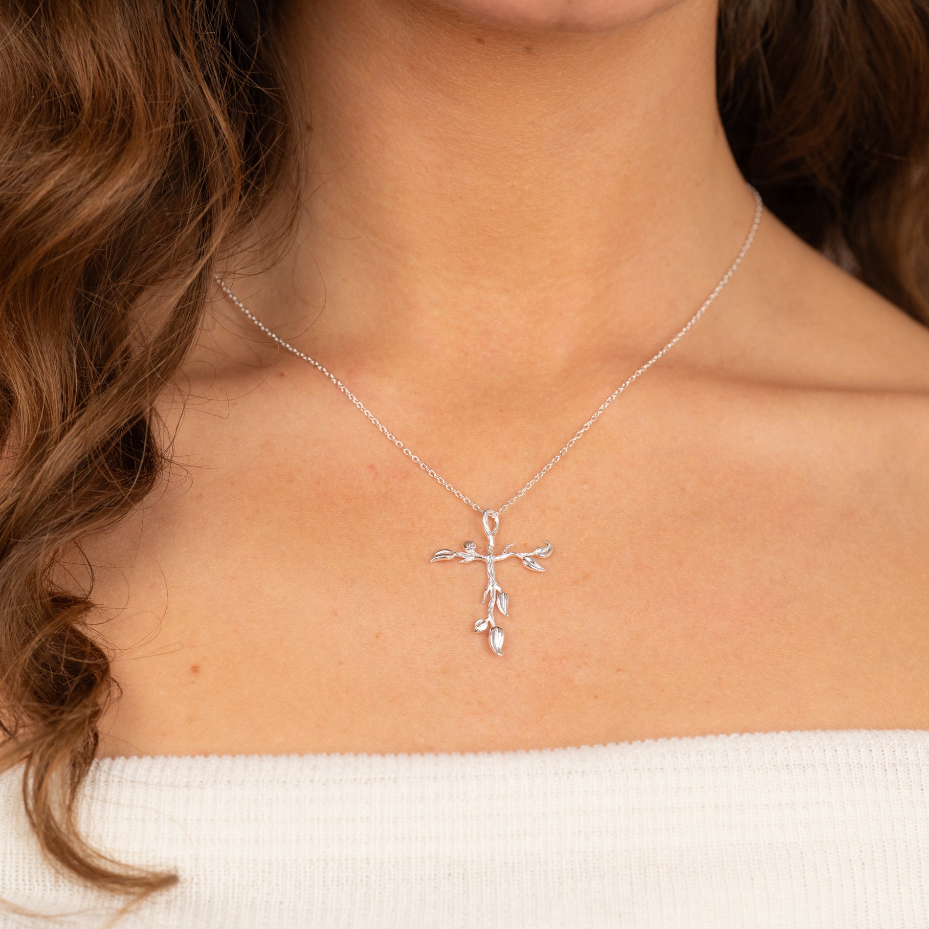 Cross pendant with tree-inspired details in sterling silver