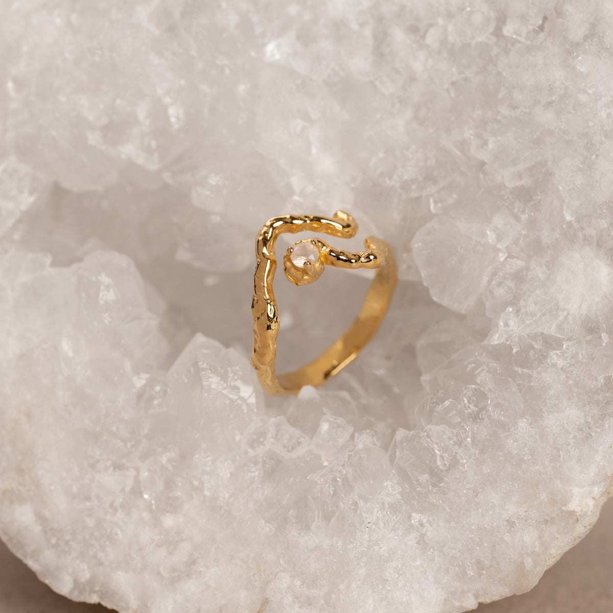 Our Emilia ring is crafted in 100% recycled 18-karat gold-plated sterling silver. The ring is designed with a beautiful moonstone that enhances the ring's overall radiance. Additionally, the ring features a textured surface, adding a raw and intriguing quality to it.