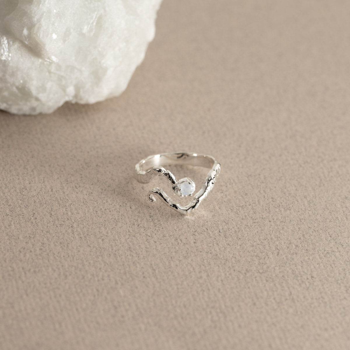 Our Emilia ring is crafted from 100% recycled sterling silver. The ring features a beautiful moonstone that enhances its overall radiance. Additionally, the ring boasts a textured surface, adding a rugged and captivating quality to it.