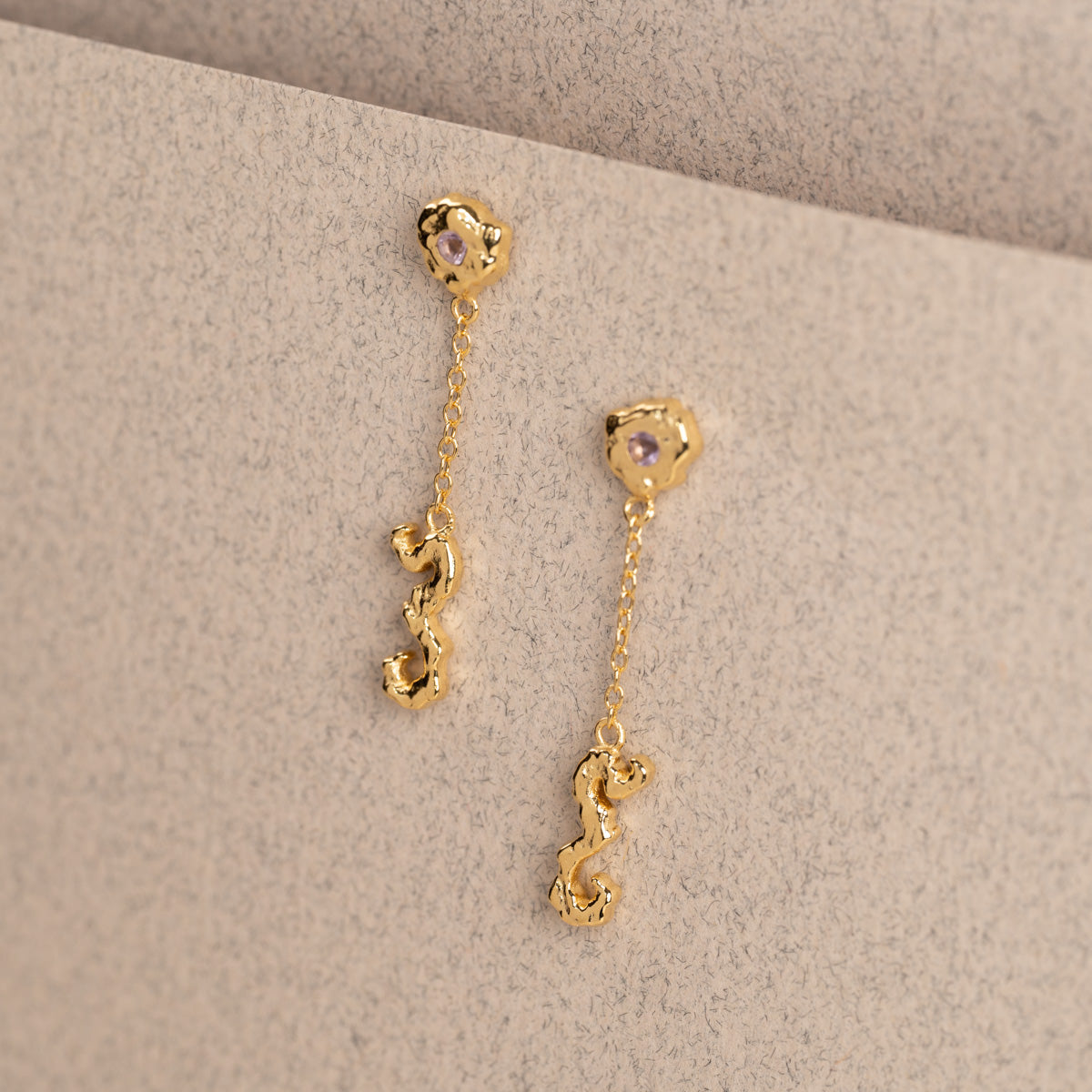 Earrings made from 100% recycled 18-karat gold-plated sterling silver. These incredibly beautiful dangle earrings are designed with an organic and light expression. Each earring features two purple amethyst gemstones, adding an incredibly beautiful detail to the earrings.