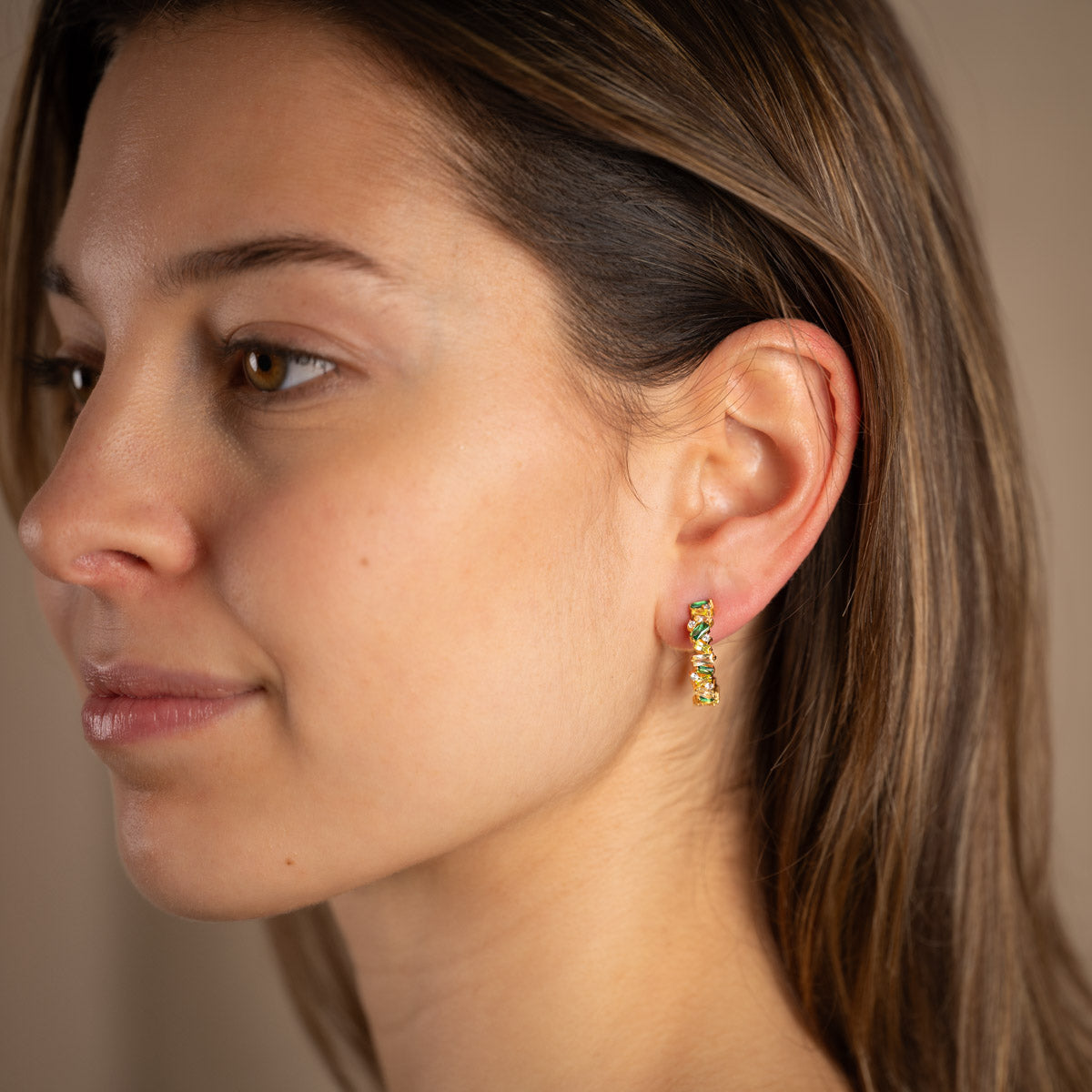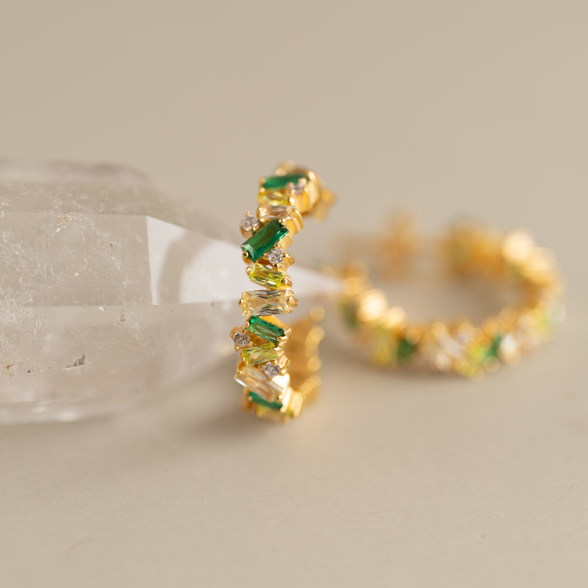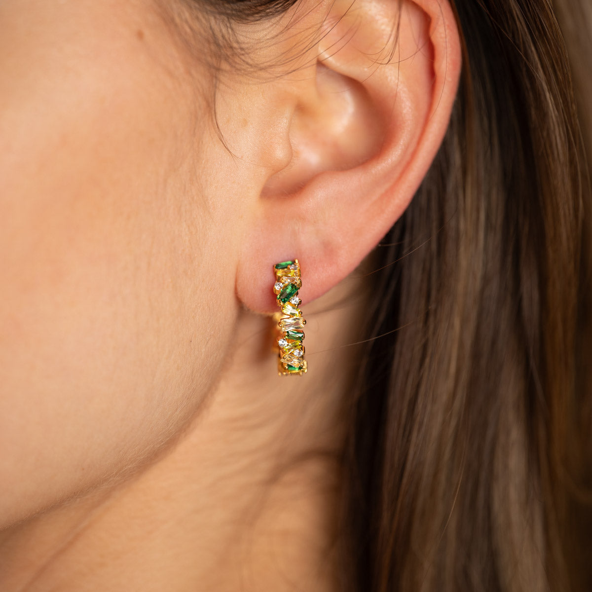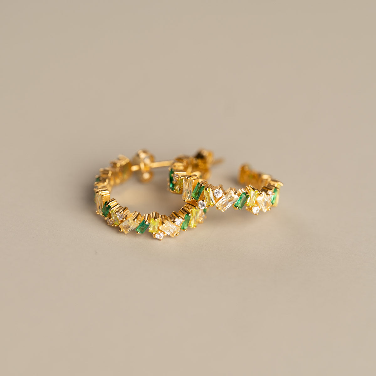 Our Esmeralda earrings are made of 100% recycled 18 karat gold-plated silver, with baguette-cut beautiful zircons in various shades of green, yellow, and white. The earrings have a diameter of 20mm.