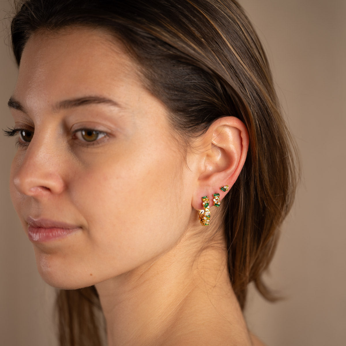 The earrings are also available in a 10.5mm diameter and as studs. Therefore, you can easily mix and match the Esmeralda series if you have multiple ear piercings, but they can also be worn individually.