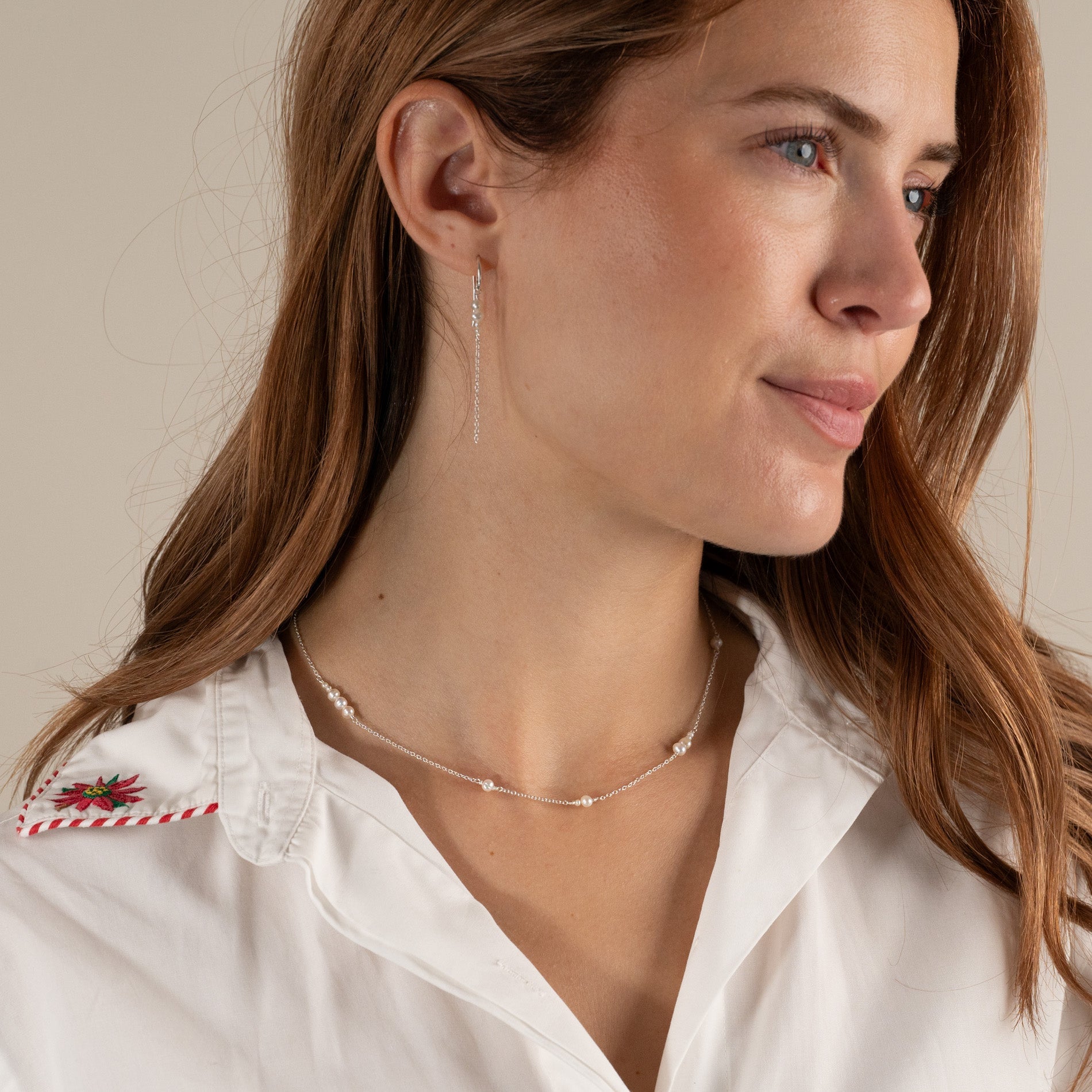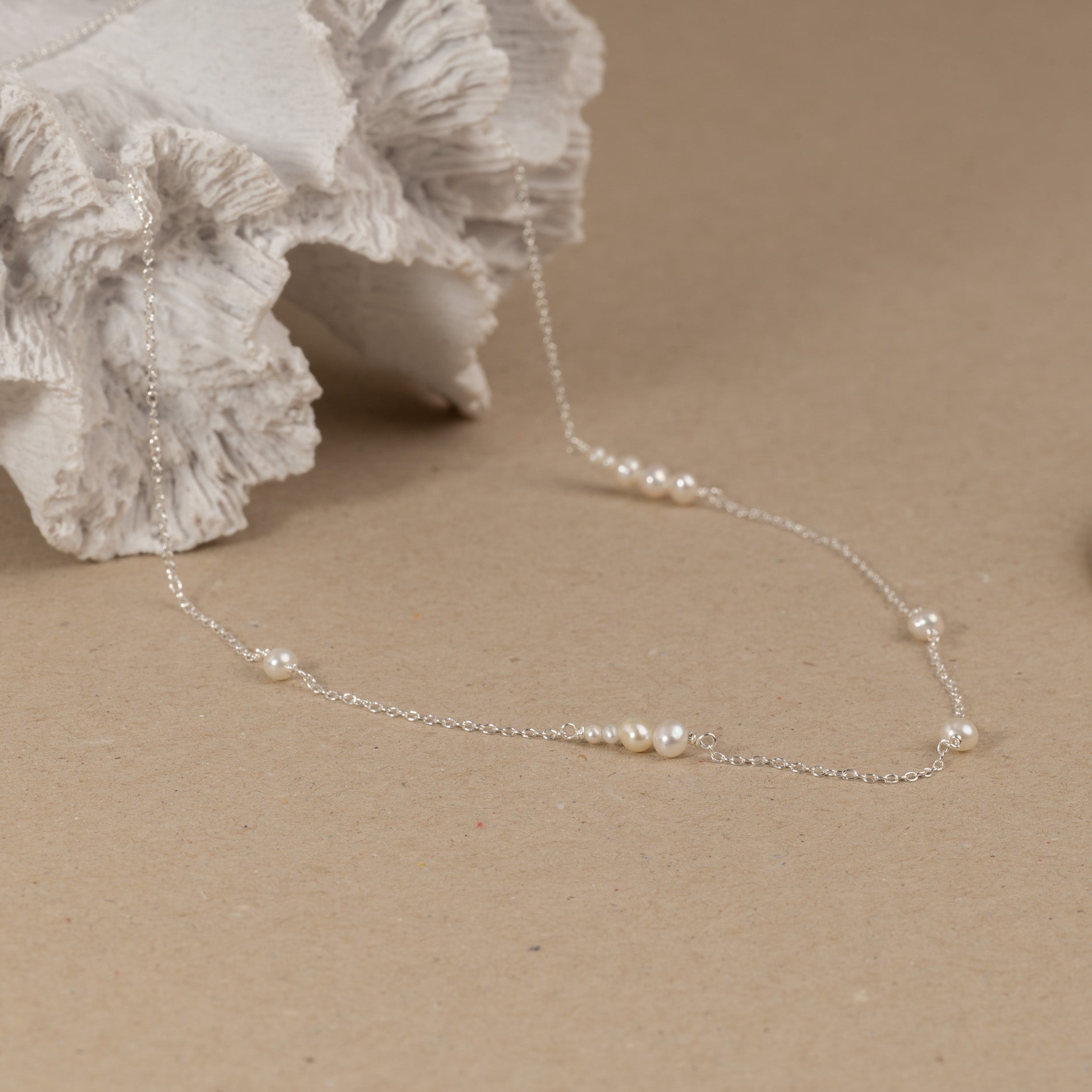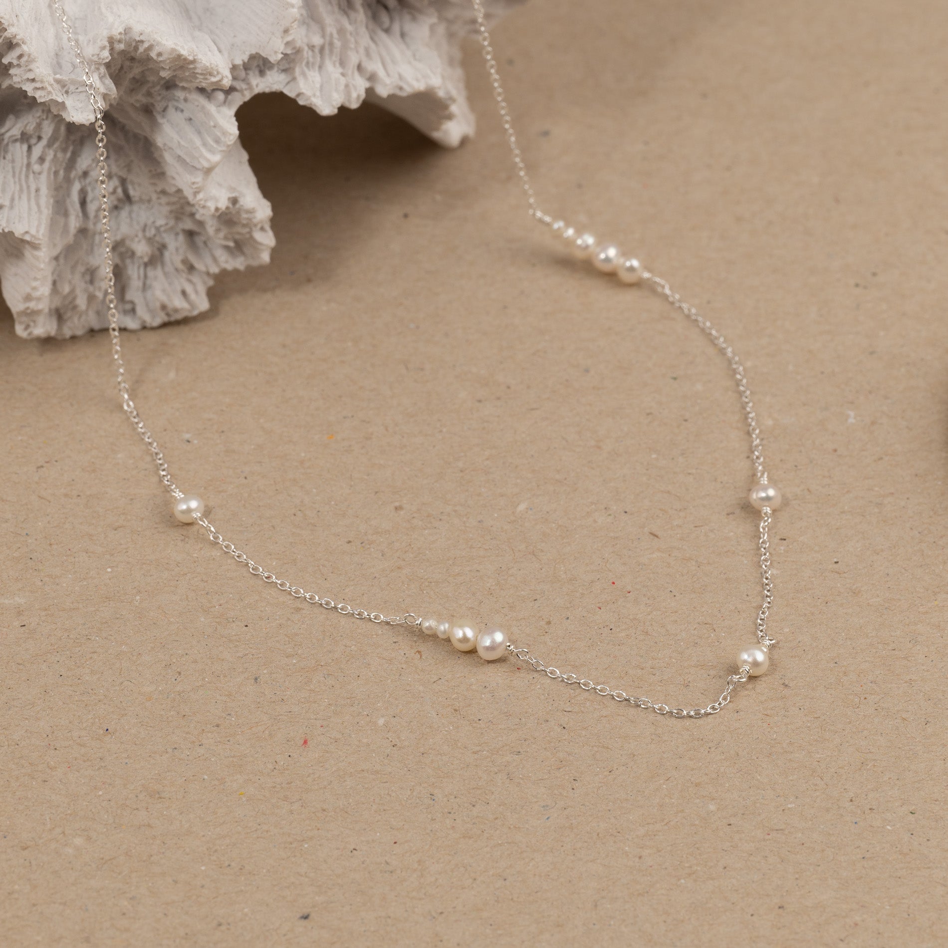 The necklace is made from 100% recycled 925 sterling silver with small oval white freshwater pearls of varying sizes.