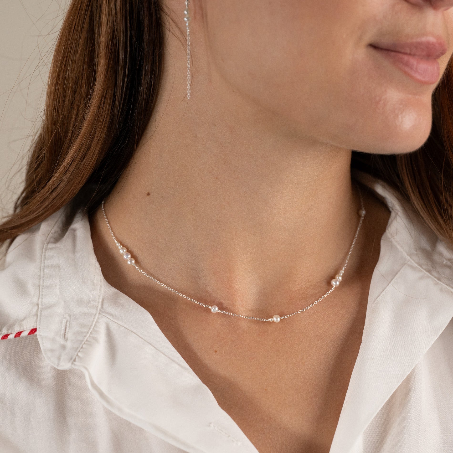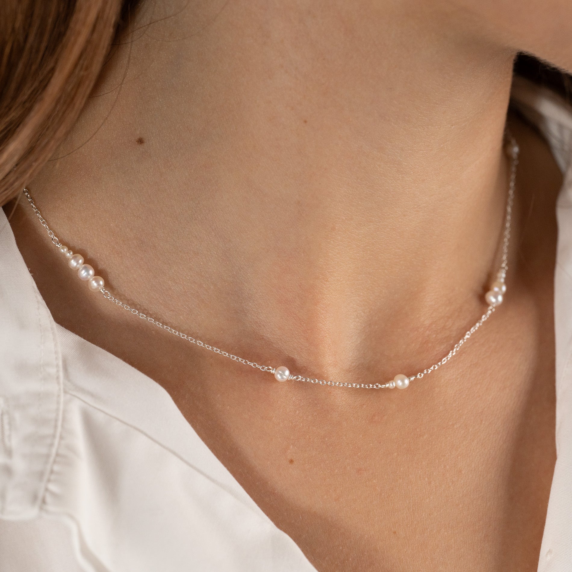 The pearls are asymmetrically distributed on the delicate silver chain in clusters of 1 to 4 pearls. The pearls measure 3.5-4mm in width and approximately 2mm in width.