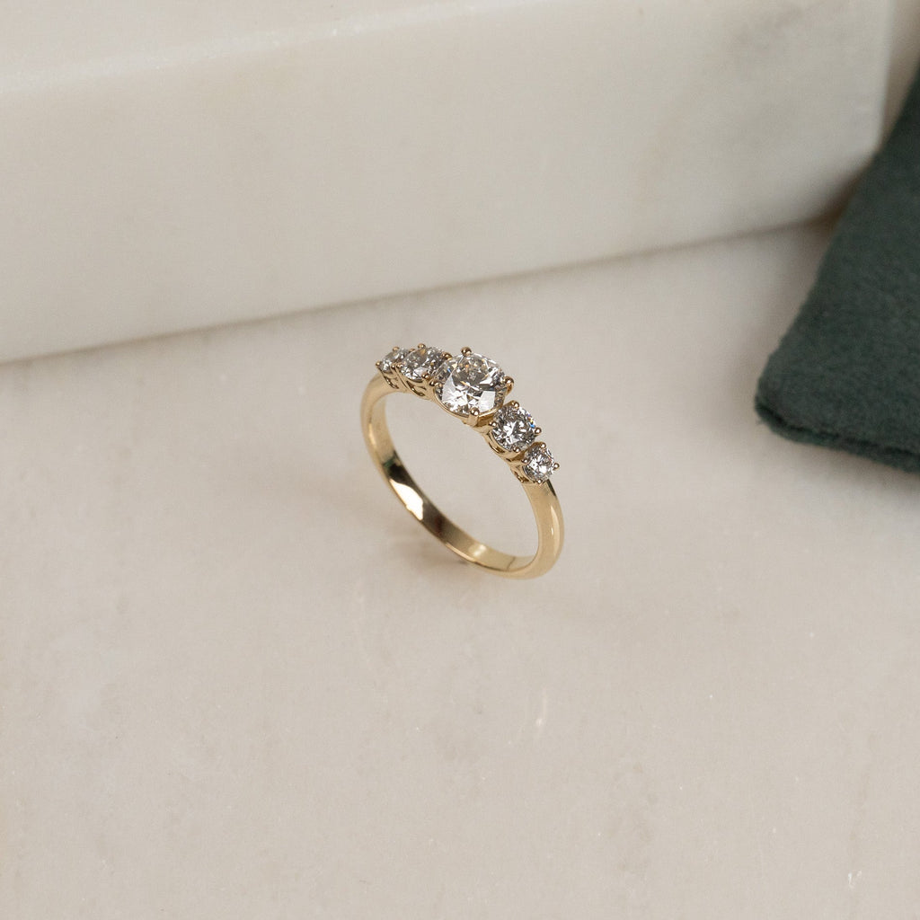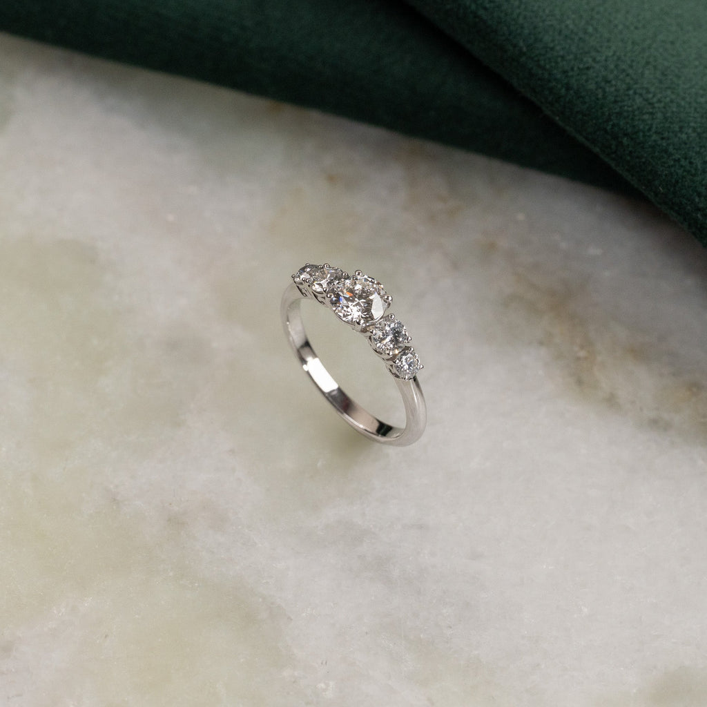 Five lab-grown diamonds are arranged in graduating sizes, set in a beautifully interwoven trellis-style setting that highlights each stone and creates a timeless, romantic expression.