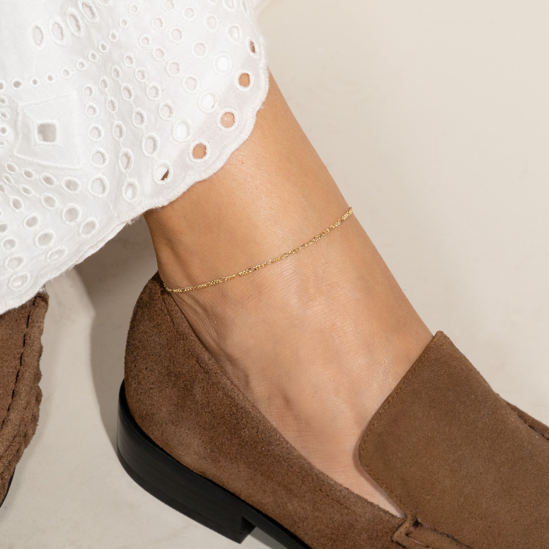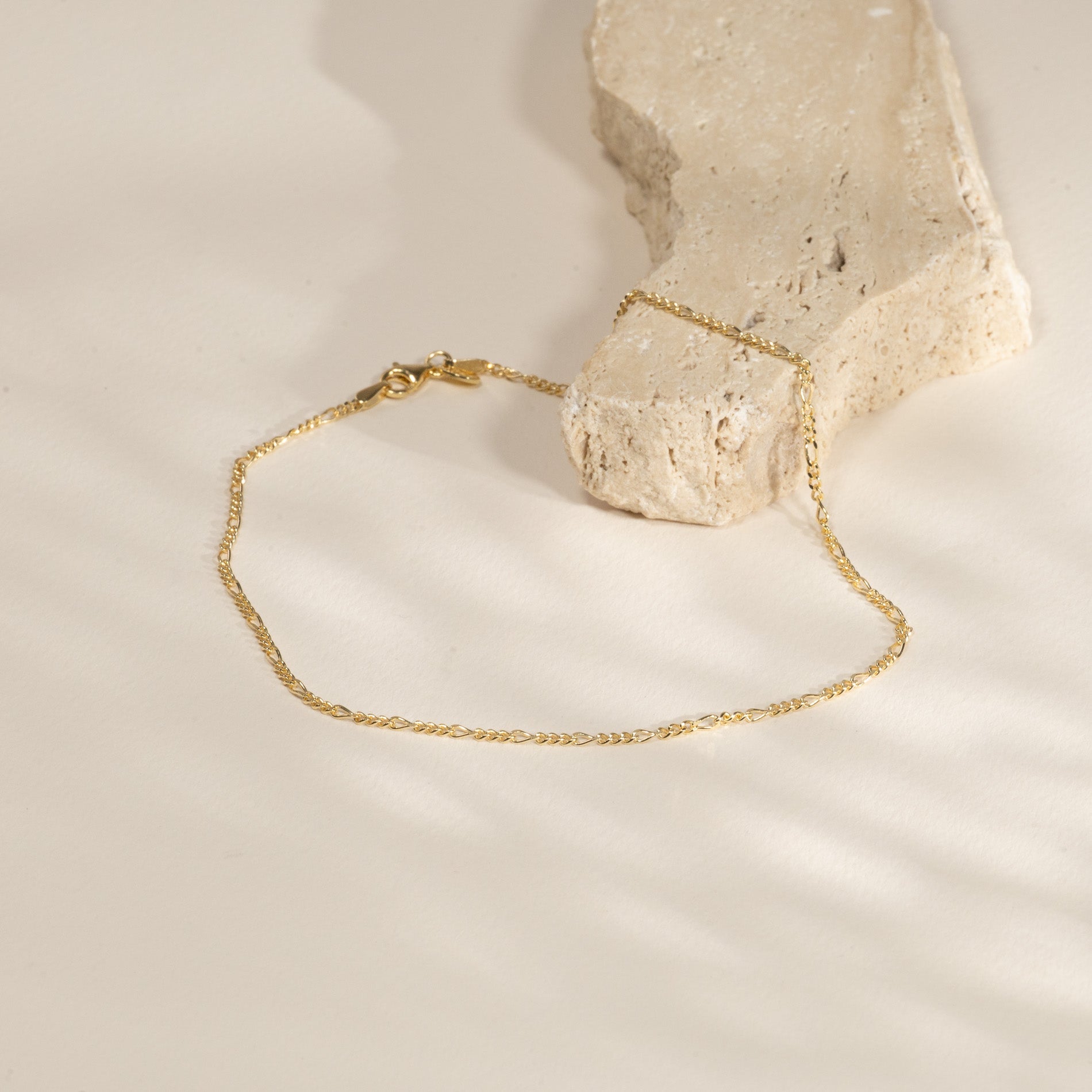 Anklet in 100% recycled 18 karat gold-plated 925 sterling silver with a classic figaro chain design with shifting long and short links, creating a modern and elegant look.