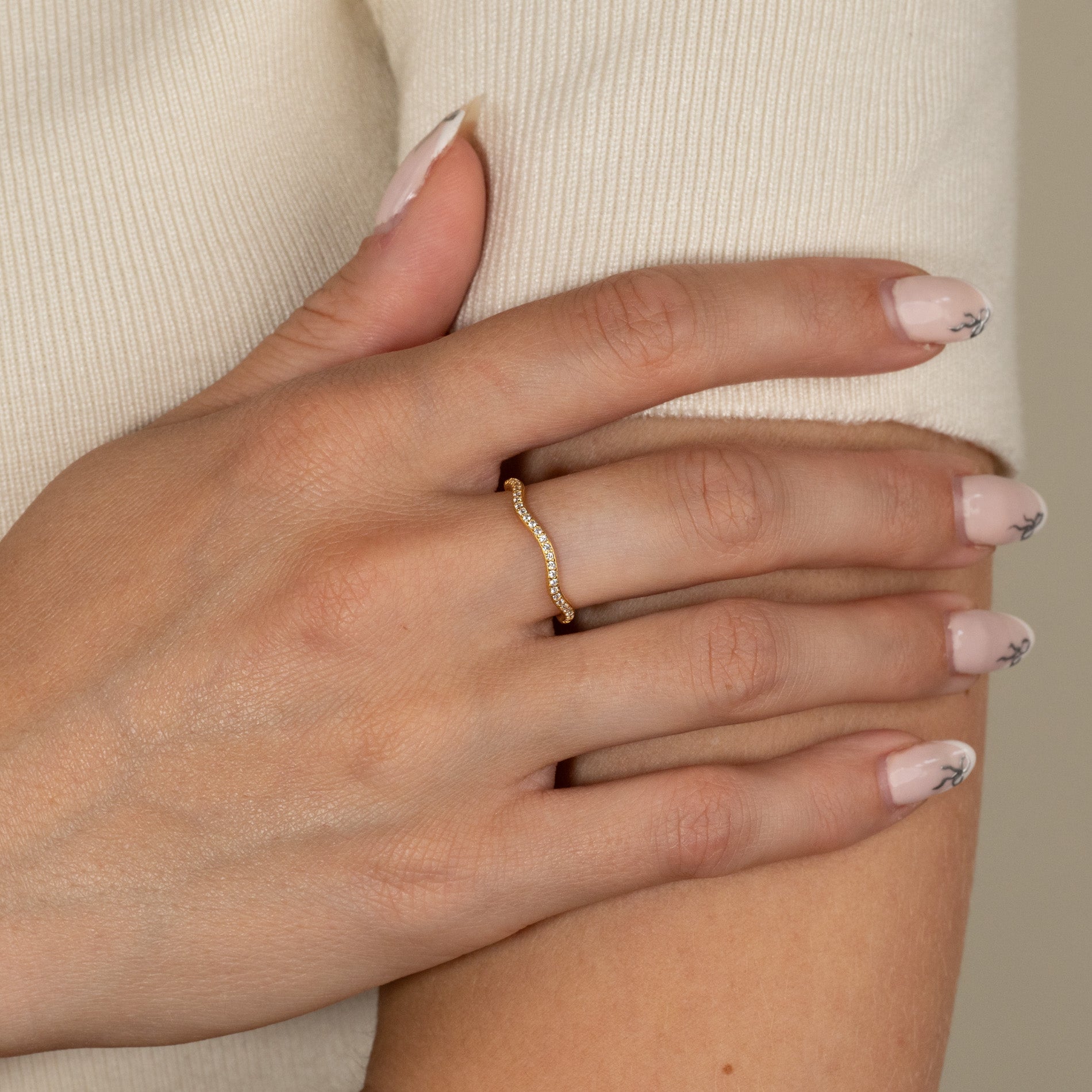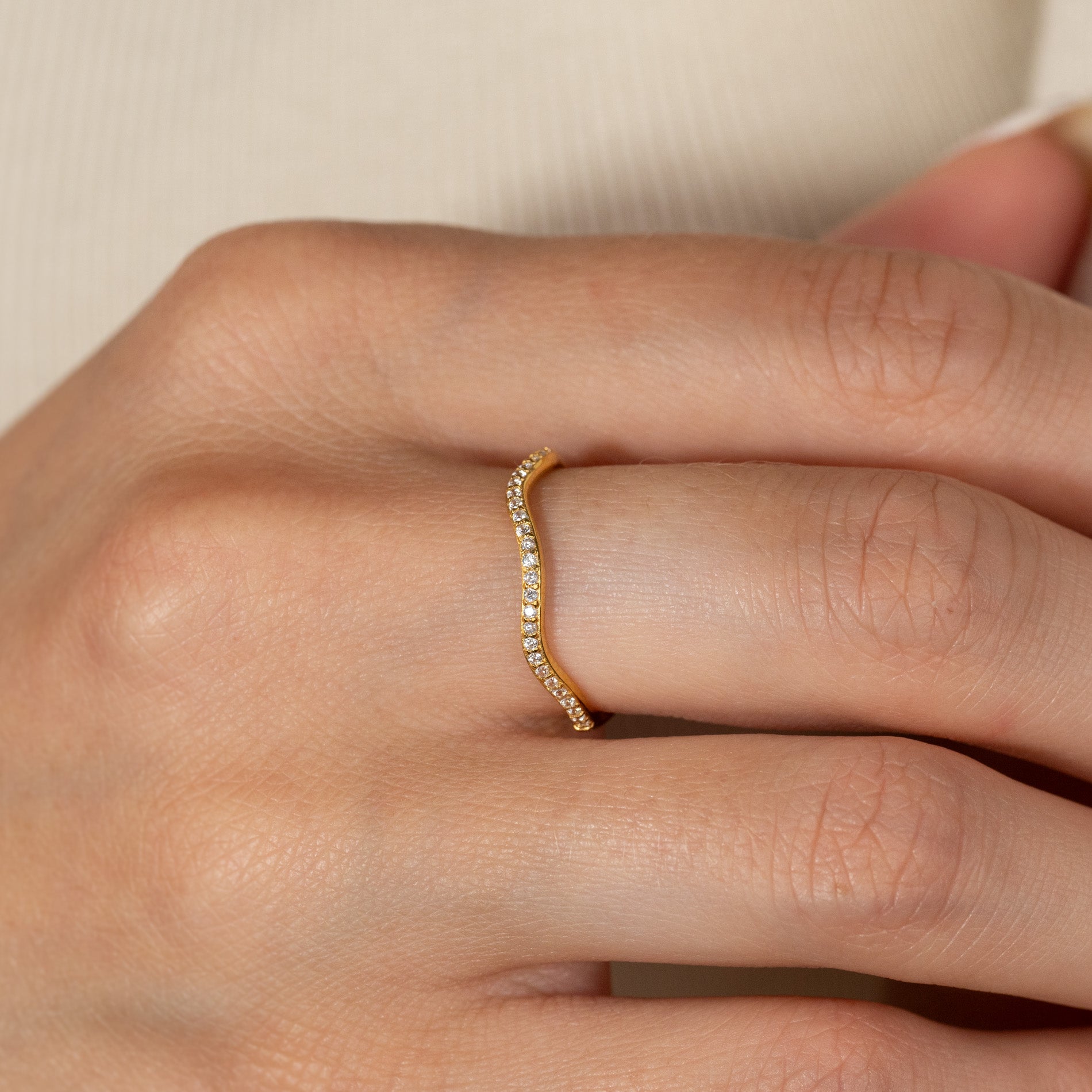 The ring has a gentle wavy shape and a simple design, but it takes on a feminine look with the elegant, clear zirconia stones set along the front, sparkling in the light. The band measures 2.5mm in width.