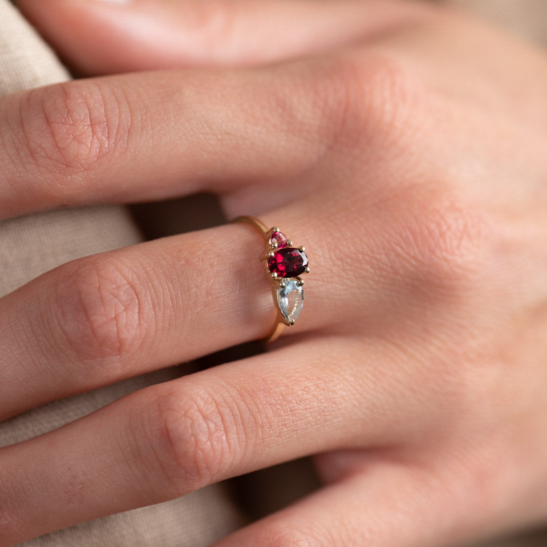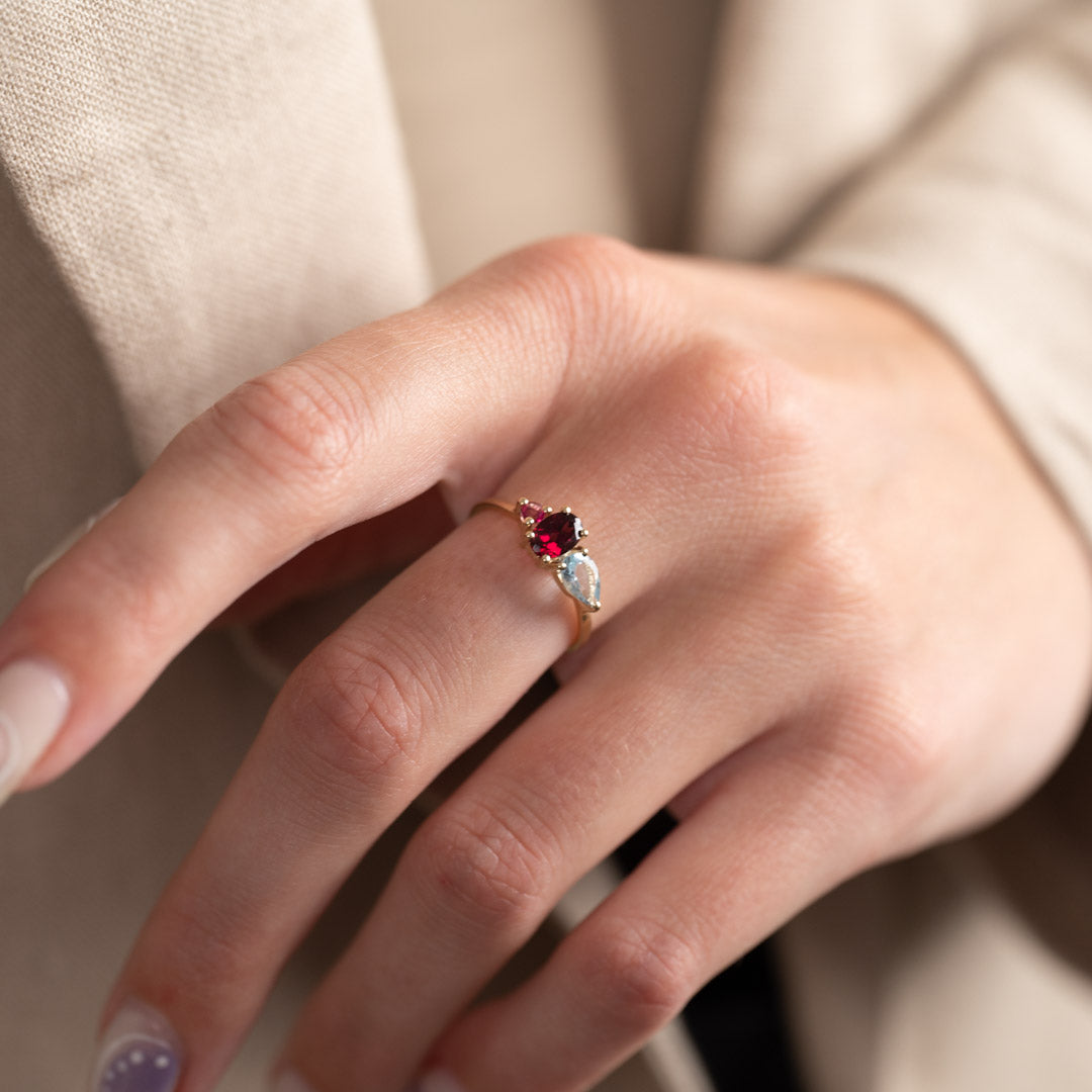 The beautiful semi -precious stones give the ring a beautiful and eye -catching detail. The stones have different shapes, which gives a little edge to the jewelry. The light blue, dark red and pink hue highlights a truly unique design and stands out.