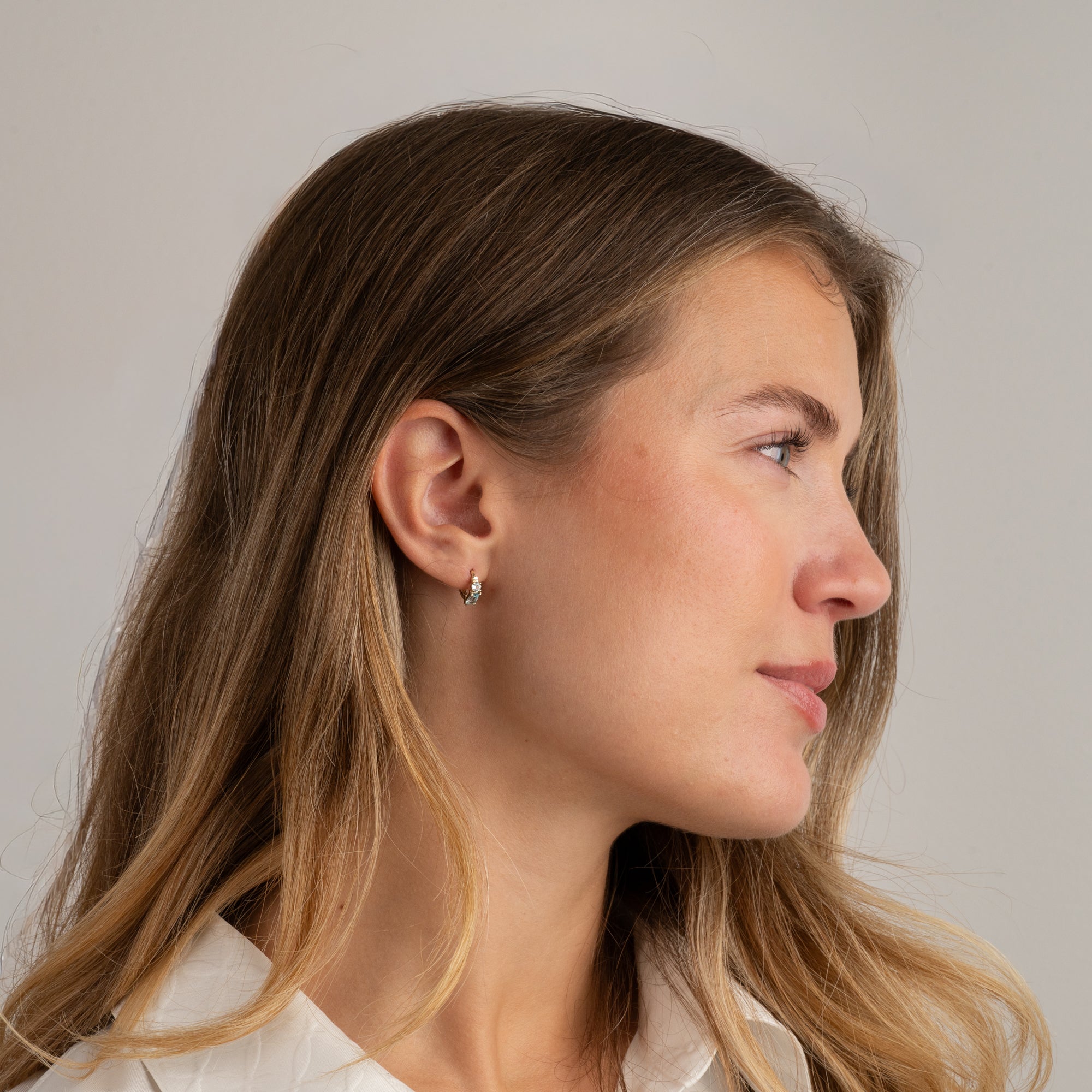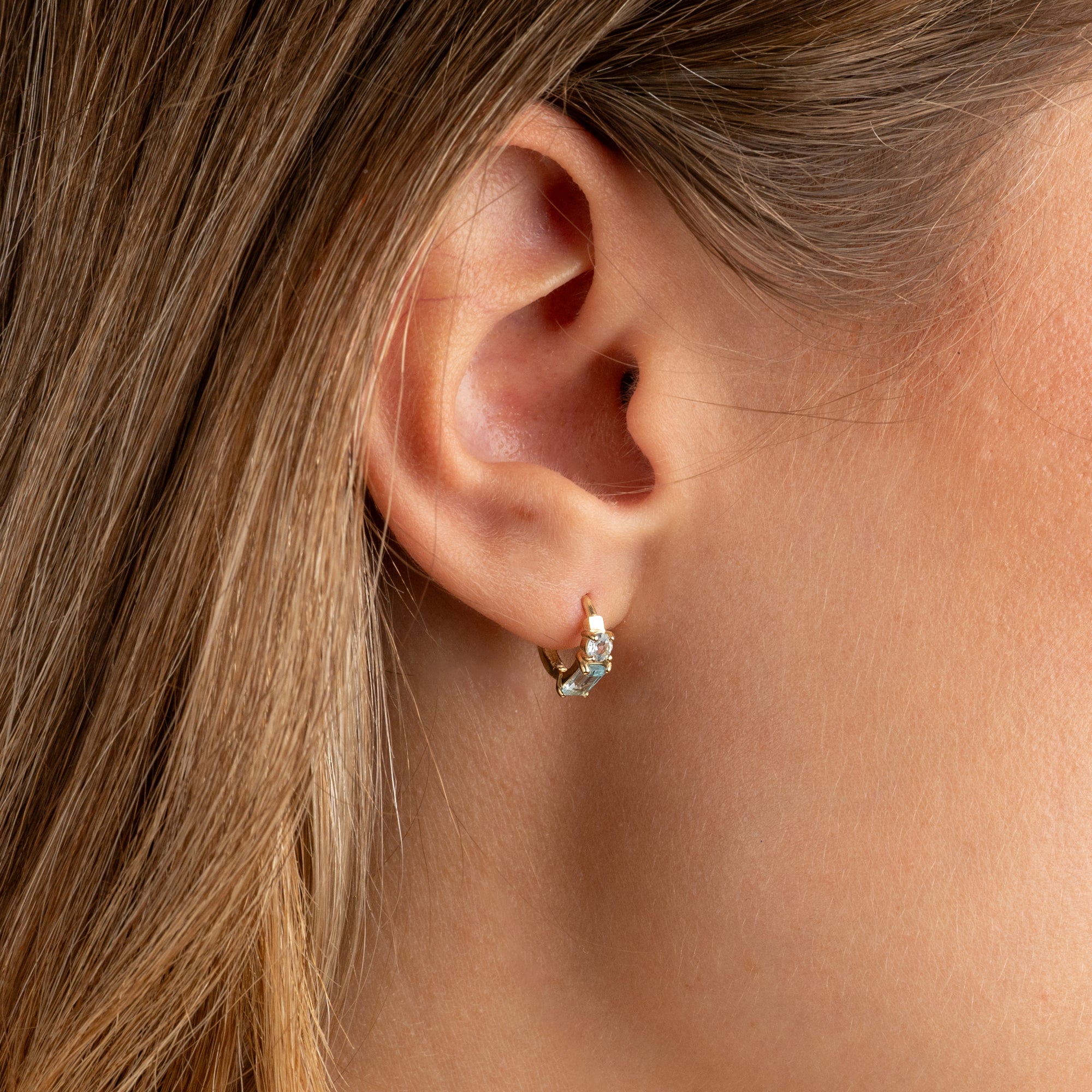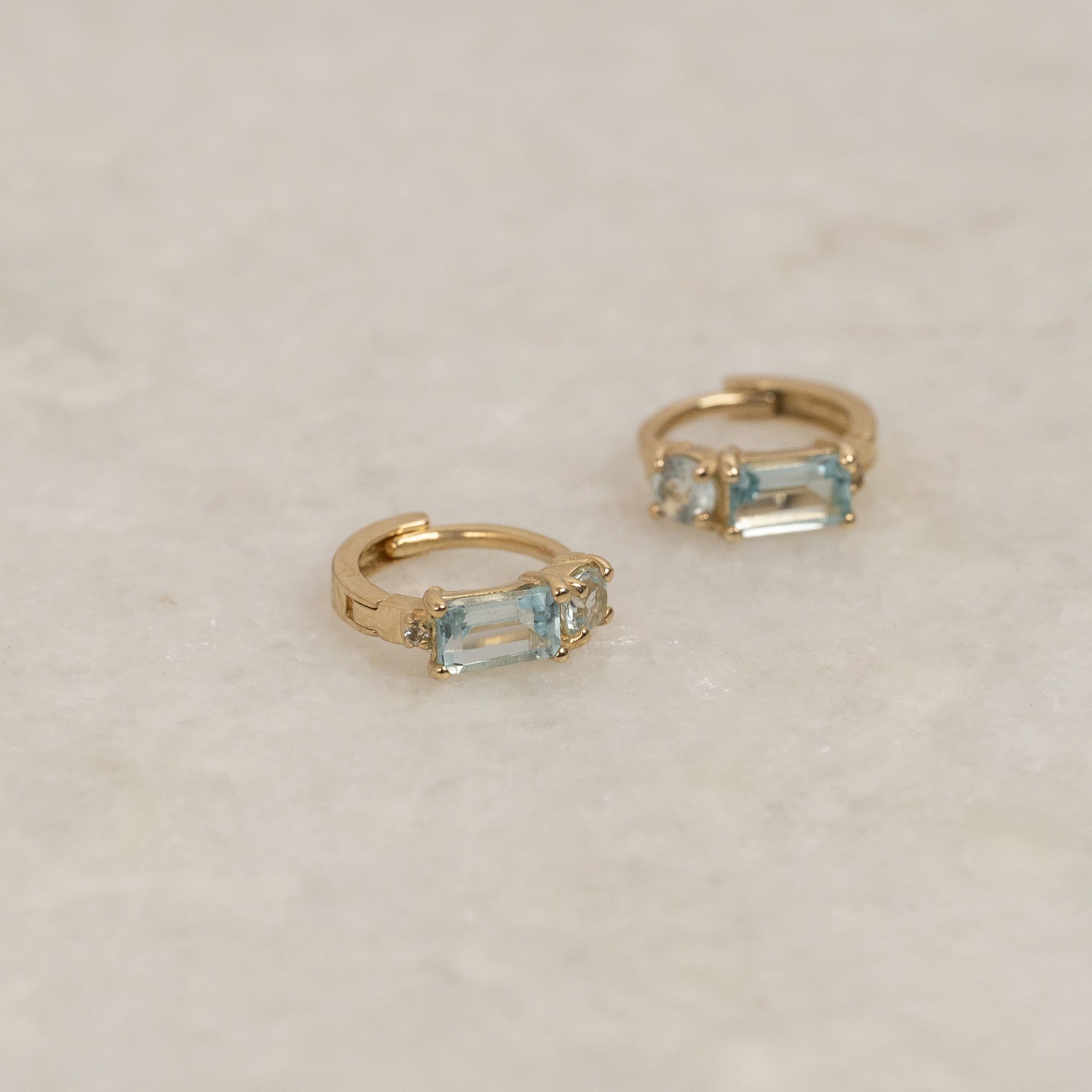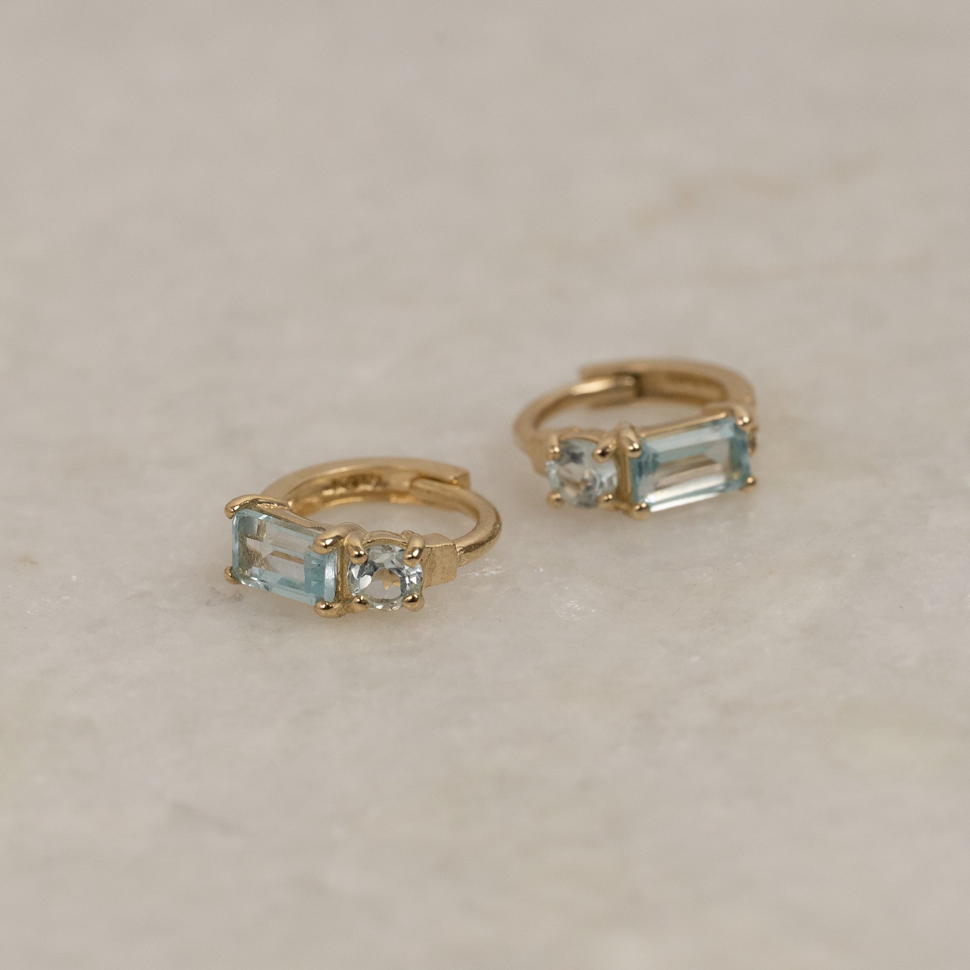 Our gemina earrings are made of 100% recycled 9 karat massive gold with a baguette-lap London Blue Topaz and Round Sky Blue Topaz on each earring. Earrings are made as hinged huggies with click-lock. They have a diameter of 12mm.