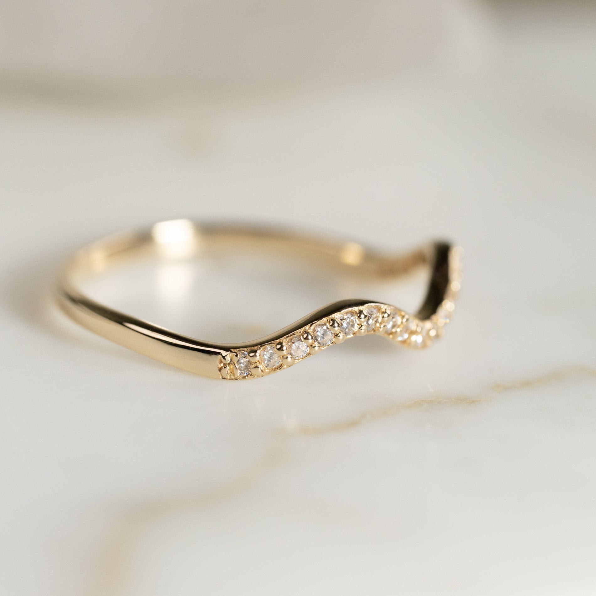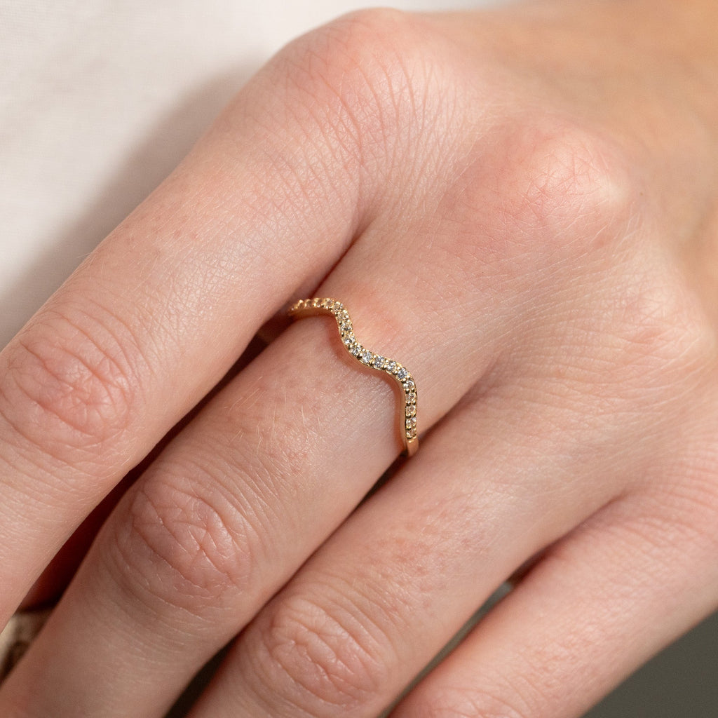 The ring has a slightly wavy ring shape and a simple design that takes on a feminine look with the elegant clear zirconias that sit alone the front and sparkle in the light.